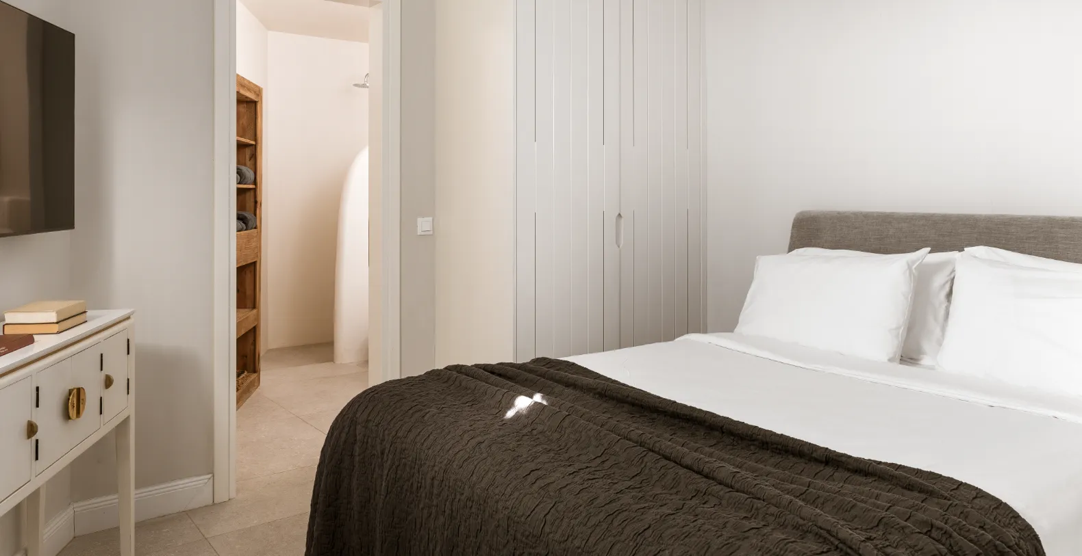 This villa is a luxurious 9-bedroom retreat, perched on Santorini’s sun-drenched cliffs. Designed for privacy, comfort, and style, this three-level villa offers plenty of space and modern design featuring the island’s signature whitewashed charm. The main house features seven beautifully appointed bedrooms, while a separate guesthouse includes two interconnecting bedrooms — one with a queen-size bed and one with a double bed — sharing a bathroom with a rain shower. The guesthouse also includes a cozy living room with air conditioning and a private entrance, perfect for families or groups seeking extra space. The bedrooms in the main house are distributed across different levels. On the upper level, a serene double bedroom offers an ensuite bathroom with a rain shower, closet, and access to a private terrace boasting panoramic sea views. The main level hosts three bedrooms, including the magnificent master suite with a king-size bed, walk-in closet, ensuite bathroom, and direct access to the pool terrace overlooking the Aegean Sea. Three additional bedrooms are located on the lower level, each featuring ensuite bathrooms, air conditioning, and refined finishes that blend comfort with understated luxury.