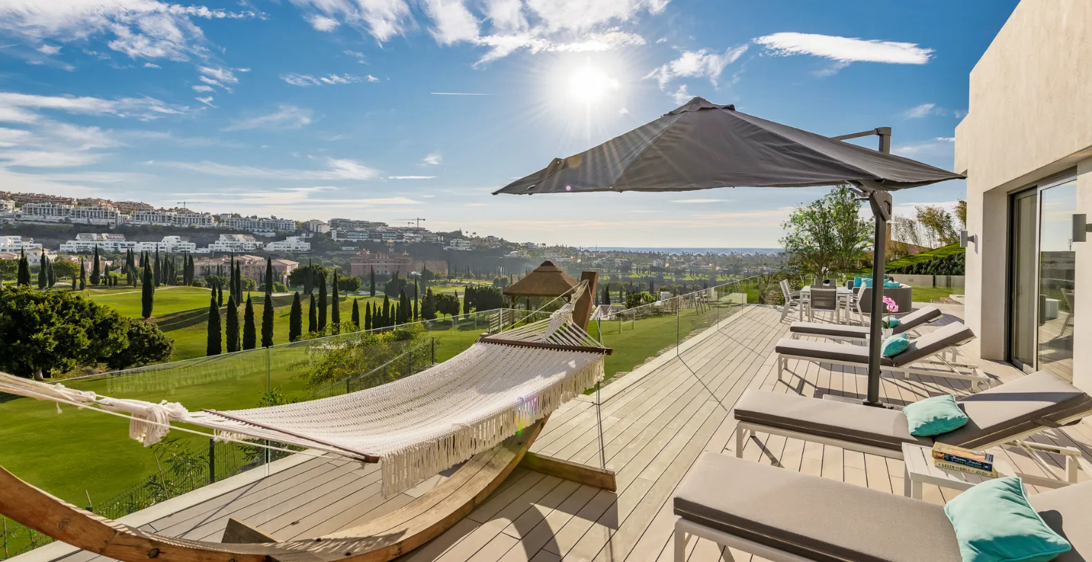Outdoors, Villa Phoenix truly excels. Over 500 m² of terraces and a beautifully manicured 1,200 m² garden create multiple spaces for relaxation and entertaining. A spectacular infinity pool with jacuzzi overlooks the golf course and coastline, while shaded lounge areas and a gazebo invite long, sun-soaked afternoons. Direct access to the golf course makes this property particularly appealing for golf enthusiasts seeking a luxury golf vacation rental in Marbella.