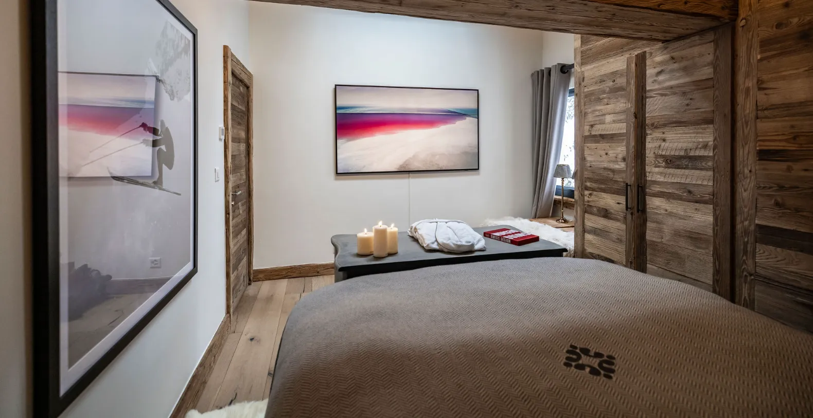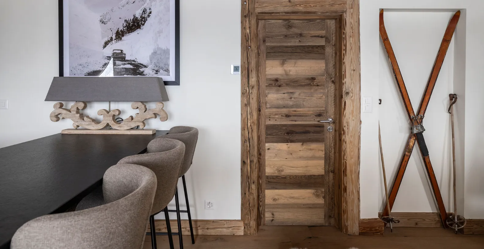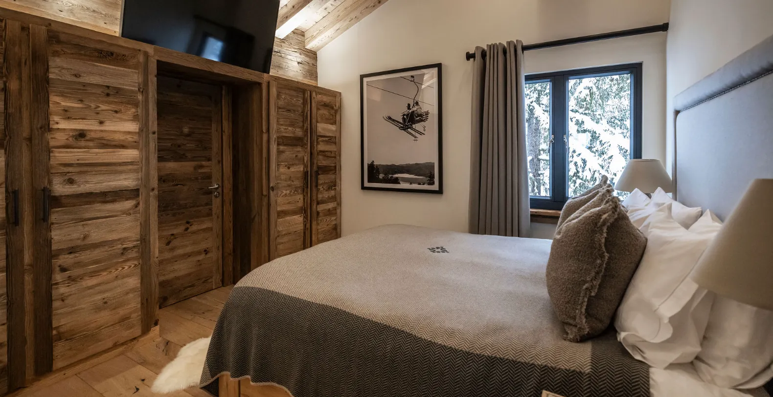Two private balconies enhance the sense of space and connection to the surrounding alpine landscape. One balcony is accessed from the main living and dining area, while the second is accessed directly from the master bedroom. Both offer uninterrupted views across the mountains and valley below, providing a stunning backdrop for morning coffee, afternoon relaxation, or quiet moments as the light shifts over Verbier’s iconic scenery.