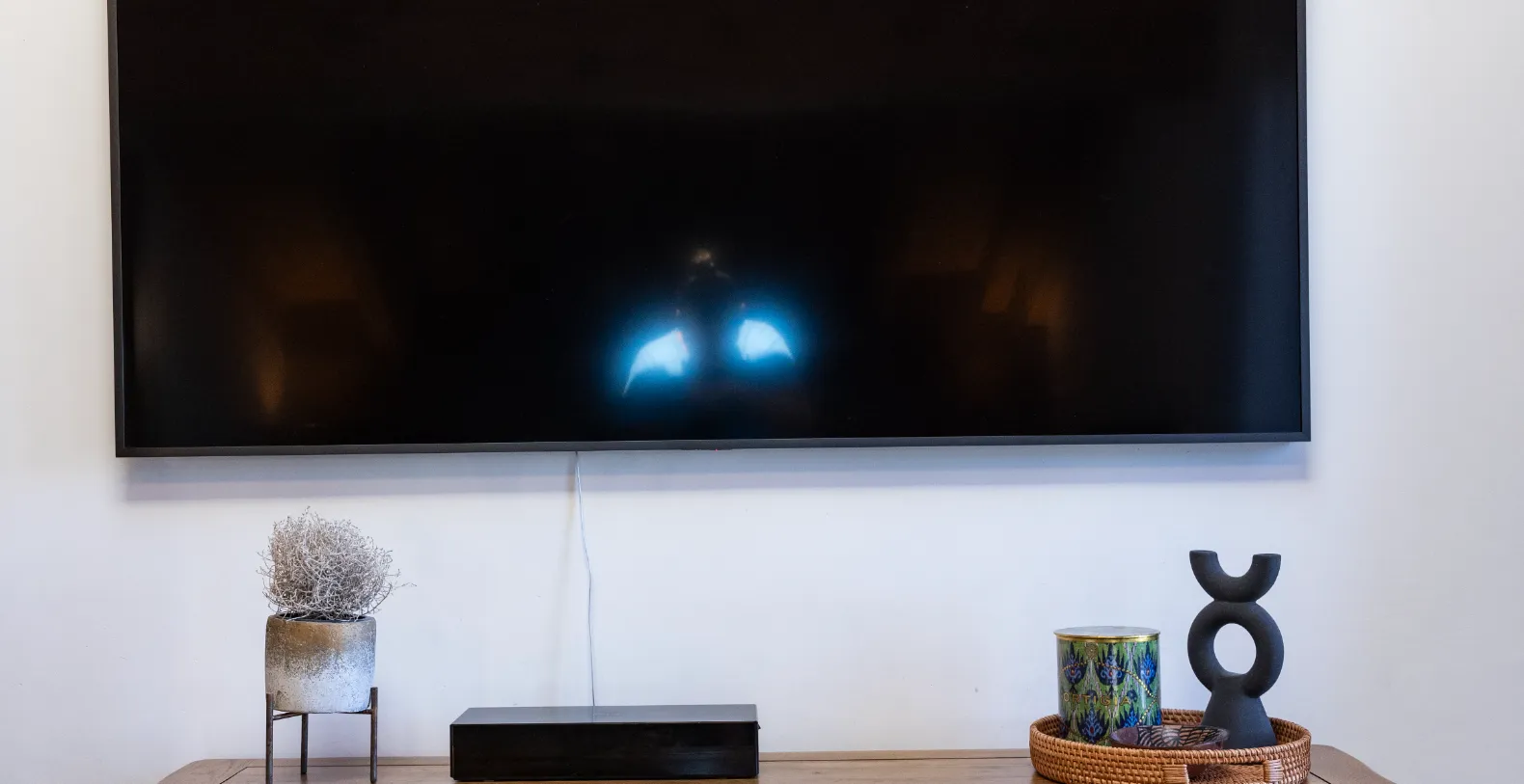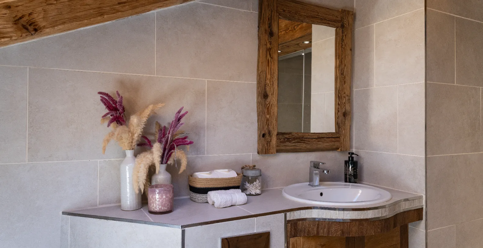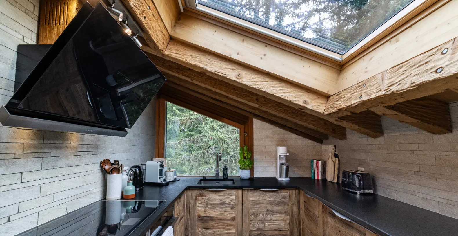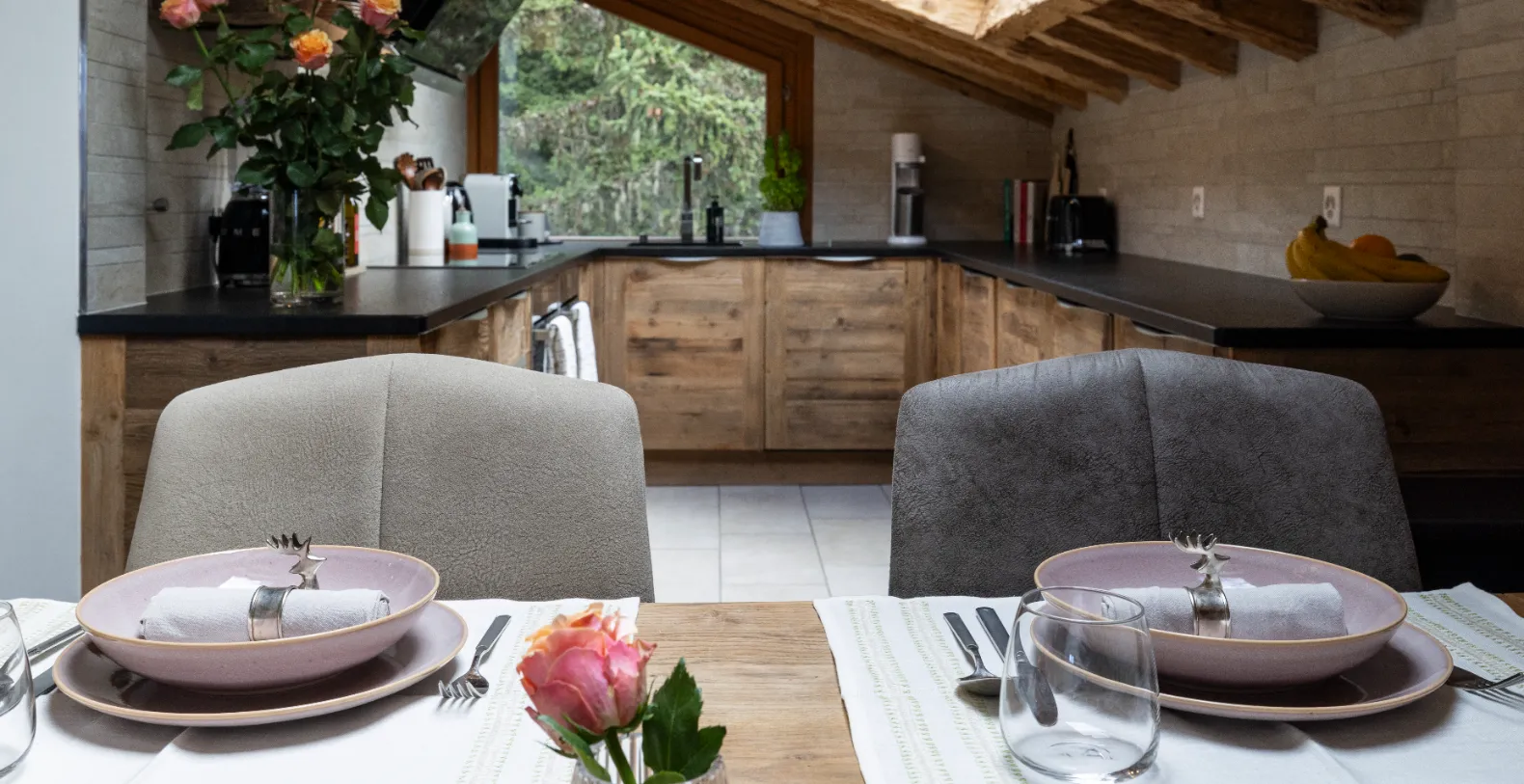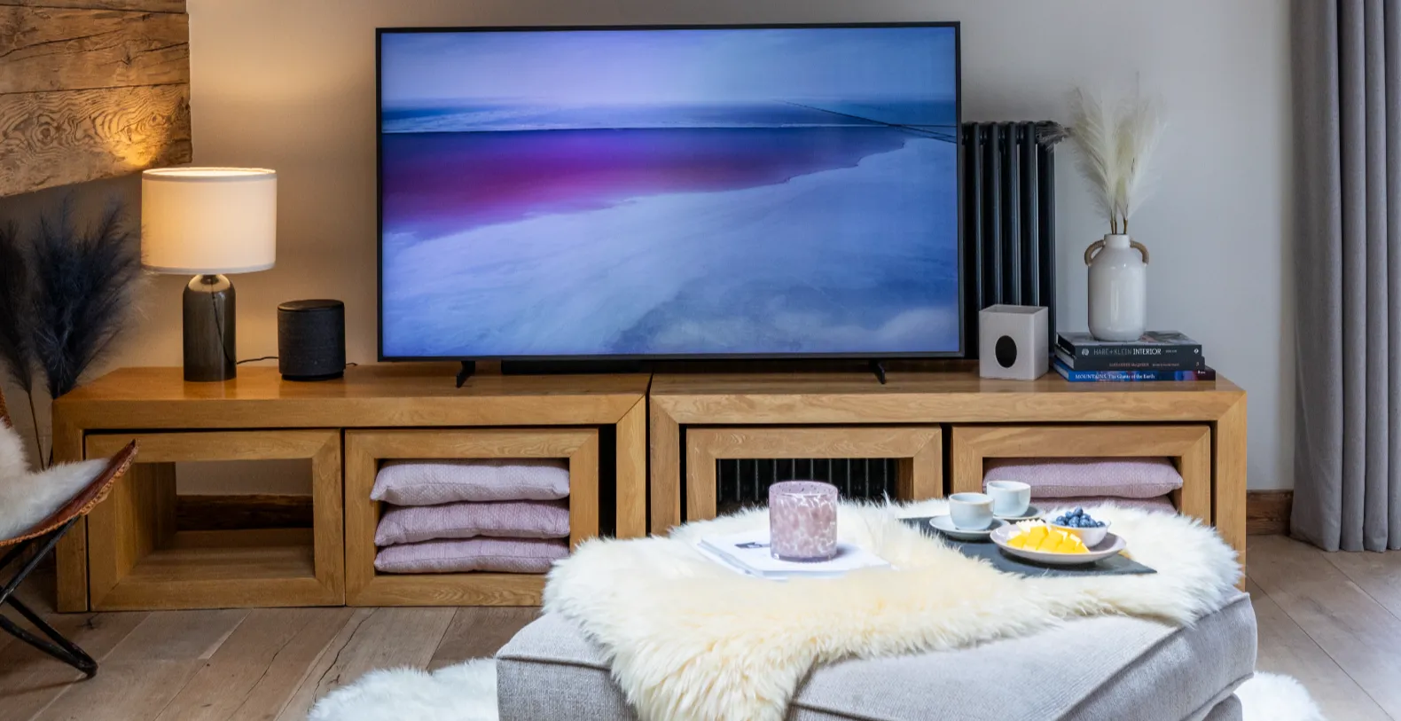 The heart of the apartment is the open-plan living, kitchen, and dining area, where traditional alpine character meets contemporary comfort. Exposed wooden beams, natural timber finishes, and warm tones create a welcoming mountain ambiance, while modern furnishings and thoughtful design details elevate the space. The fully equipped kitchen is ideal for preparing relaxed meals at home, and the dining area comfortably seats six guests. Adjacent to this, the living room features two generous sofas and a large television, providing the perfect setting to unwind after a day on the slopes or enjoy quiet evenings indoors.