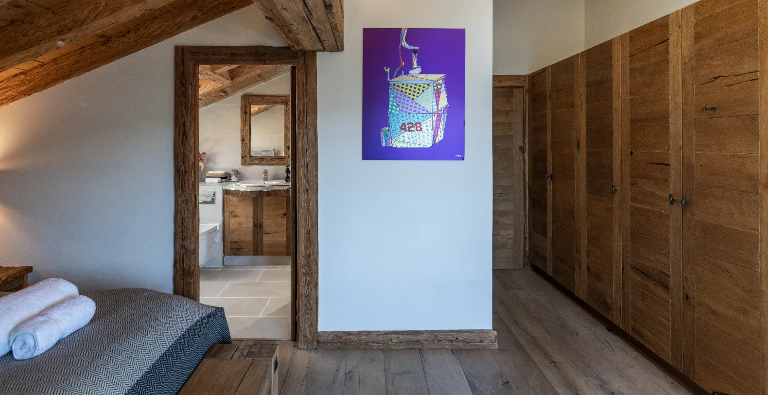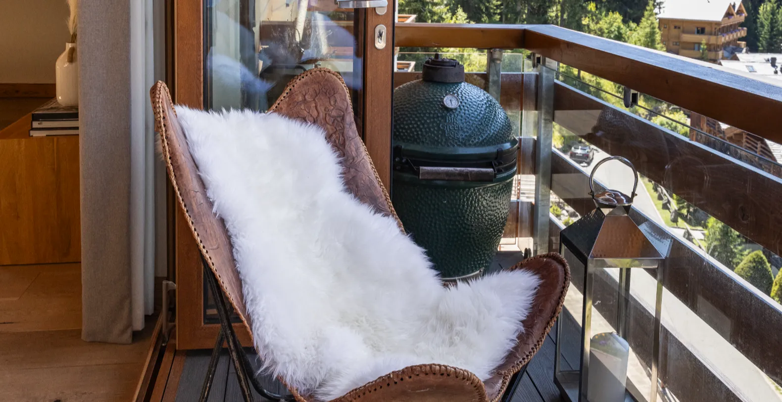 Large windows and dual access points lead out onto the private balcony. From here, guests can take in breathtaking panoramic views across Verbier and the surrounding peaks, whether enjoying morning coffee in the sunshine or relaxing as the light fades over the valley. The elevated position of the apartment enhances the sense of calm while maintaining immediate proximity to the resort’s vibrant center.
