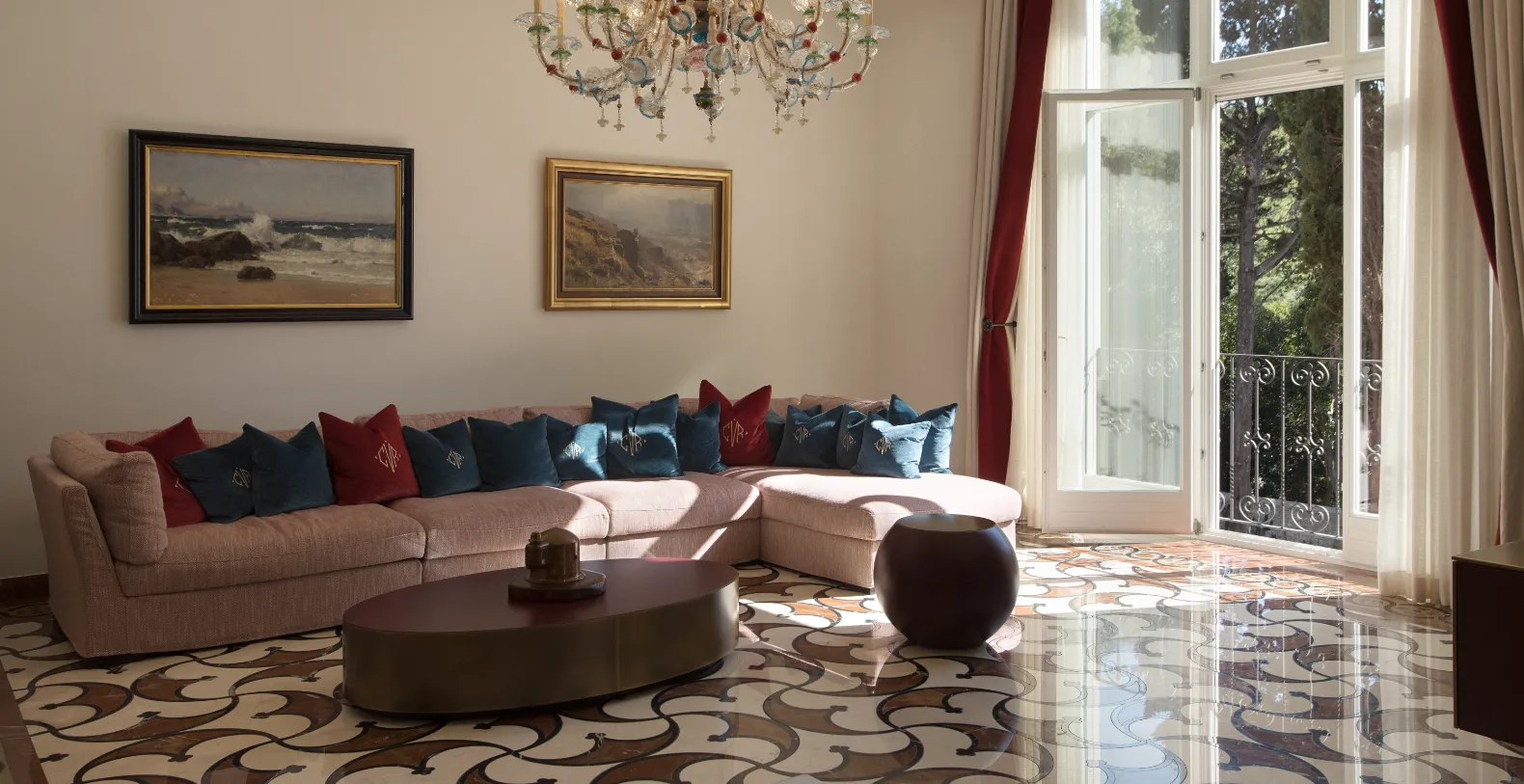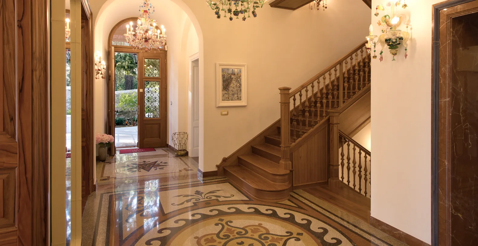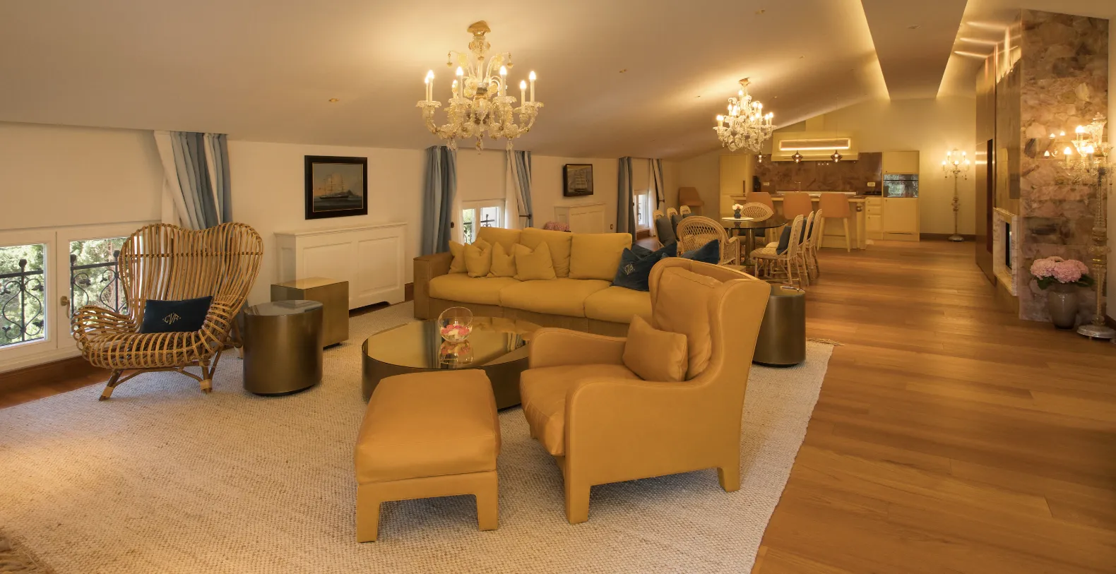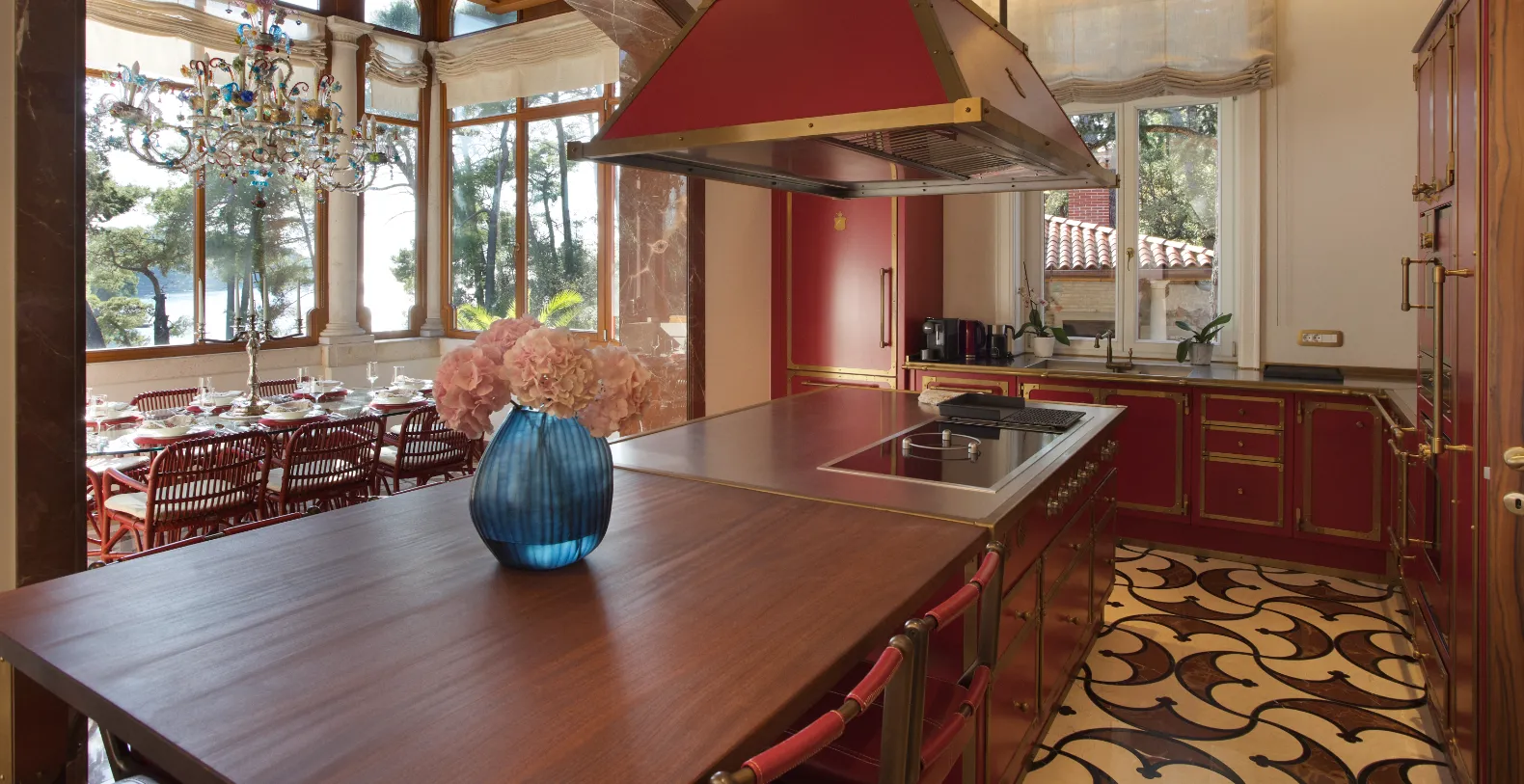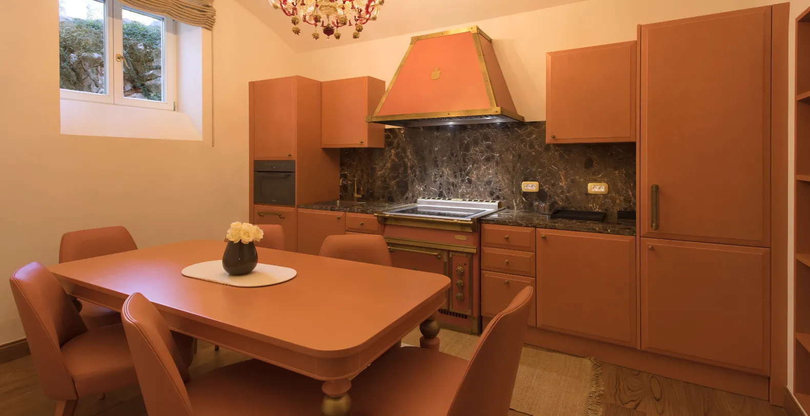 Spanning approximately 700 m² of living space, the villa accommodates up to 14 guests across seven individually designed suites. Distributed over three levels, each floor features its own private entrance along with a fully equipped kitchen, living, and dining areas—making the property ideal for multi-generational families or groups seeking both shared and private spaces. The interiors celebrate the villa’s rich heritage, with carefully preserved architectural elements and sophisticated finishes. Terrazzo floors, Murano glass chandeliers, handcrafted woodwork, and curated artworks create an atmosphere that is elegant and characterful.