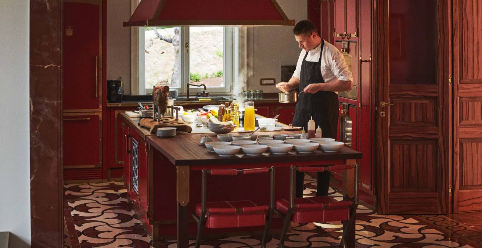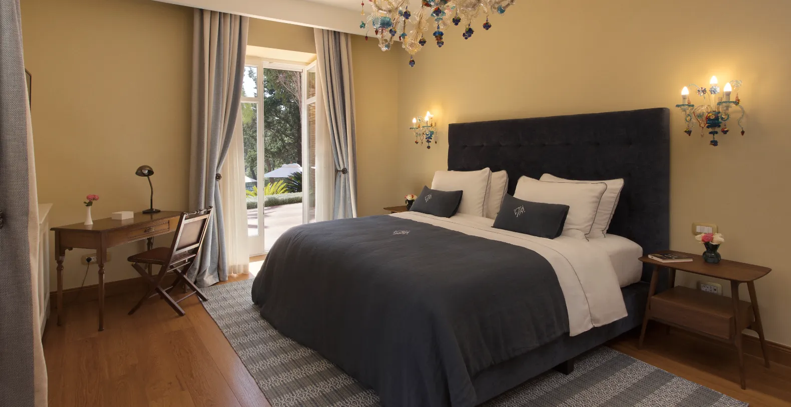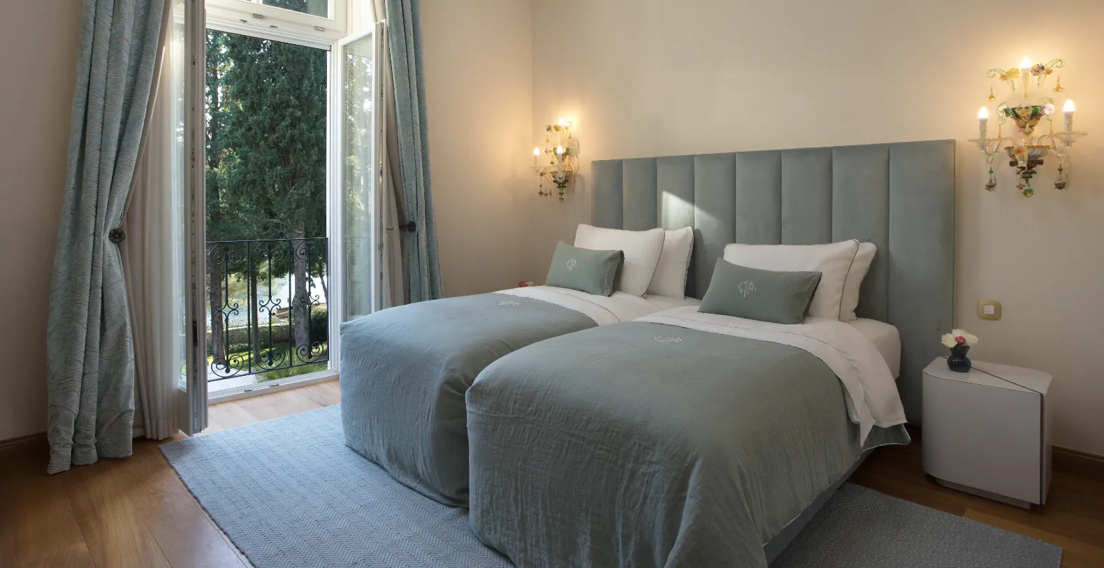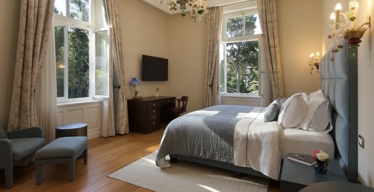 Spanning approximately 700 m² of living space, the villa accommodates up to 14 guests across seven individually designed suites. Distributed over three levels, each floor features its own private entrance along with a fully equipped kitchen, living, and dining areas—making the property ideal for multi-generational families or groups seeking both shared and private spaces. The interiors celebrate the villa’s rich heritage, with carefully preserved architectural elements and sophisticated finishes. Terrazzo floors, Murano glass chandeliers, handcrafted woodwork, and curated artworks create an atmosphere that is elegant and characterful.