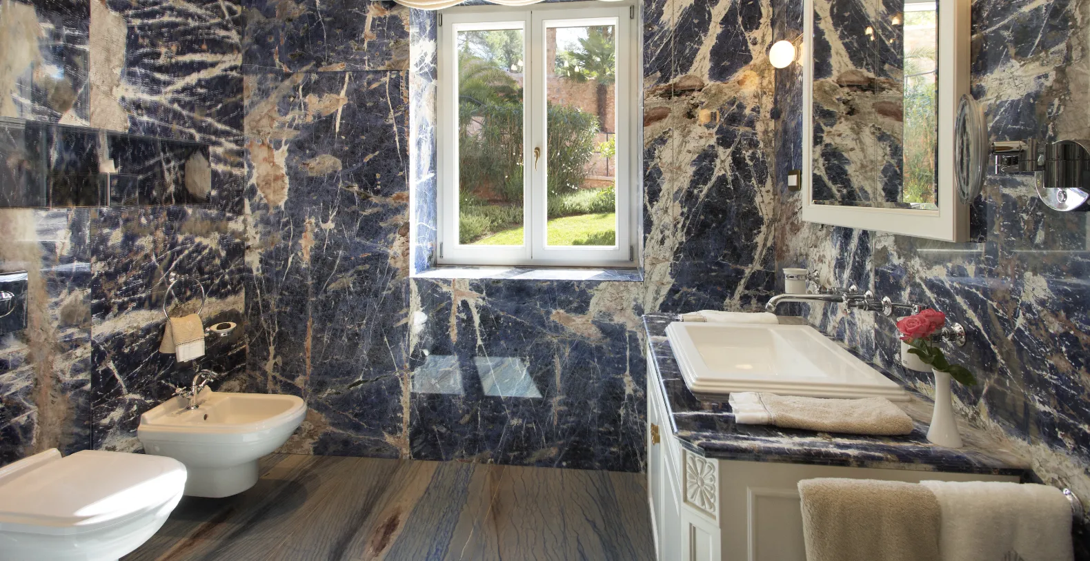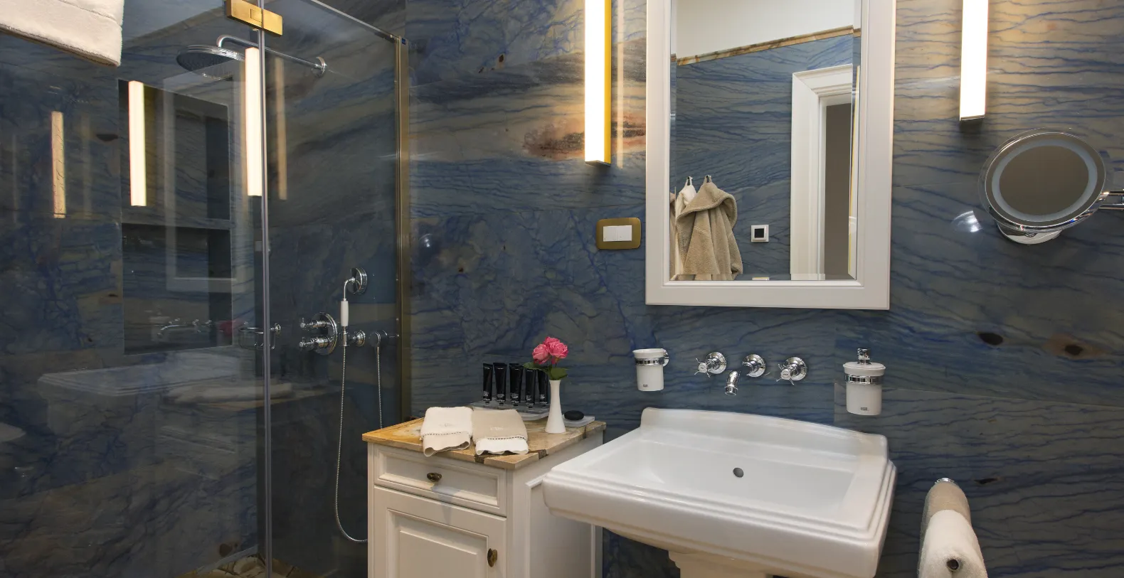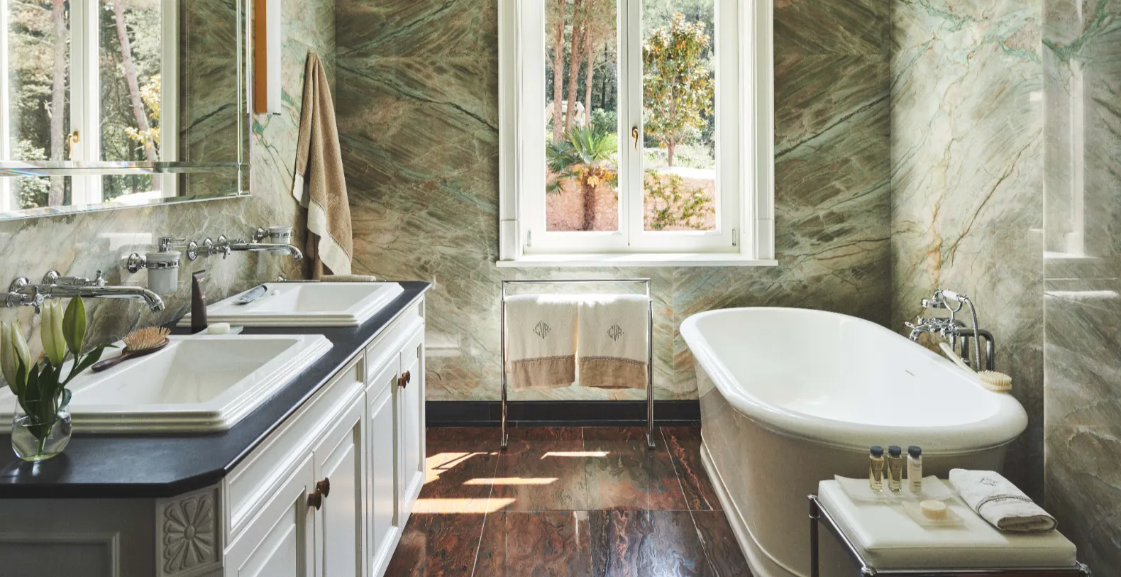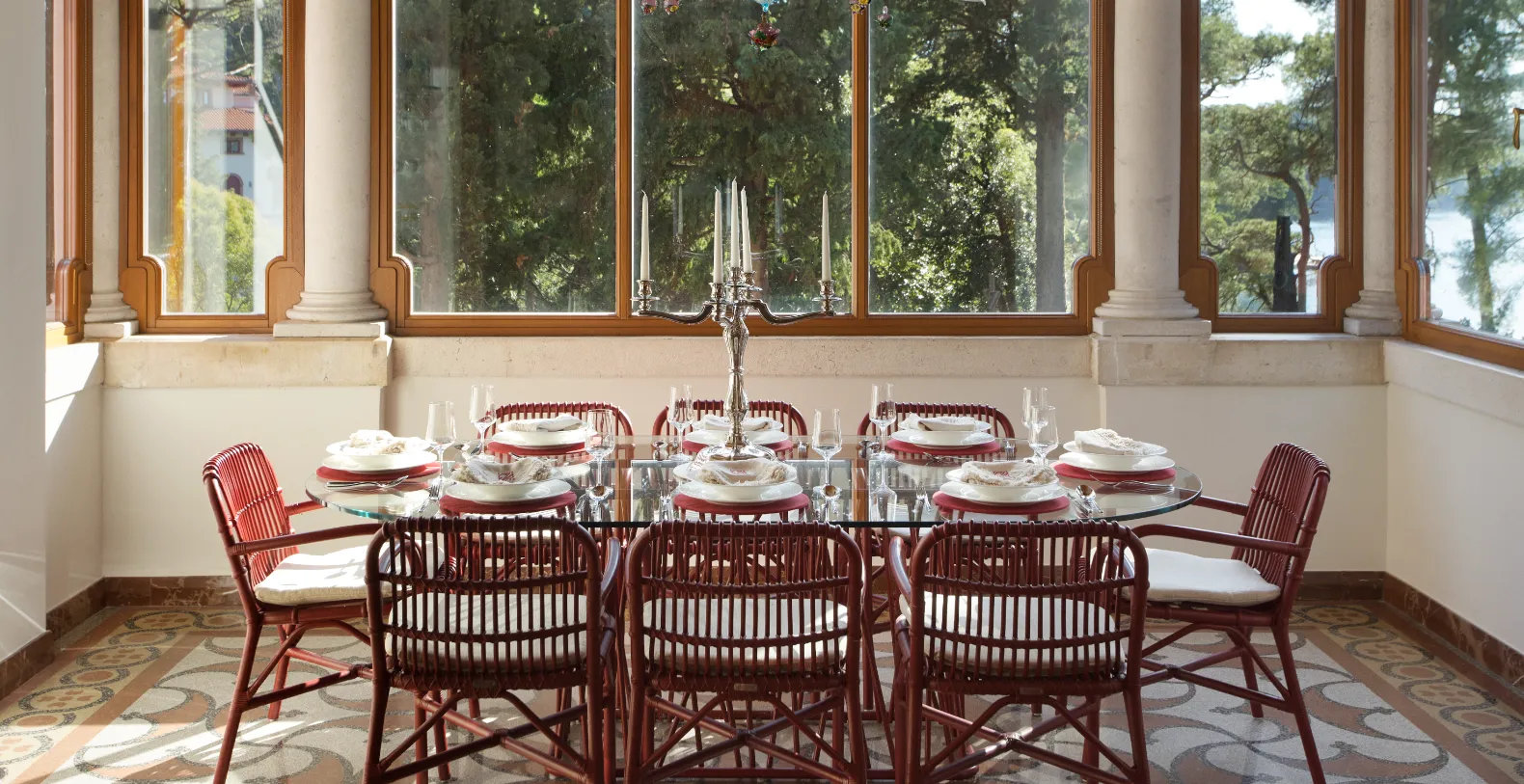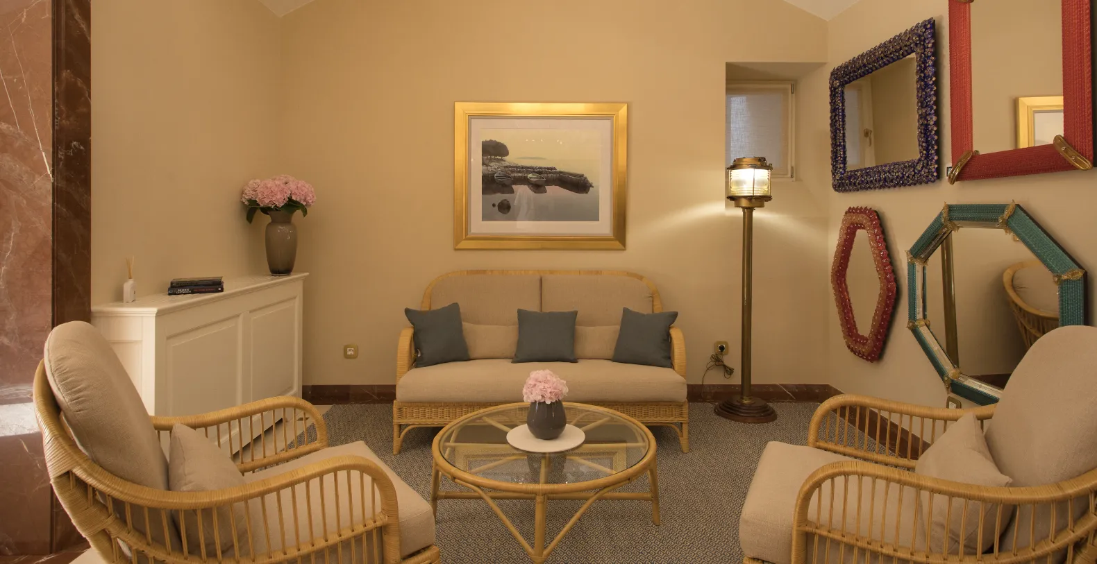 Spanning approximately 700 m² of living space, the villa accommodates up to 14 guests across seven individually designed suites. Distributed over three levels, each floor features its own private entrance along with a fully equipped kitchen, living, and dining areas—making the property ideal for multi-generational families or groups seeking both shared and private spaces. The interiors celebrate the villa’s rich heritage, with carefully preserved architectural elements and sophisticated finishes. Terrazzo floors, Murano glass chandeliers, handcrafted woodwork, and curated artworks create an atmosphere that is elegant and characterful.