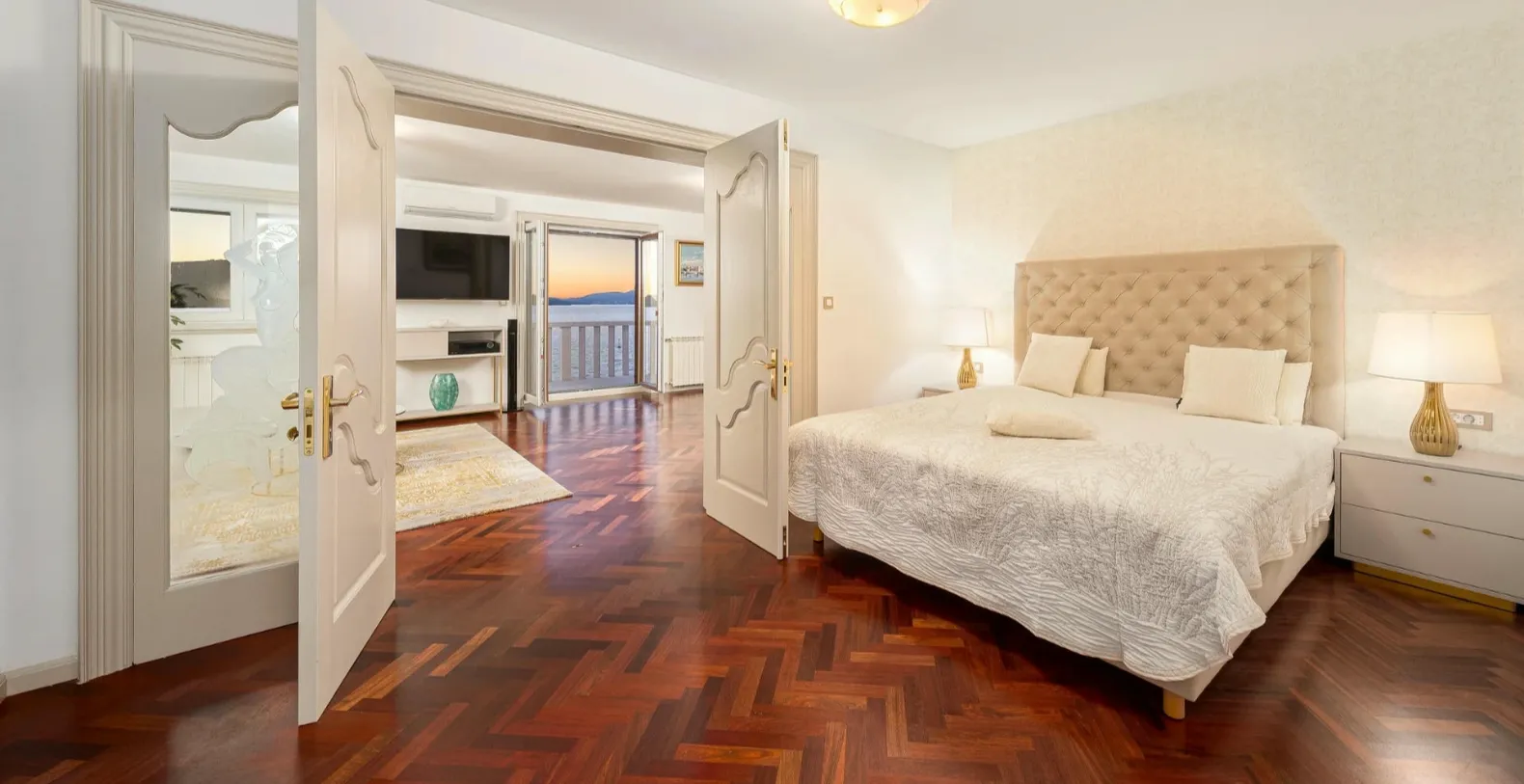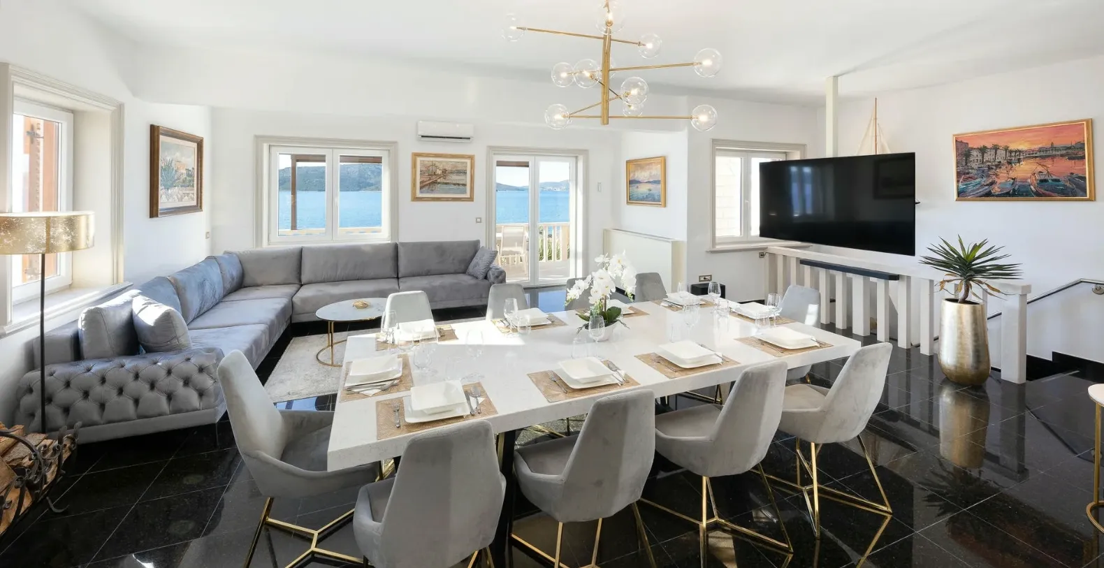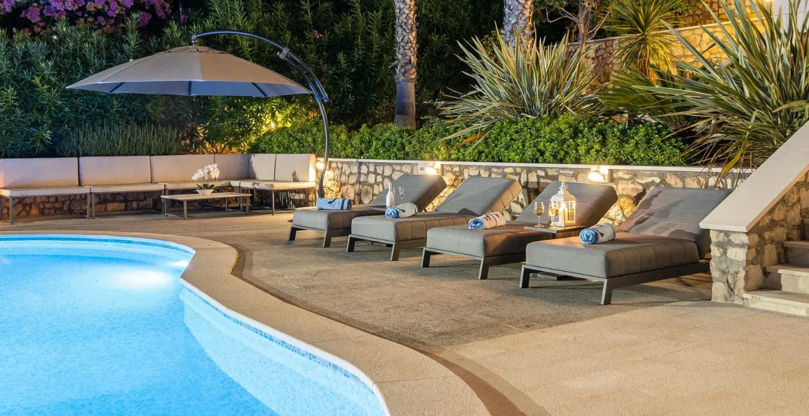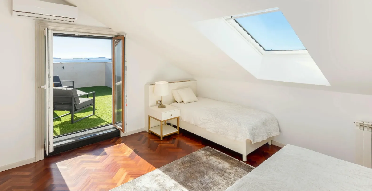 The outdoor areas are where Villa Golden Hour truly lives up to its name. A large heated swimming pool sits just steps from the sea, surrounded by sun loungers and multiple terraces designed for all-day enjoyment. A private path leads directly to the beach and dock, allowing effortless access to the crystal-clear waters of the Adriatic. Guests can also enjoy a jacuzzi with sea views, a landscaped Mediterranean garden, and even a private basketball court.