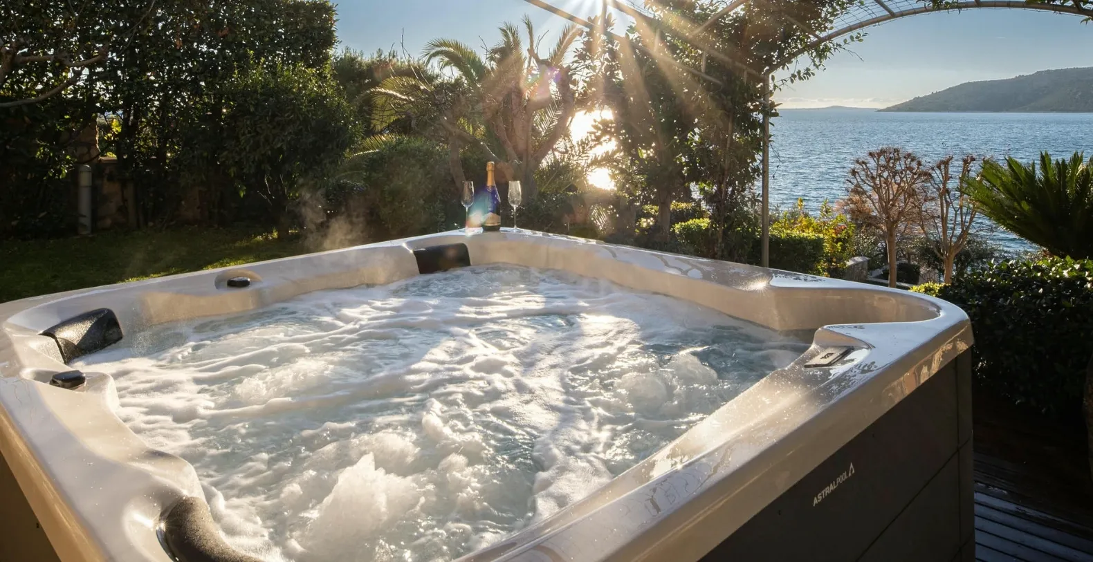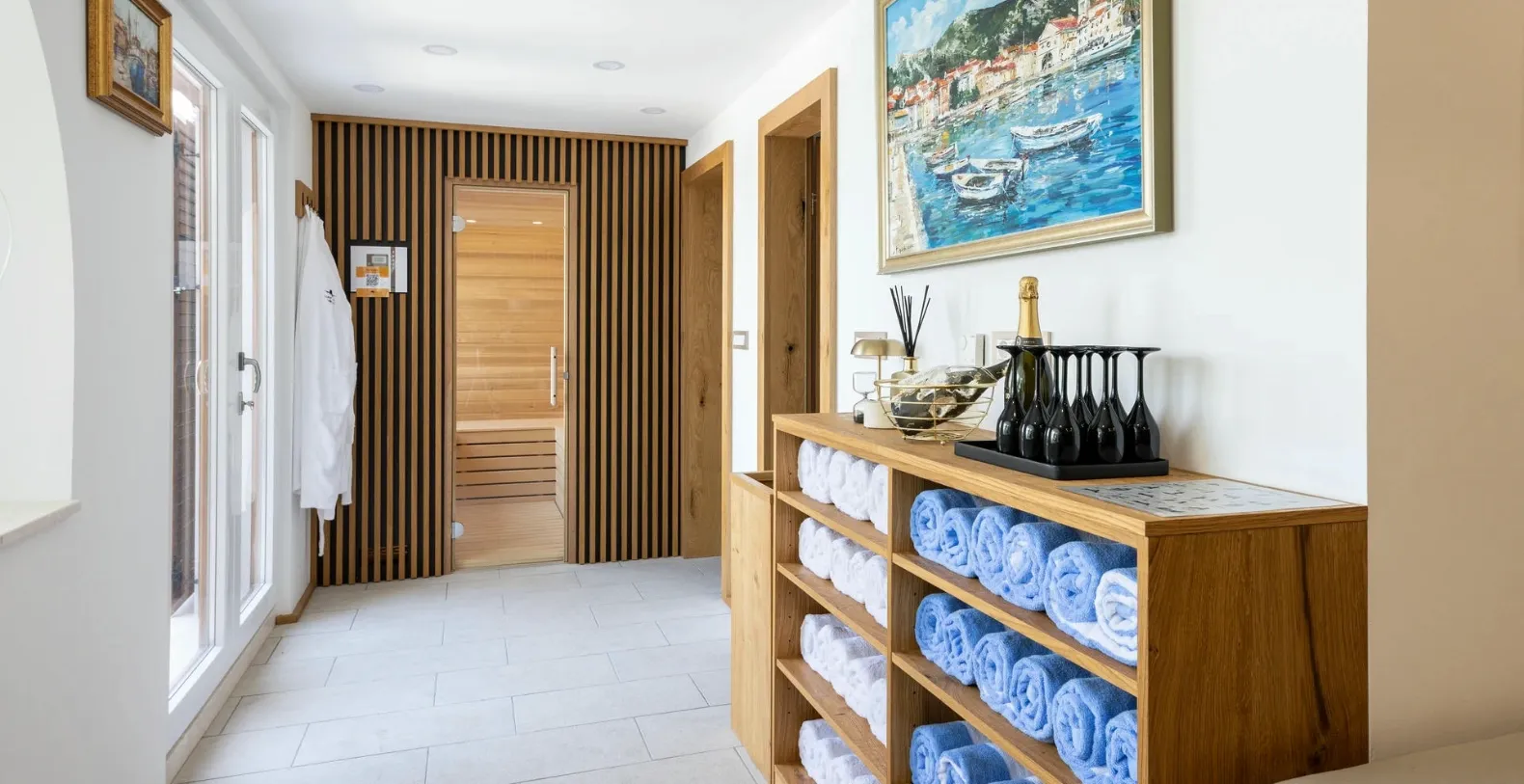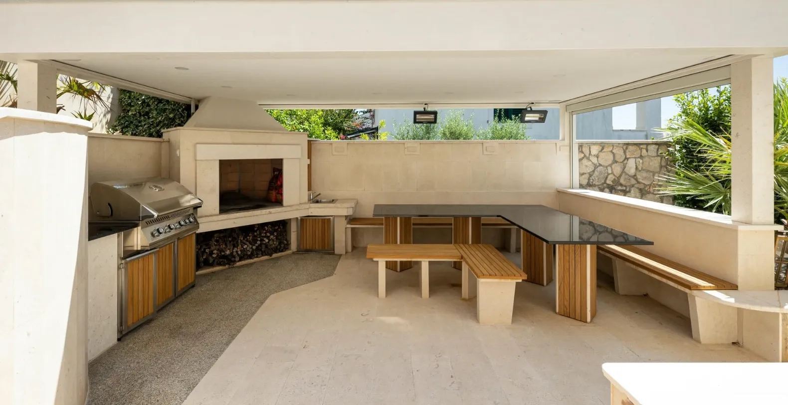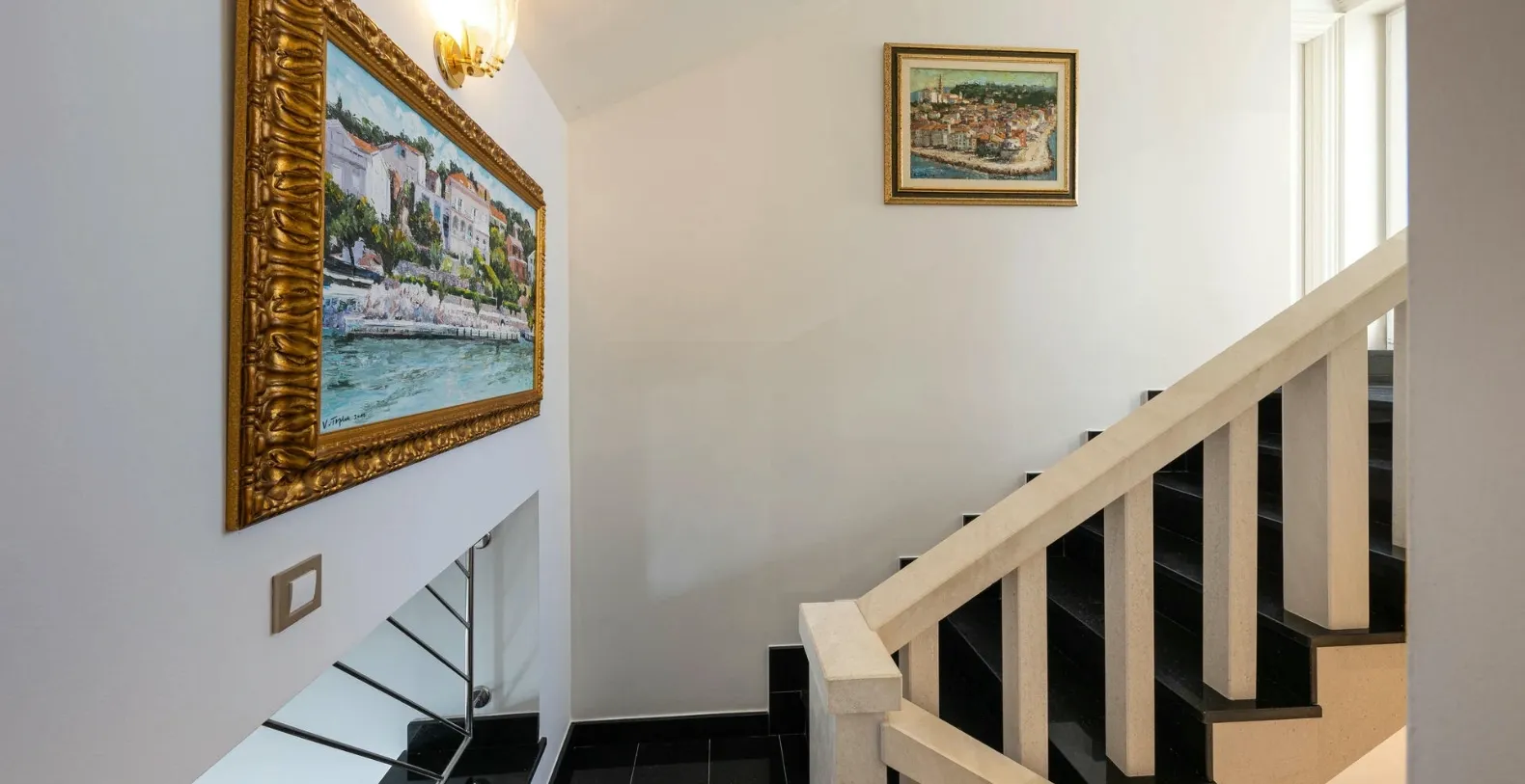 The outdoor areas are where Villa Golden Hour truly lives up to its name. A large heated swimming pool sits just steps from the sea, surrounded by sun loungers and multiple terraces designed for all-day enjoyment. A private path leads directly to the beach and dock, allowing effortless access to the crystal-clear waters of the Adriatic. Guests can also enjoy a jacuzzi with sea views, a landscaped Mediterranean garden, and even a private basketball court.