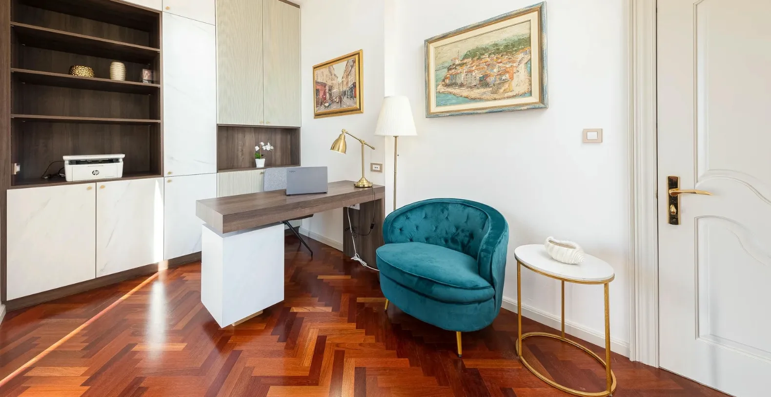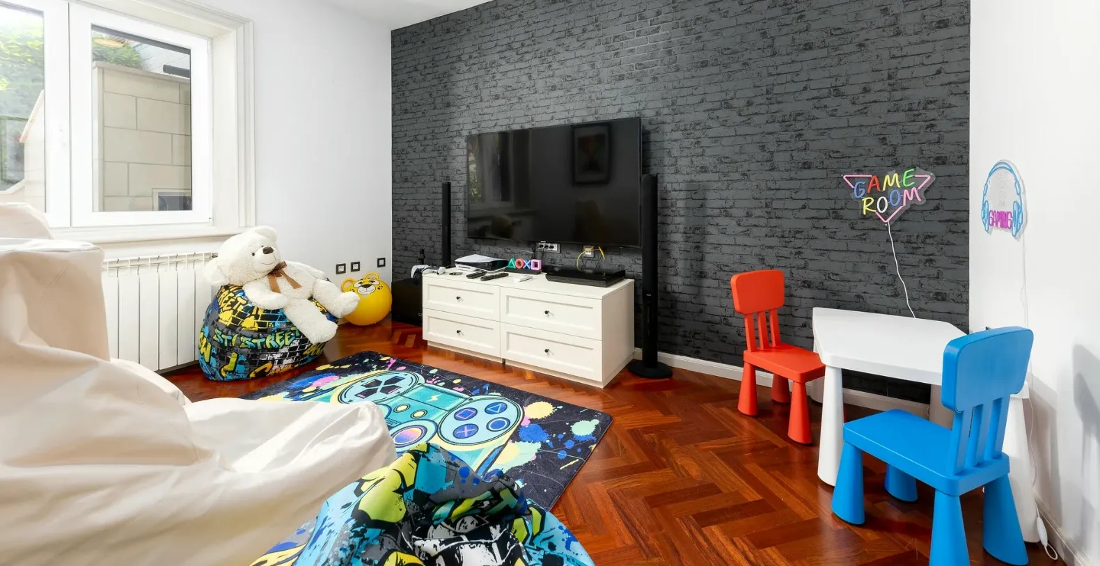 Inside, the villa is thoughtfully equipped for both comfort and entertainment. A fully equipped modern kitchen and elegant dining area create a natural gathering space, while a dedicated wellness zone elevates the experience with a Finnish sauna, gym, and relaxation area. A children’s playroom ensures younger guests are equally entertained, making the villa perfectly suited for families with small children.