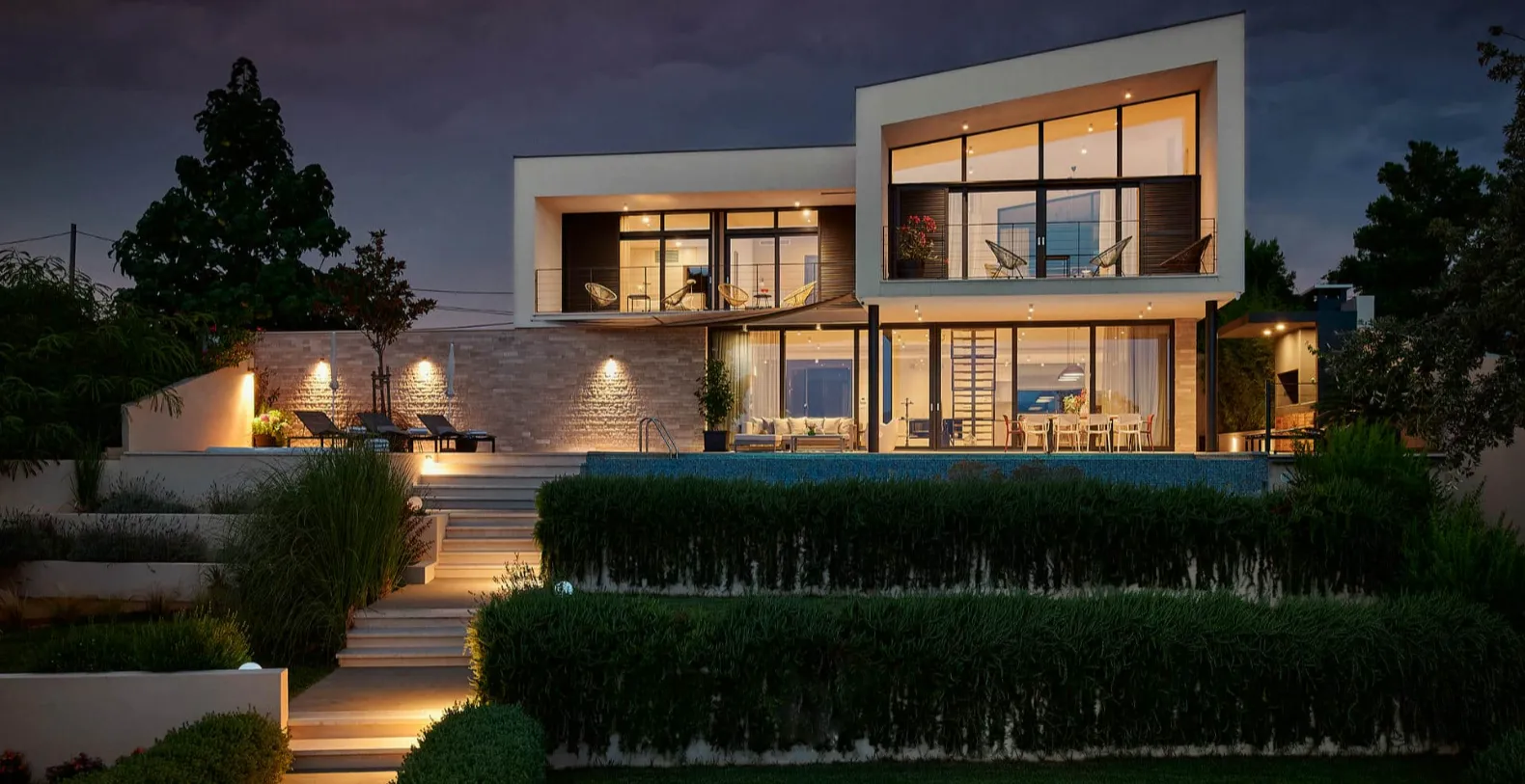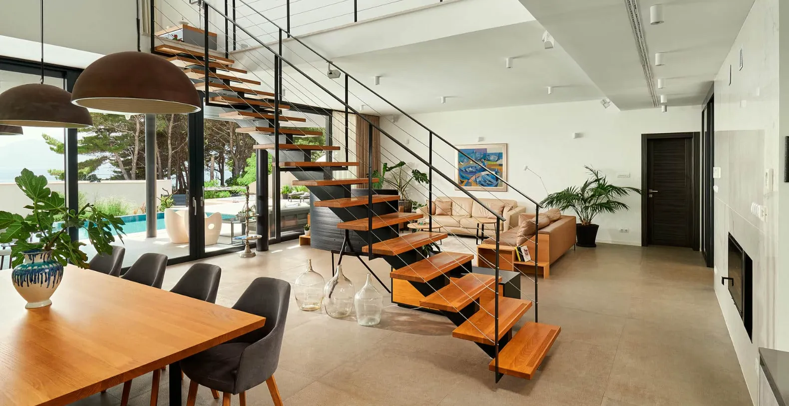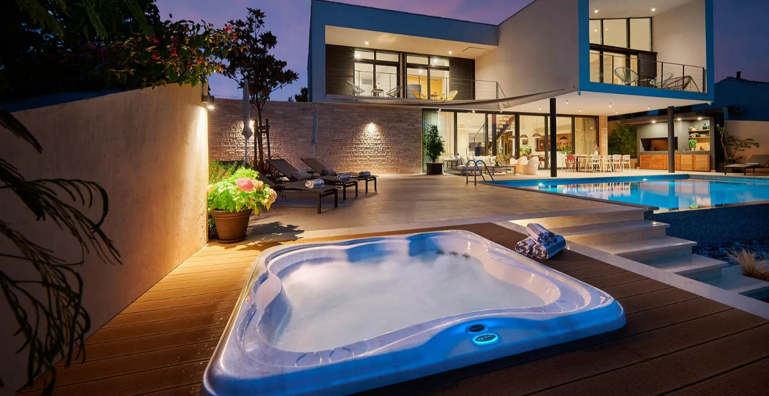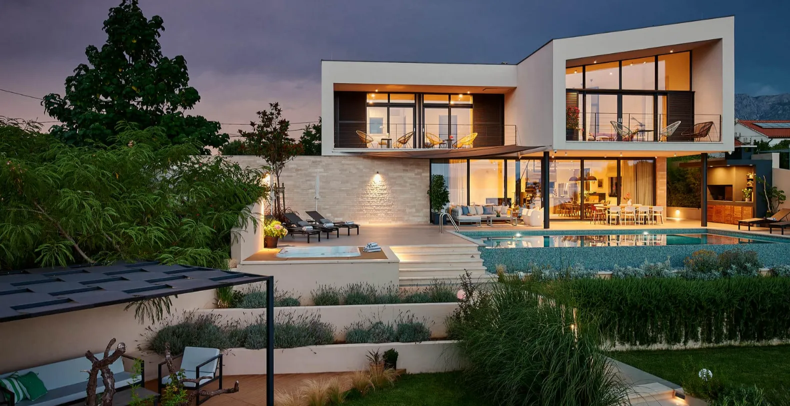 Outdoor living is one of the villa’s most appealing features. The terrace includes a heated swimming pool, a jacuzzi, comfortable lounge areas, and a shaded outdoor dining space ideal for enjoying long Mediterranean dinners while overlooking the sea. The landscaped garden and private setting enhance the sense of tranquility, while the immediate proximity to the beach allows guests to step directly into the crystal-clear Adriatic waters at any time of day.