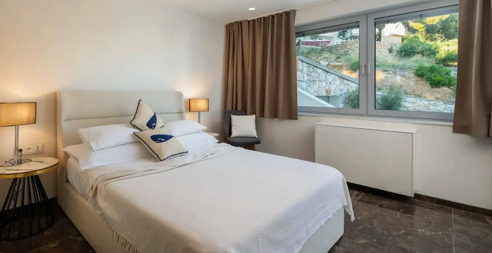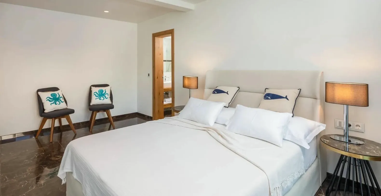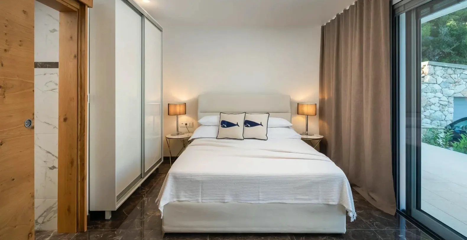 Five beautifully appointed double bedrooms accommodate up to ten guests in absolute comfort. Each bedroom features its own en suite bathroom and access to either a private balcony or terrace, offering serene views of the sea or surrounding greenery. The layout ensures both shared living and private retreat spaces, making the villa ideal for families or groups of friends traveling together. Three bedrooms are located on the ground level, while two additional bedrooms on the upper floor enjoy elevated perspectives of the surrounding landscape.