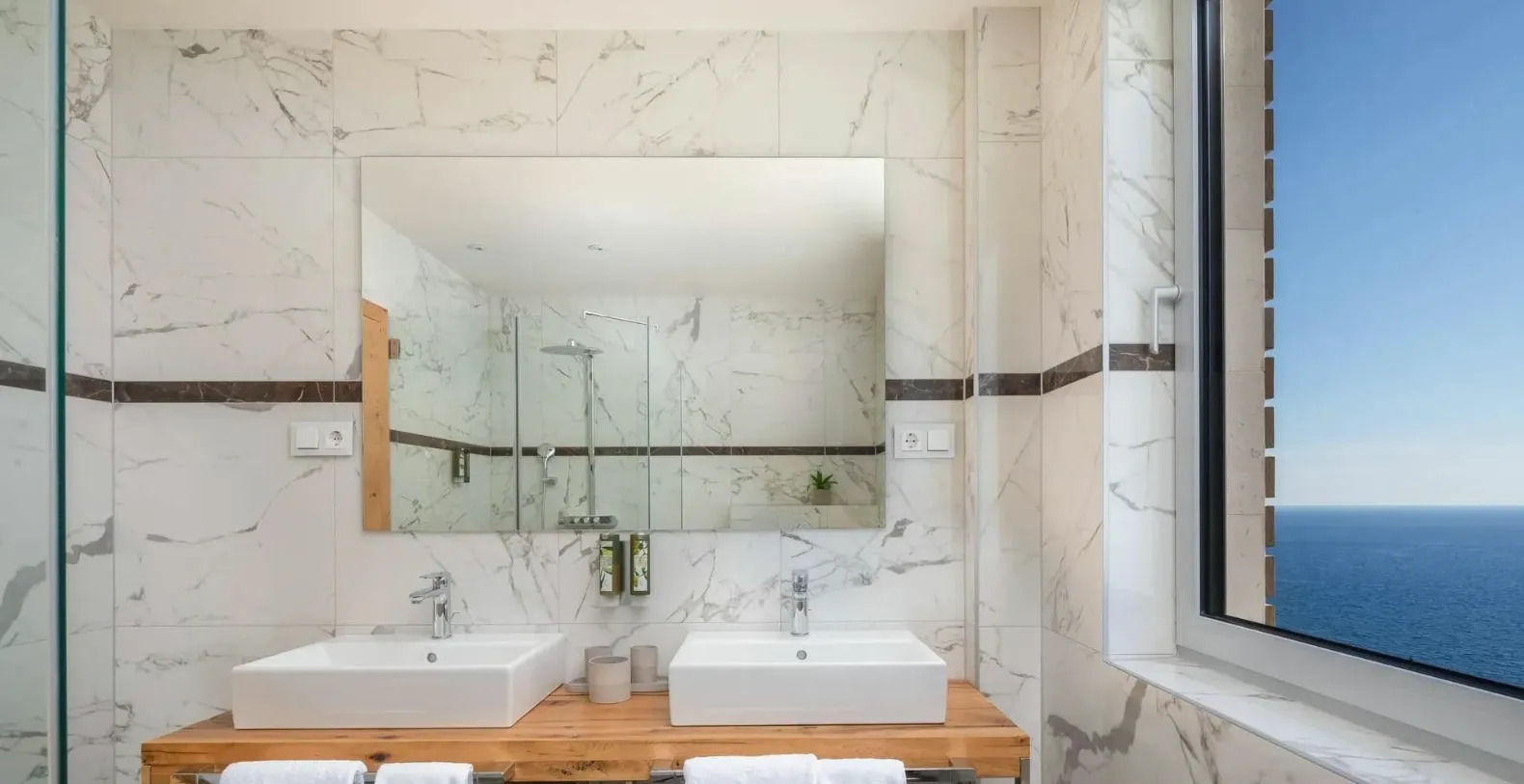The outdoor experience is truly exceptional. A heated infinity pool stretches toward the horizon, visually merging with the sea below, while sun loungers, shaded lounge areas, and alfresco dining spaces invite long, leisurely days under the Mediterranean sun.