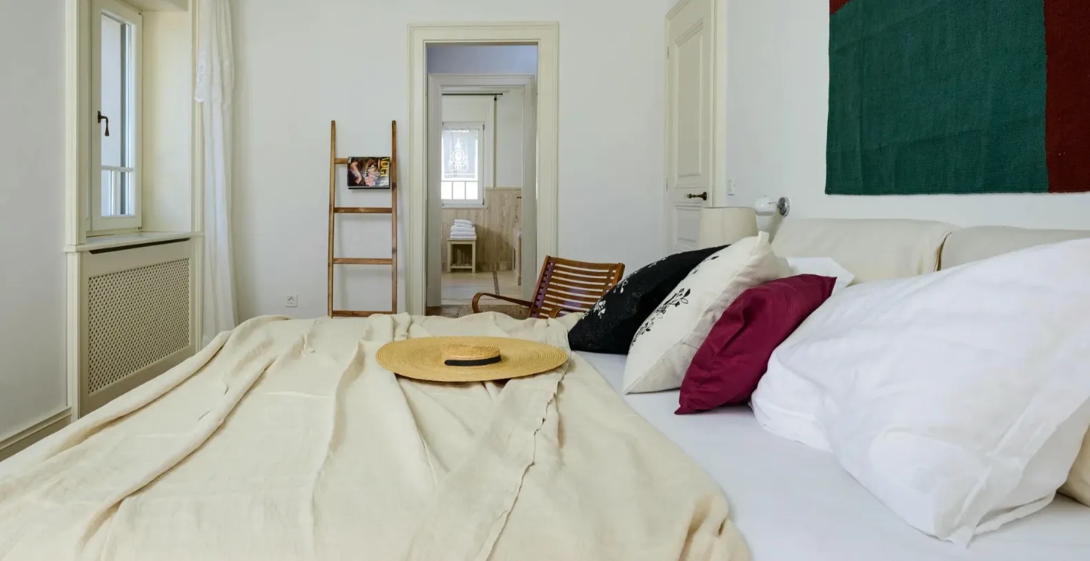 The master bedroom is also located on the ground floor and features an en-suite bathroom and walk-in wardrobe, offering privacy and easy access to the outdoor living areas. A wooden staircase leads to the upper floor, where a cozy library space connects three additional elegant bedrooms, each finished with refined furnishings and high-quality linens. Sea-view terraces on this level provide breathtaking panoramas across the Adriatic and nearby islands.