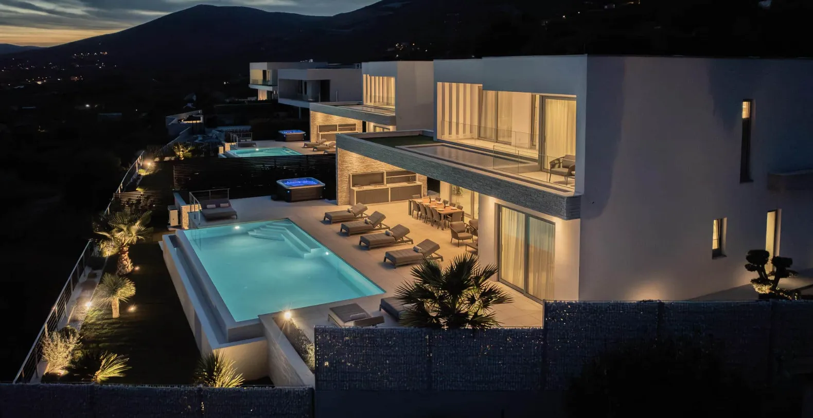Set on a spacious 1,080 m² plot, the villa features 330 m² of beautifully designed living space spread across two levels. Clean architectural lines, floor-to-ceiling glass doors, and a neutral palette create an elegant, light-filled atmosphere that seamlessly blends indoor and outdoor living. The outdoor area is the heart of Villa Nikita. A large heated infinity pool appears to merge with the horizon, offering uninterrupted sea views and unforgettable sunsets. Sun loungers and shaded seating invite long, relaxed days by the pool, while an outdoor shower adds extra comfort after swimming. The outdoor kitchen pairs perfectly with the spacious al fresco dining area, making it ideal for shared meals, sunset drinks, or private chef experiences arranged through concierge services.