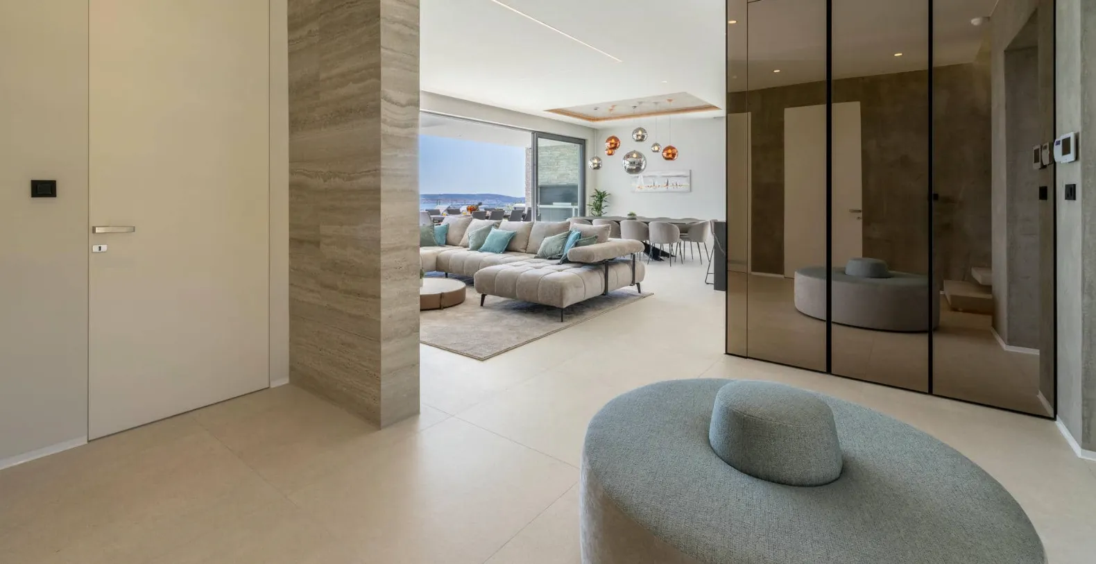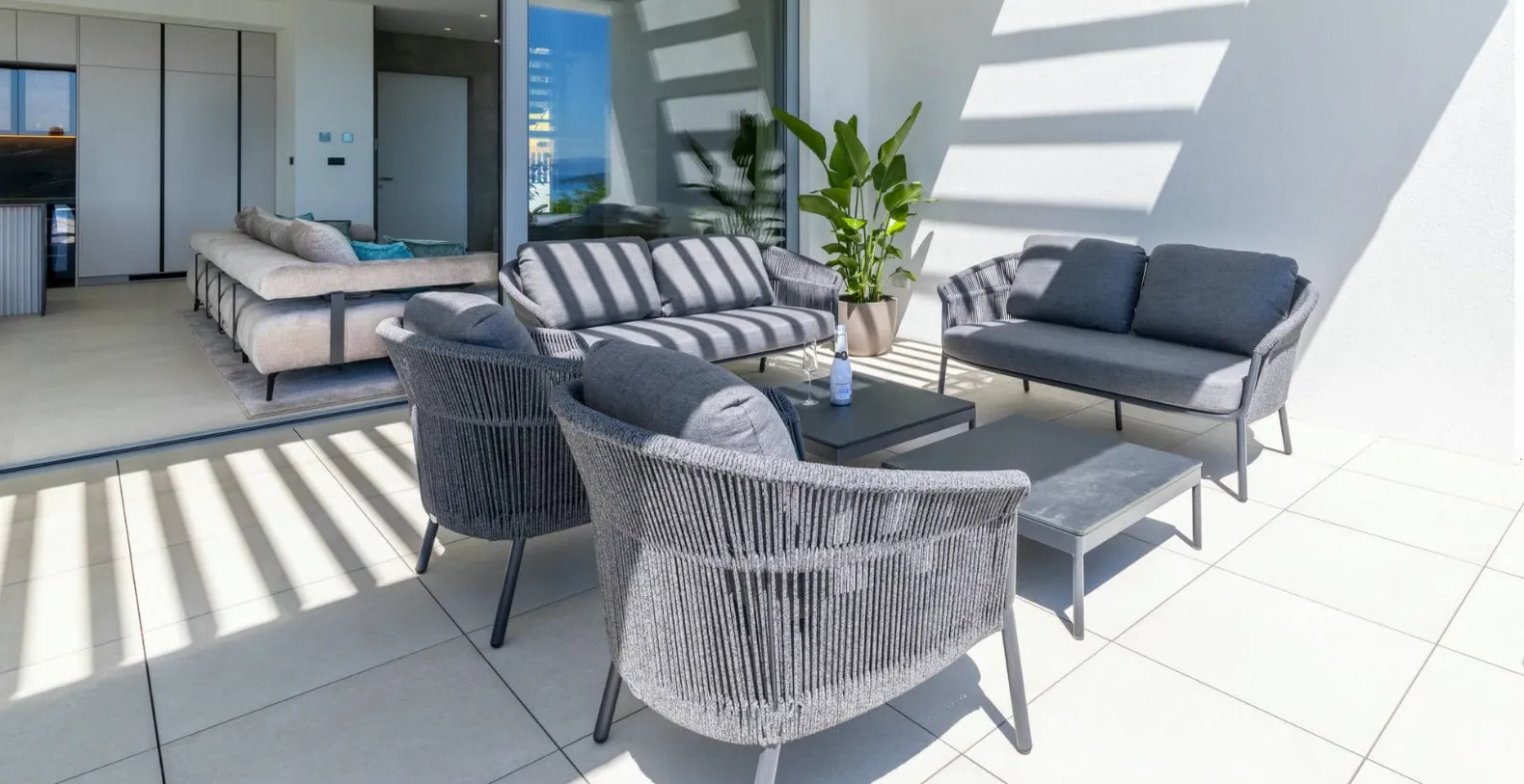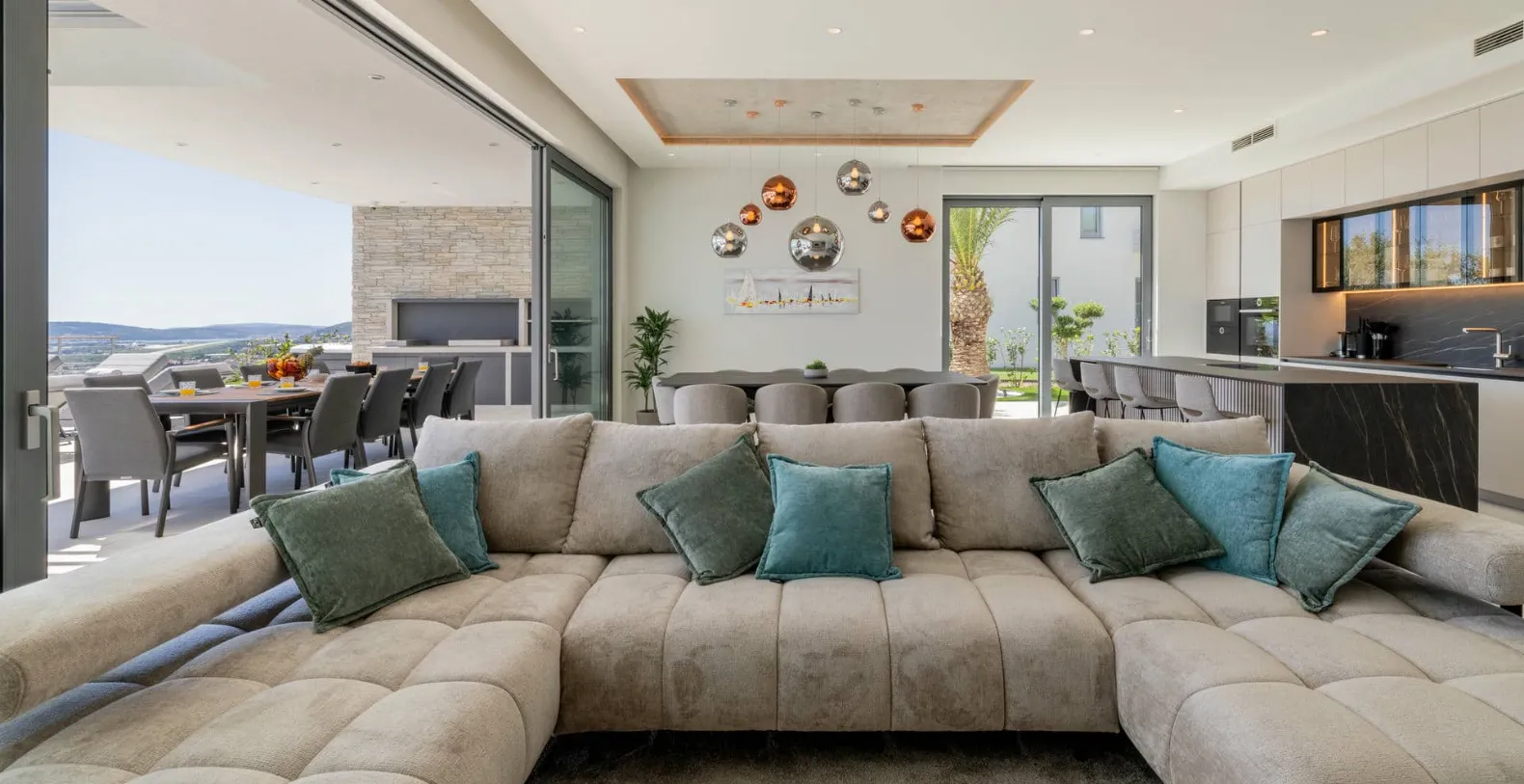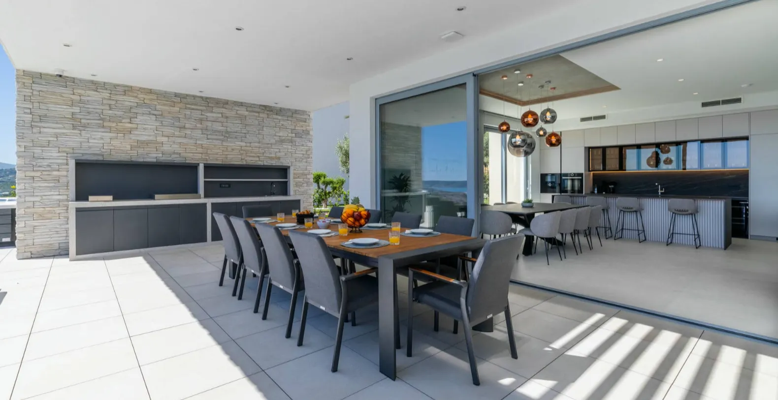Inside, the villa offers generous open-plan living areas, the fully equipped modern kitchen connects seamlessly to the dining and lounge areas, all oriented toward the sea views. Large sliding doors open directly onto the terrace, allowing the Mediterranean light and breeze to flow through the home. A private gym completes the indoor amenities, offering the option to maintain wellness routines even while on holiday.