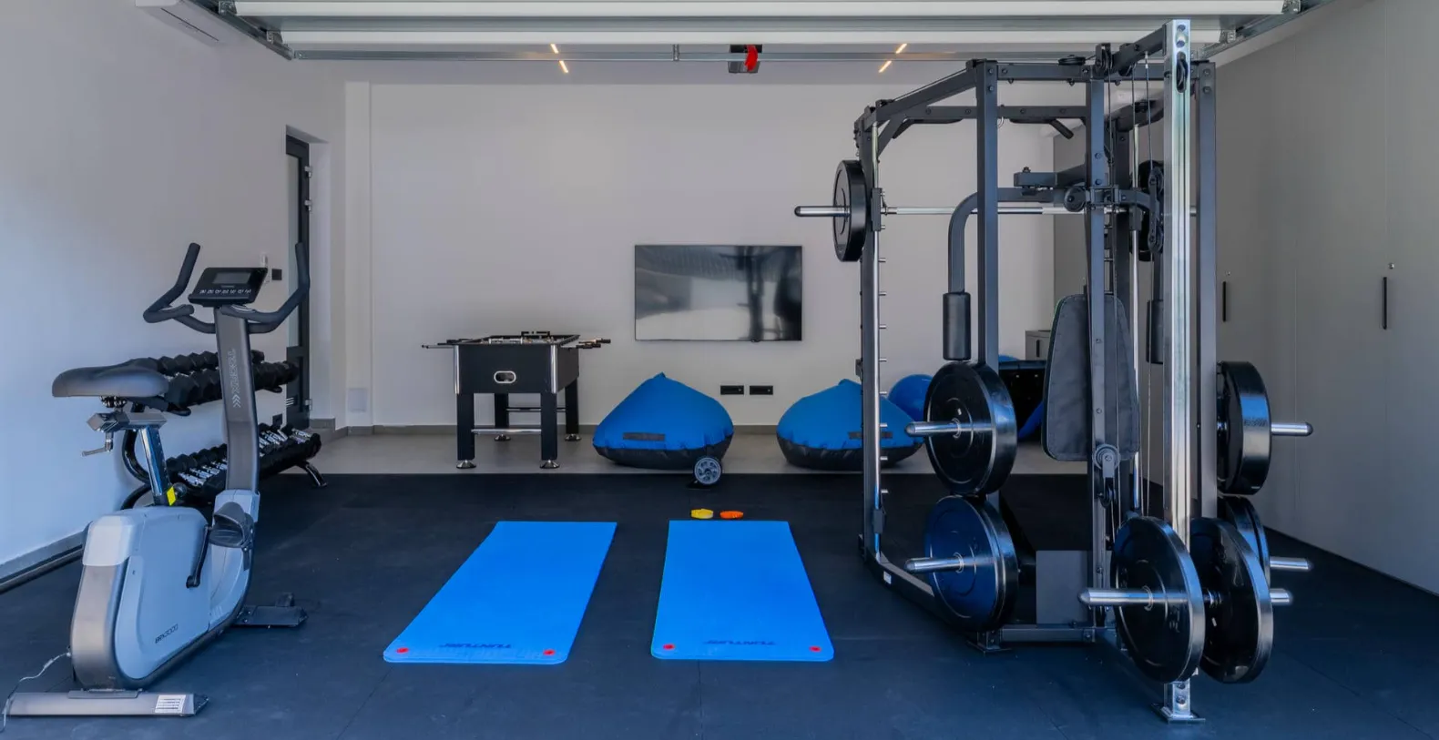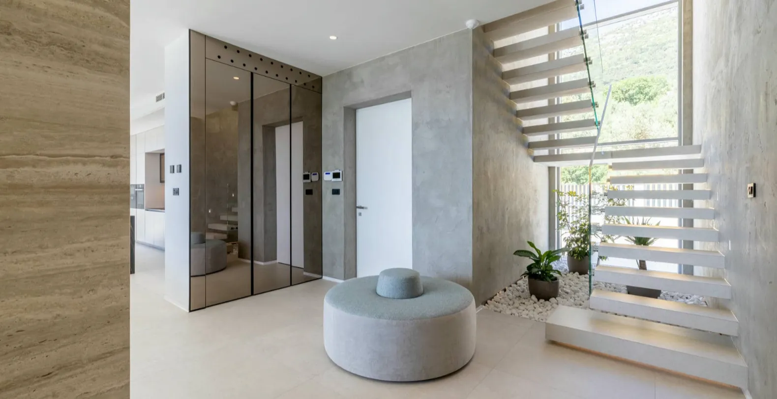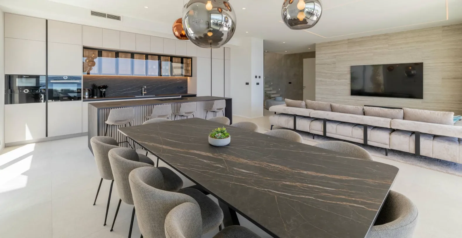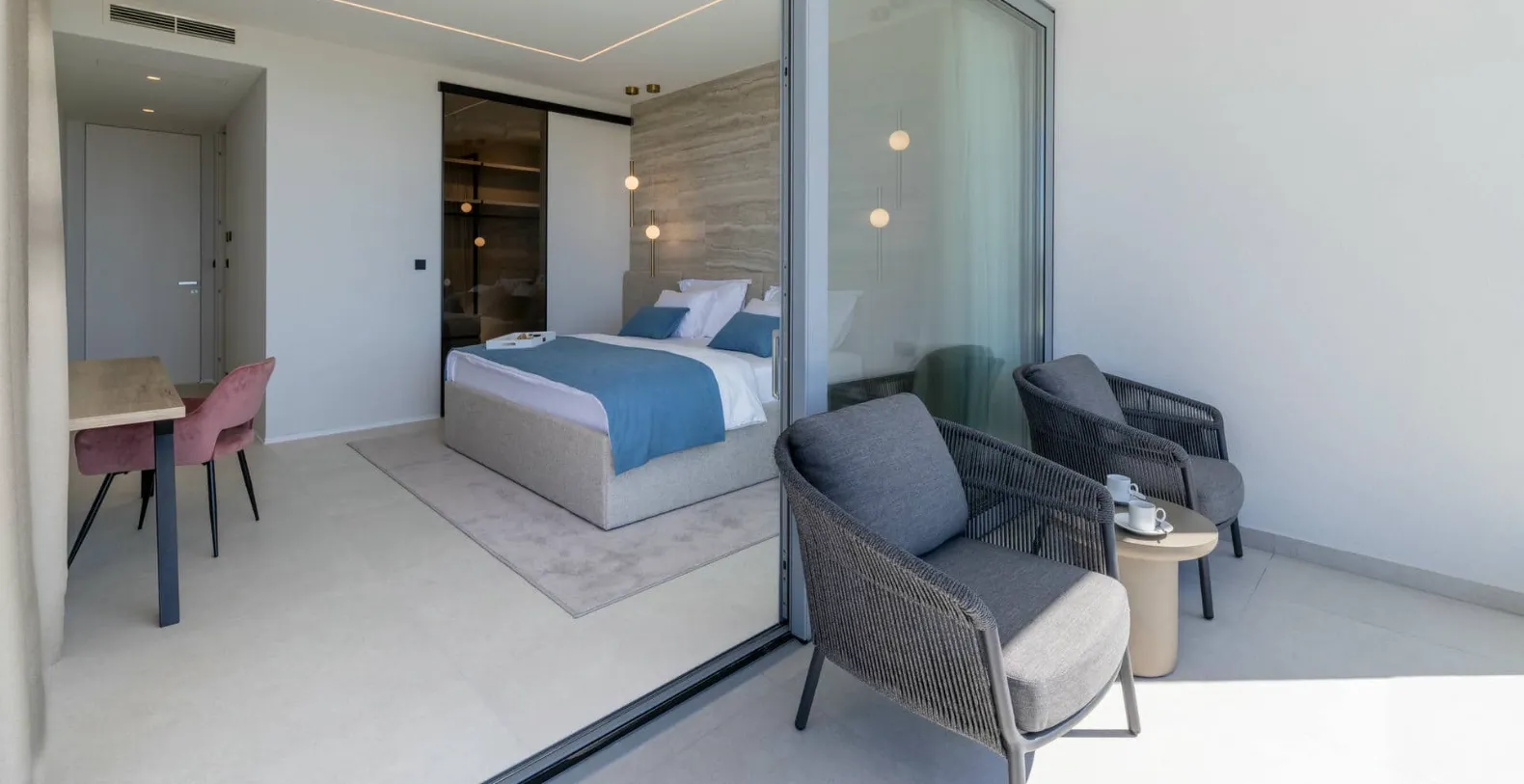 Inside, the villa offers generous open-plan living areas, the fully equipped modern kitchen connects seamlessly to the dining and lounge areas, all oriented toward the sea views. Large sliding doors open directly onto the terrace, allowing the Mediterranean light and breeze to flow through the home. A private gym completes the indoor amenities, offering the option to maintain wellness routines even while on holiday.