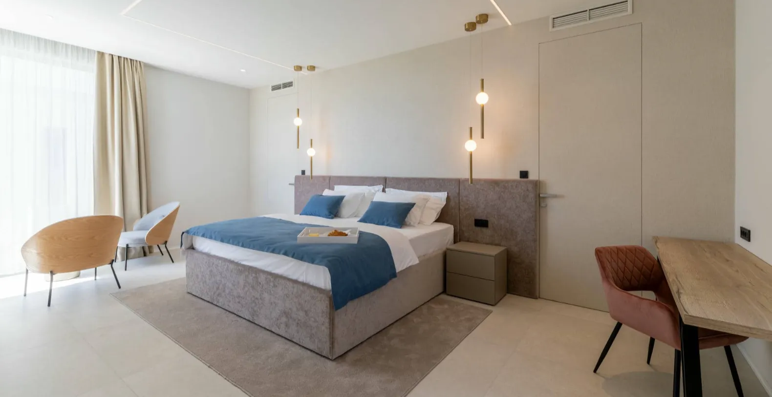 Villa Nikita accommodates up to 10 guests across five elegant bedrooms, each featuring an en-suite bathroom and air conditioning. Four bedrooms are located on the first floor, each with its own private terrace and stunning views of the sea and nearby islands. These rooms offer a peaceful retreat and are designed with comfort and privacy in mind. One additional bedroom is located on the ground floor, making it ideal for guests who prefer easy access to the main living areas.
