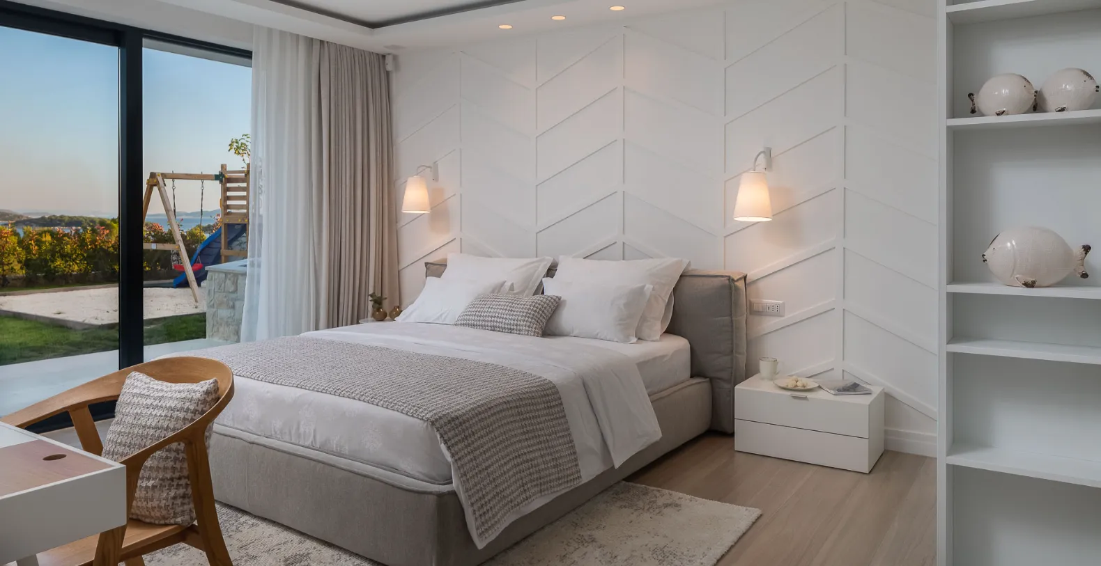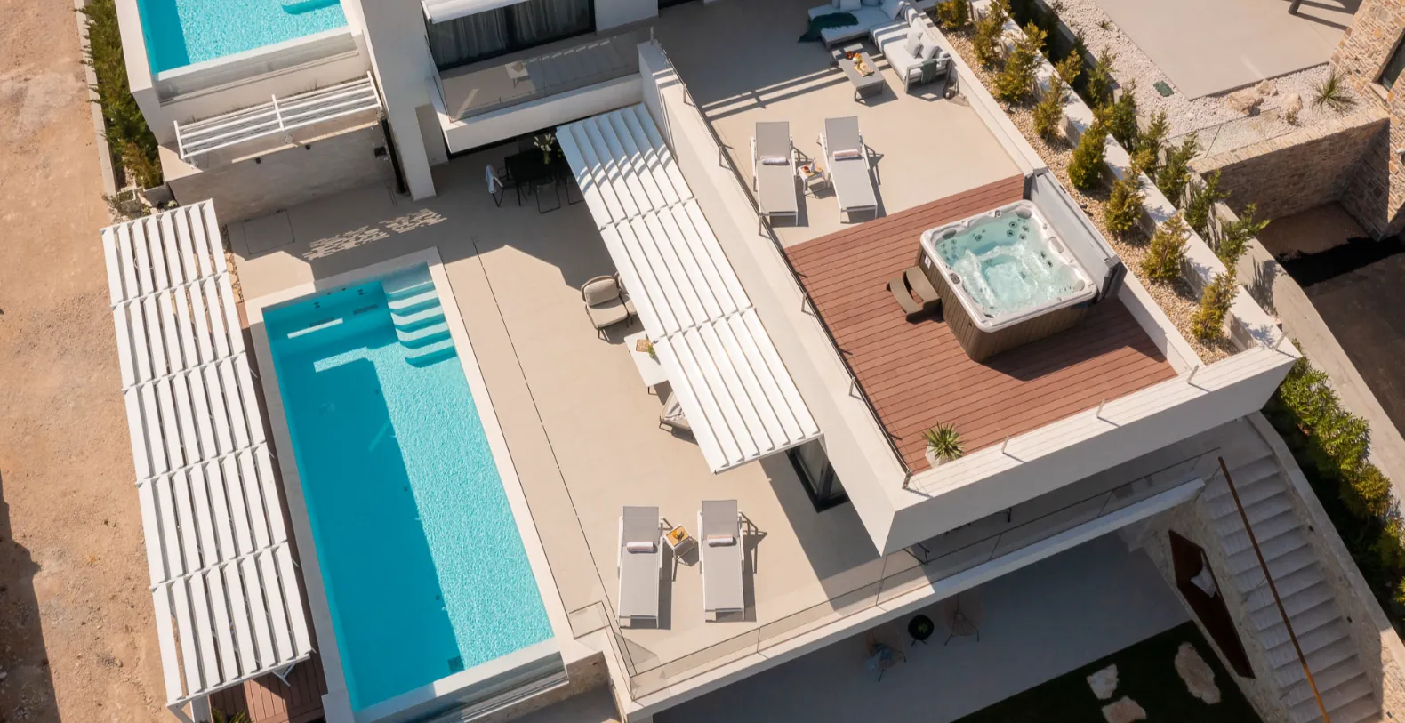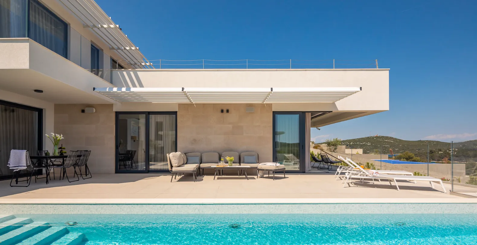 The villa accommodates up to 8+1 guests across four elegant ensuite bedrooms, each offering a calm, contemporary atmosphere. Two bedrooms are located on the ground floor with direct terrace access, while the upper levels host additional suites with elevated sea views. The standout master bedroom features a spacious private terrace with its own jacuzzi and lounge area, offering a more intimate setting to unwind while overlooking the Adriatic.