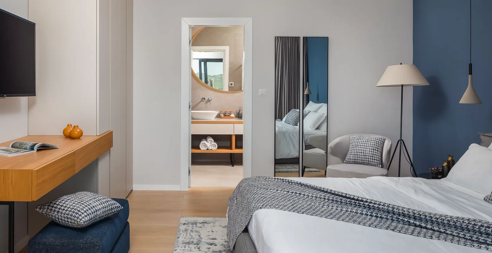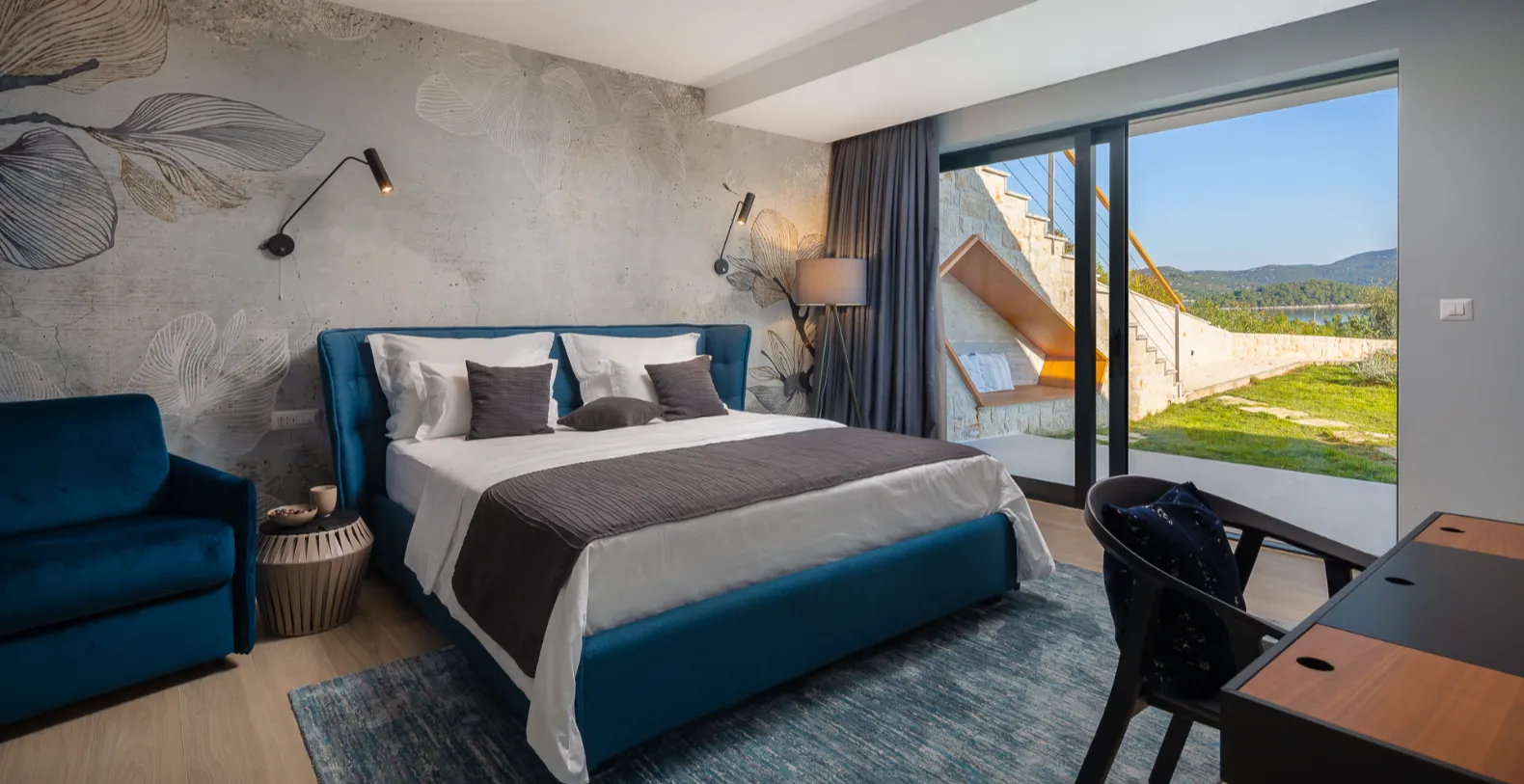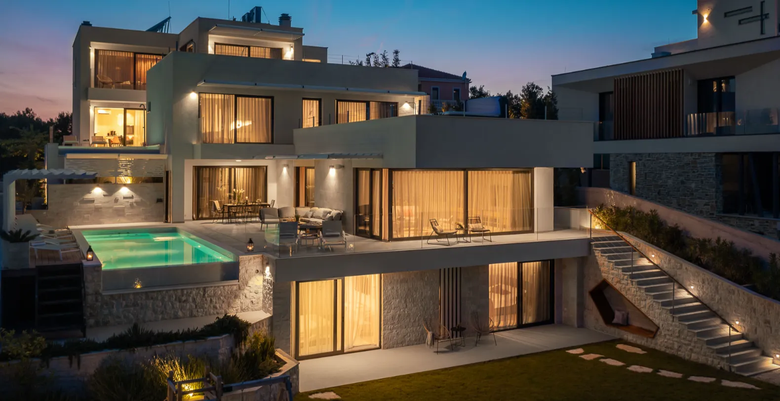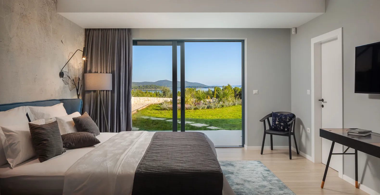 The villa accommodates up to 8+1 guests across four elegant ensuite bedrooms, each offering a calm, contemporary atmosphere. Two bedrooms are located on the ground floor with direct terrace access, while the upper levels host additional suites with elevated sea views. The standout master bedroom features a spacious private terrace with its own jacuzzi and lounge area, offering a more intimate setting to unwind while overlooking the Adriatic.