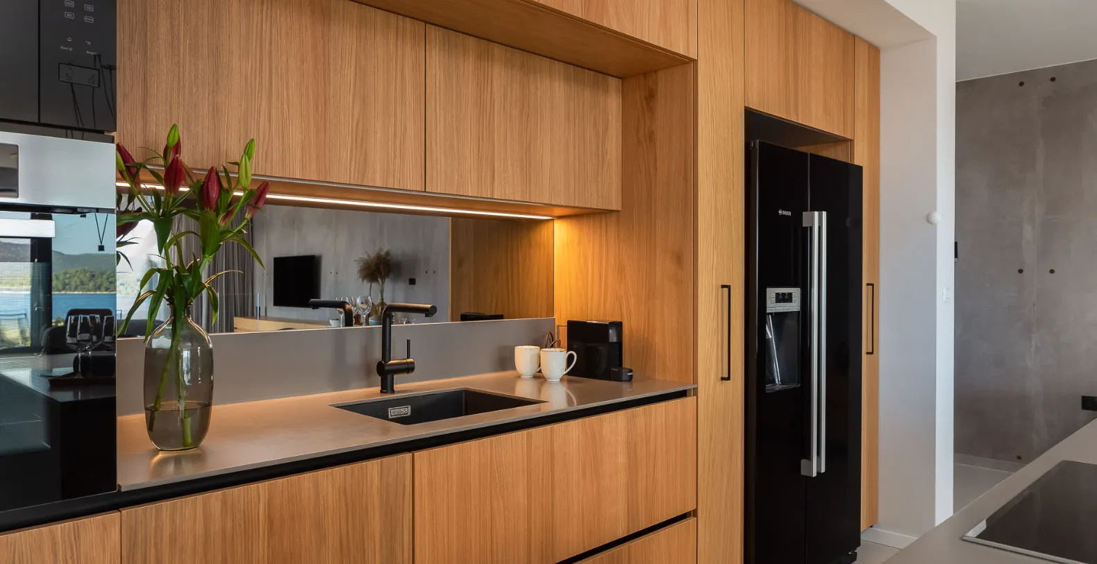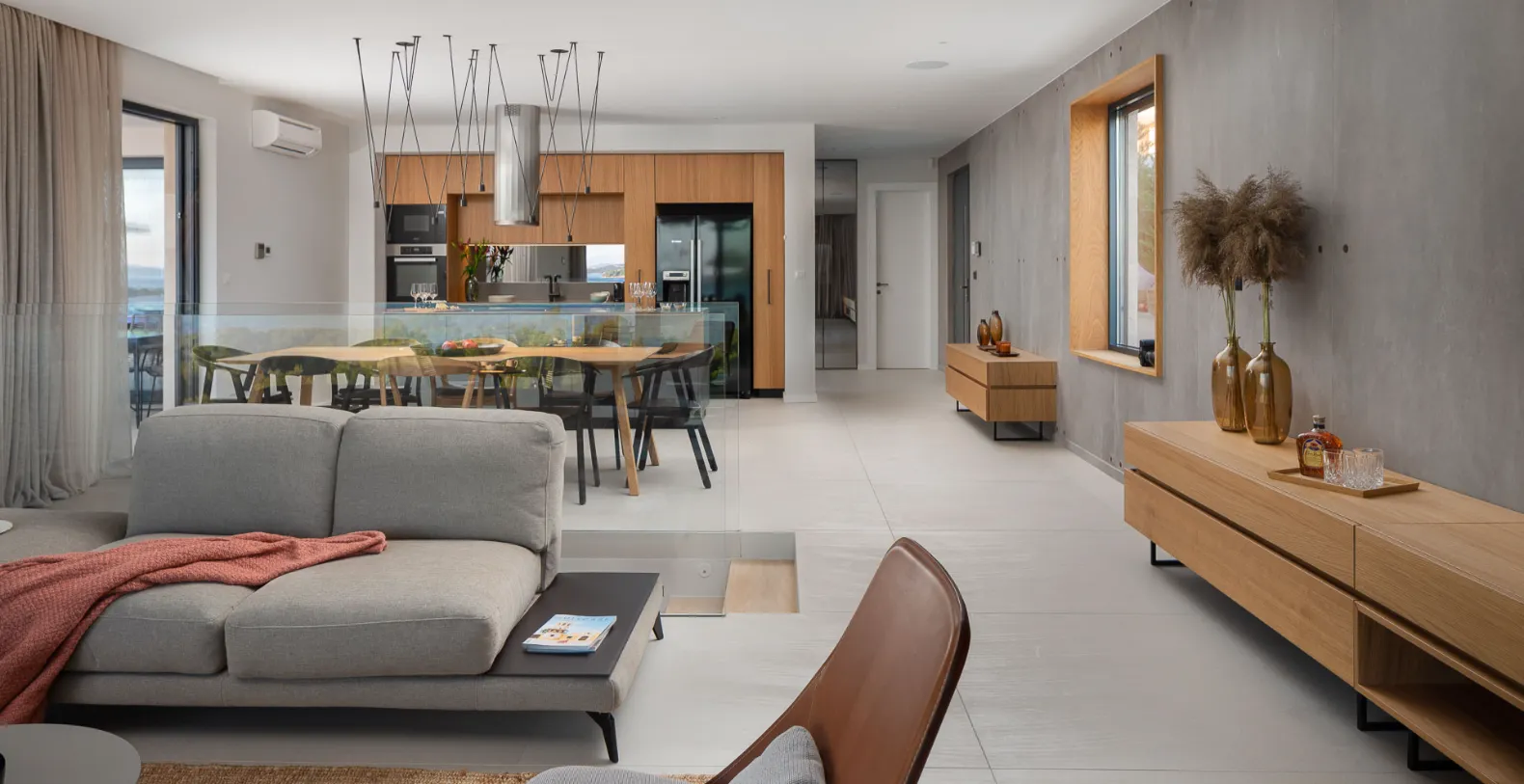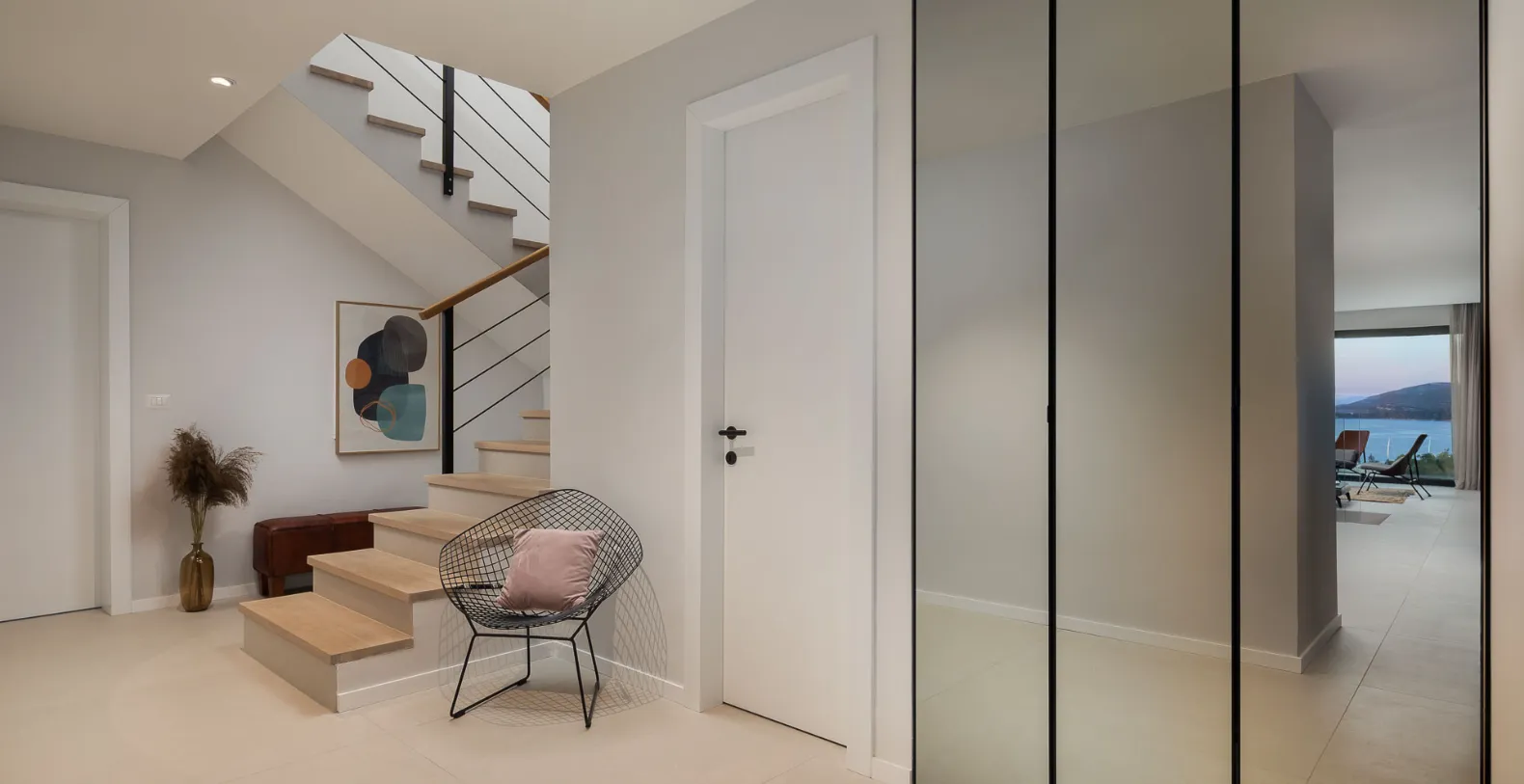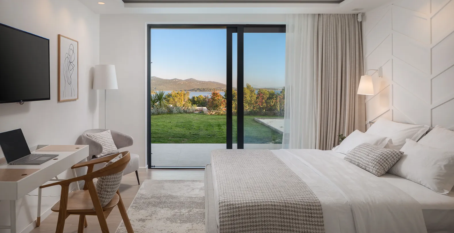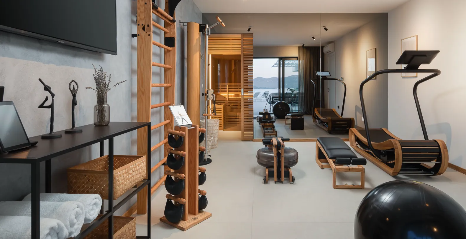 Spanning approximately 310 m² of interior space, Villa Serenity has been designed to deliver both comfort and sophistication across three levels. The main living floor features a bright, open-plan layout with a stylish lounge, fully equipped kitchen, and direct access to a sea-facing terrace. Large glass openings frame uninterrupted coastal views, creating a seamless connection between indoor and outdoor living. This level also introduces the villa’s wellness focus, with a private sauna and fully equipped gym integrated into the design.