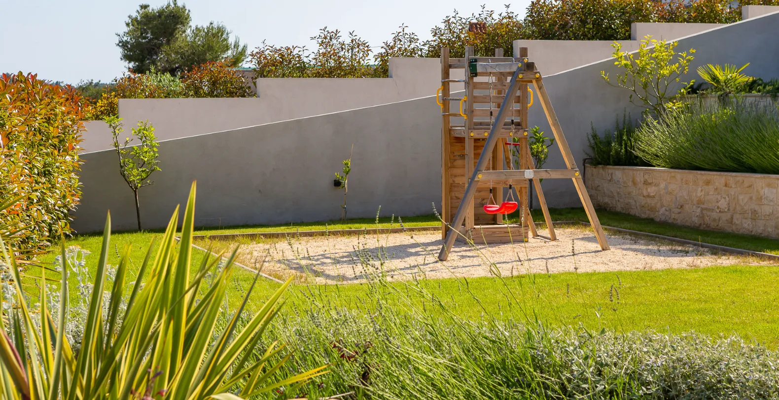 Outdoor living is thoughtfully curated for both relaxation and social moments. A heated swimming pool sits at the heart of the terrace, surrounded by sun loungers and shaded seating areas. A barbecue and outdoor dining space create the perfect setting for long, relaxed evenings, while the landscaped garden provides multiple lounge areas and a children’s playground.