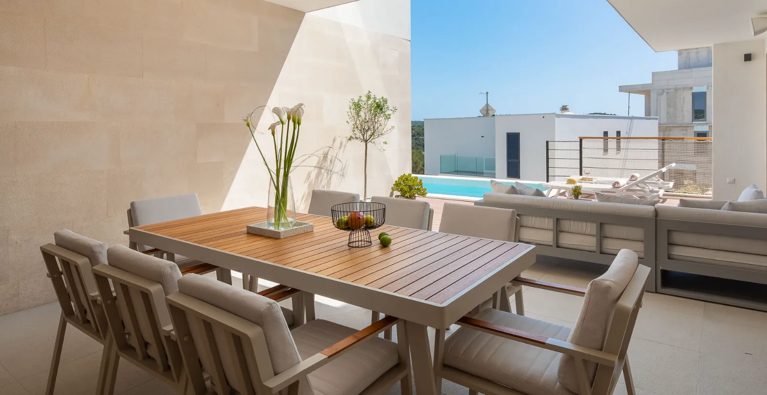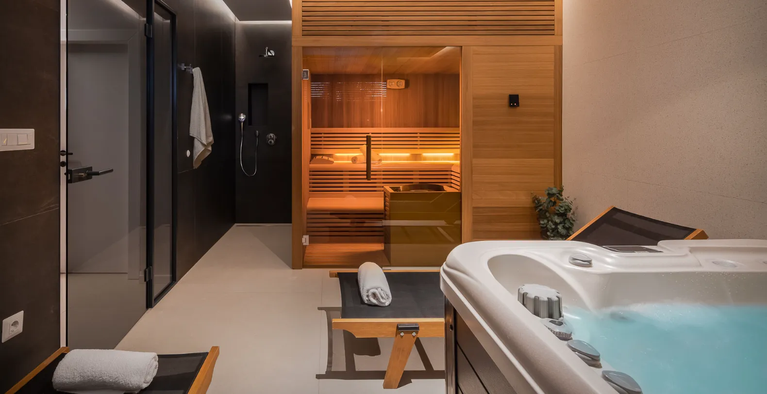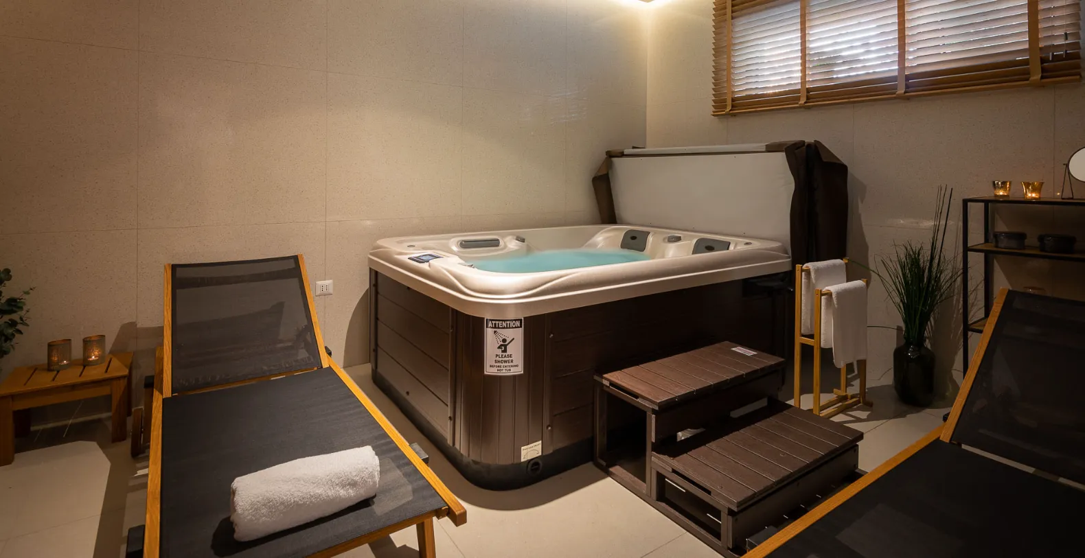 The exterior is designed for complete relaxation, centered around a private heated swimming pool with a sun deck and comfortable loungers. Whether enjoying morning swims or sunset aperitifs, this outdoor space becomes the heart of the villa. Villa Solace also features a private wellness zone, a dedicated spa zone with a jacuzzi, sauna, and fully equipped gym, allowing guests to unwind, recharge, and maintain their routines in complete privacy.