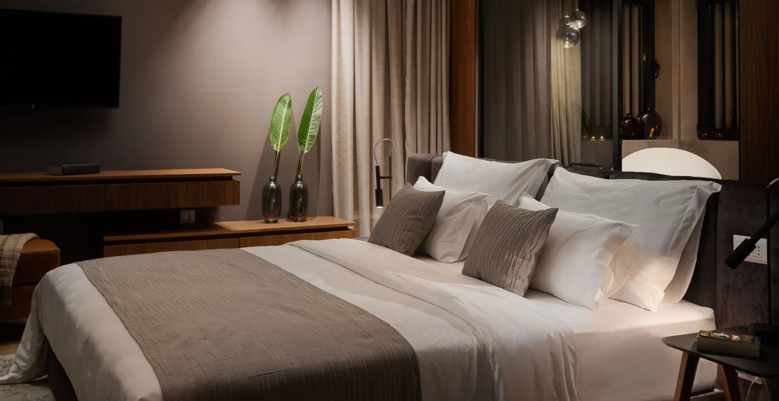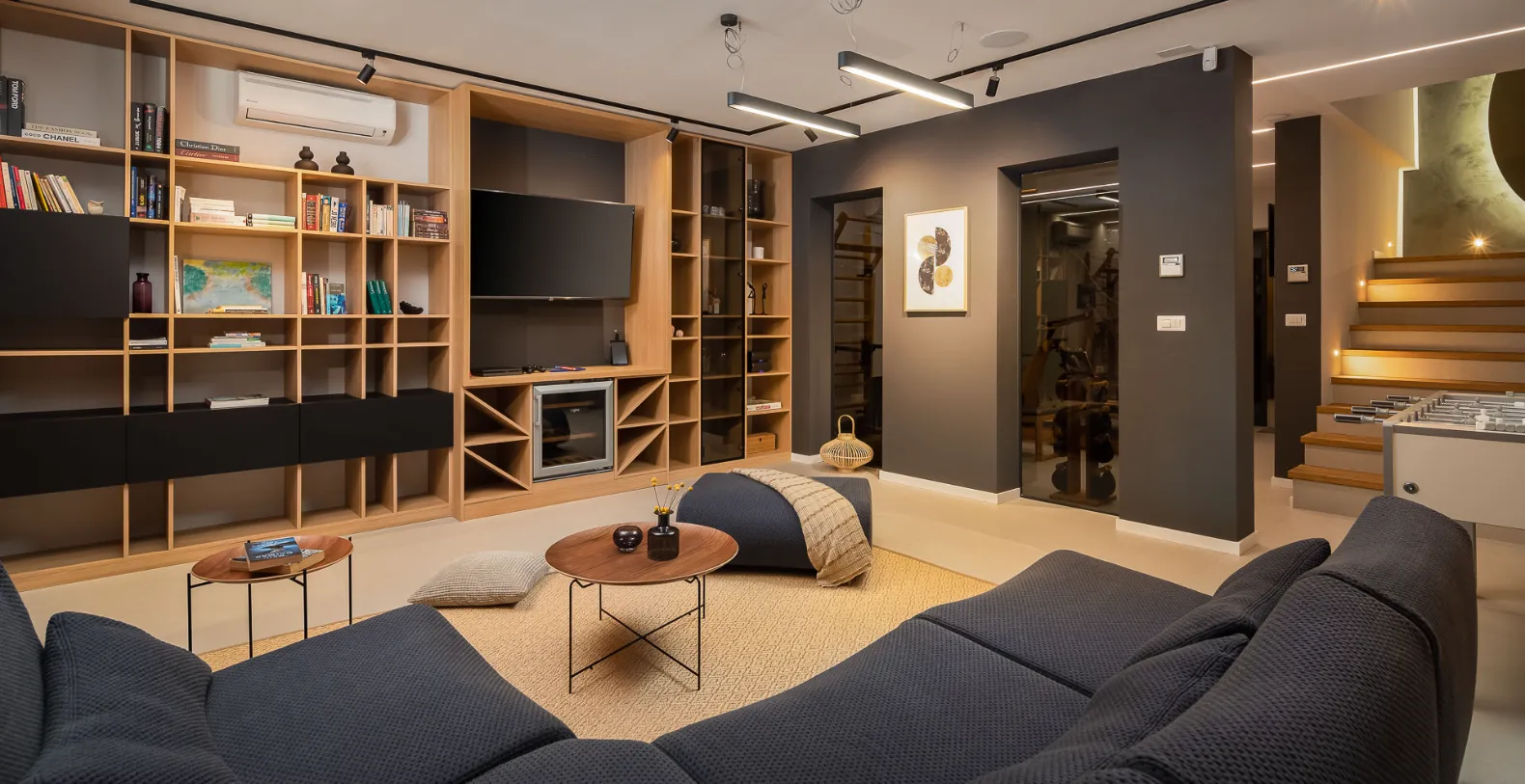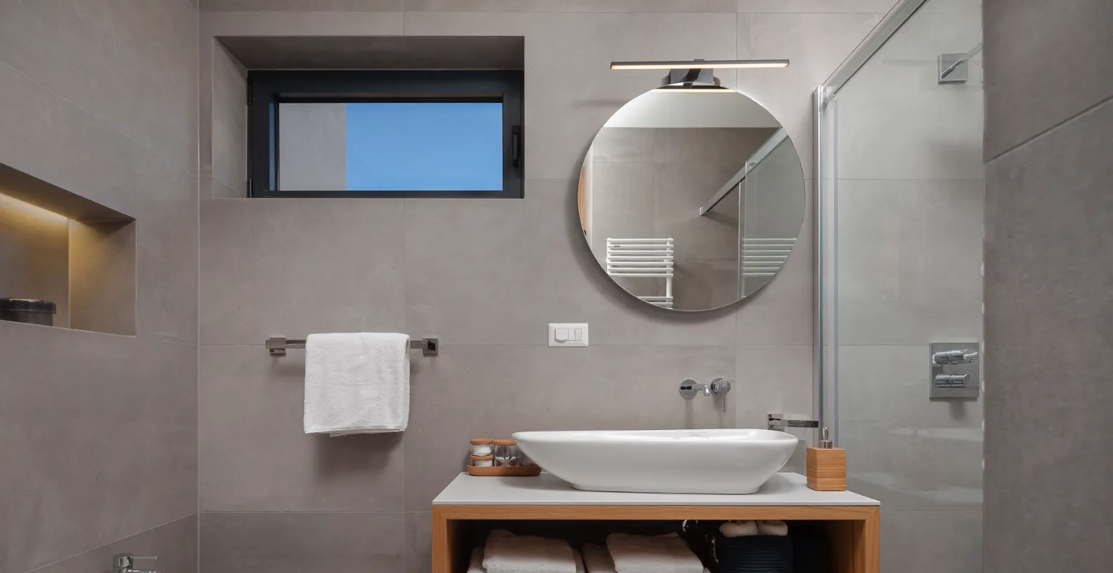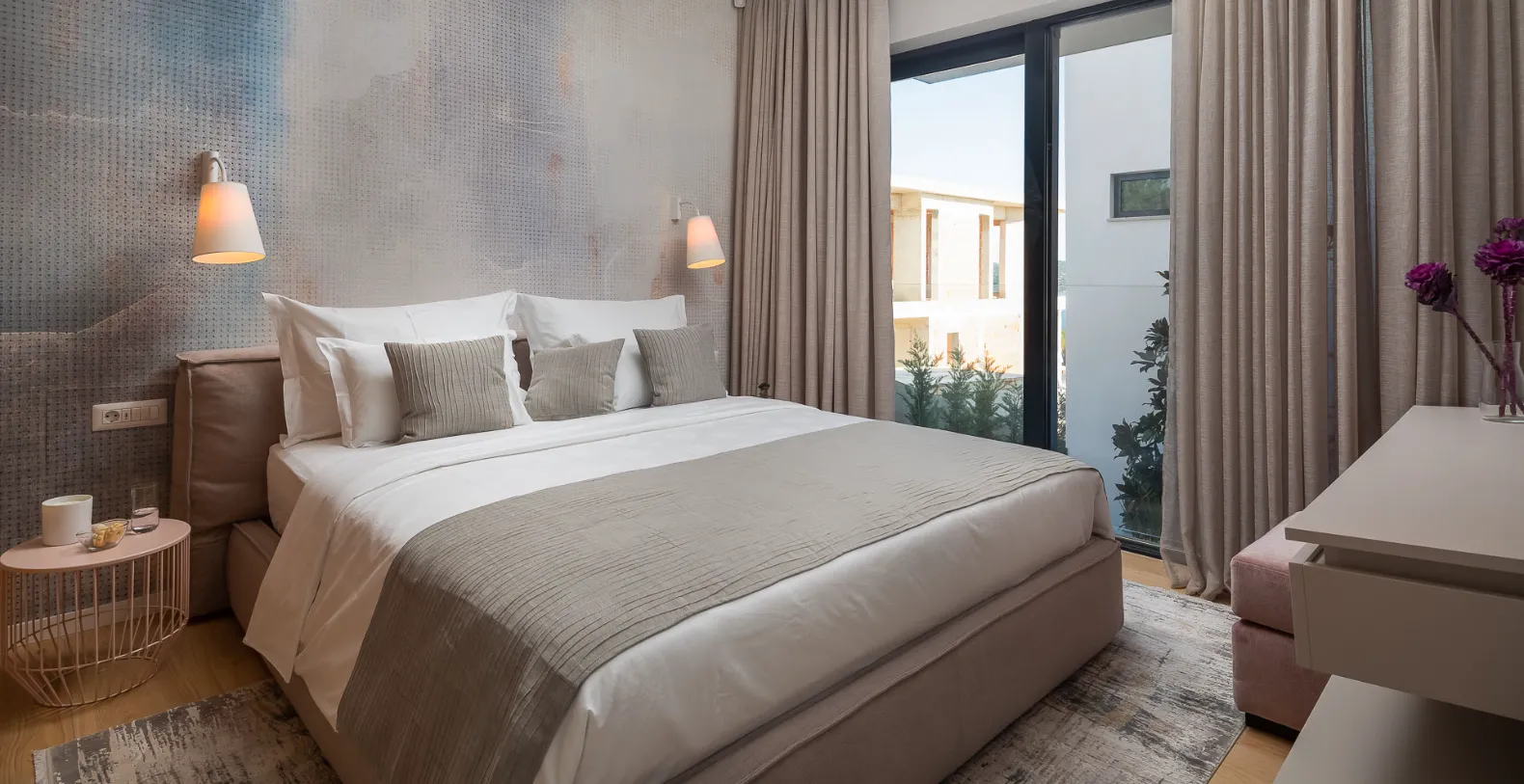 The exterior is designed for complete relaxation, centered around a private heated swimming pool with a sun deck and comfortable loungers. Whether enjoying morning swims or sunset aperitifs, this outdoor space becomes the heart of the villa. Villa Solace also features a private wellness zone, a dedicated spa zone with a jacuzzi, sauna, and fully equipped gym, allowing guests to unwind, recharge, and maintain their routines in complete privacy.