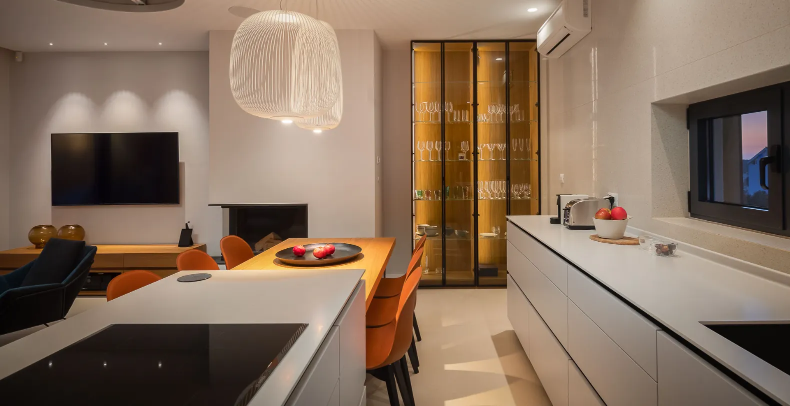 On the ground floor, guests will find a spacious living room with a cozy fireplace, a fully equipped modern kitchen, and an additional ensuite bedroom. This level opens seamlessly onto a semi-covered terrace, where indoor and outdoor living come together effortlessly. An outdoor kitchen and dining area provide the perfect setting for long, relaxed meals overlooking the Adriatic landscape. Should guests desire to elevate their dining experience any further private chef could be arranged for the duration of the stay.