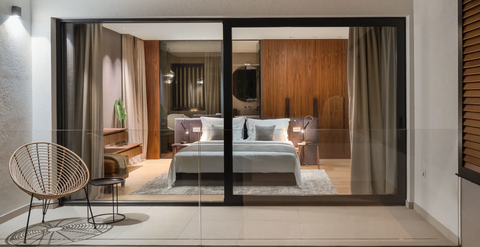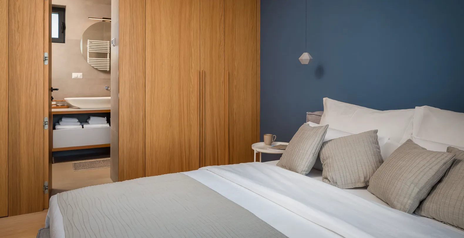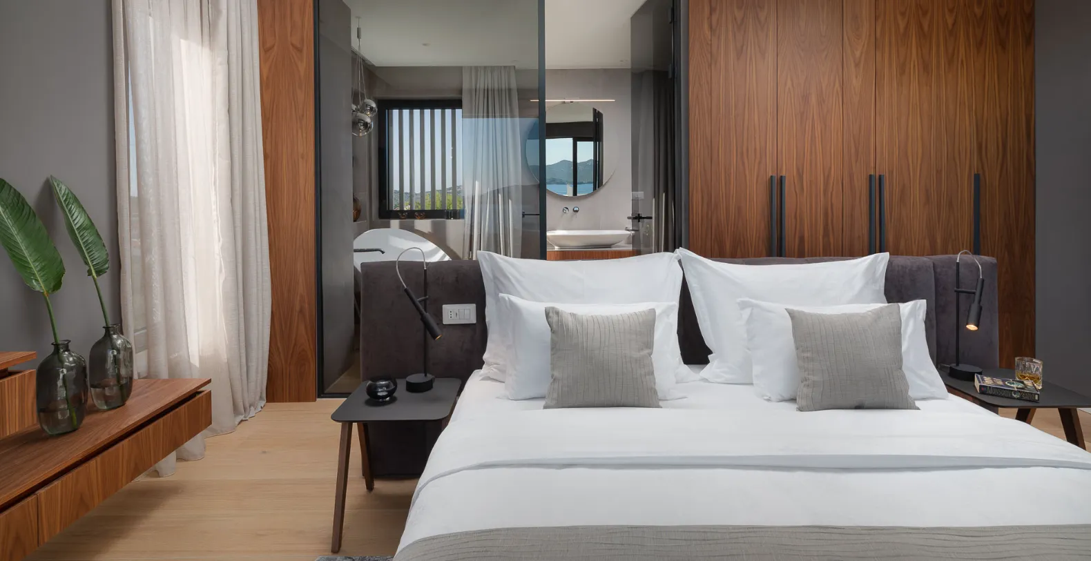Spanning approximately 360 m² of refined interior space, Villa Solace accommodates up to 8 guests across four beautifully appointed bedrooms, each with its own ensuite bathroom. One bedroom is located on the ground floor and three additional bedrooms can be found on the first floor of the villa. This level also features a bright and airy living space with a kitchenette, a elegant common space.