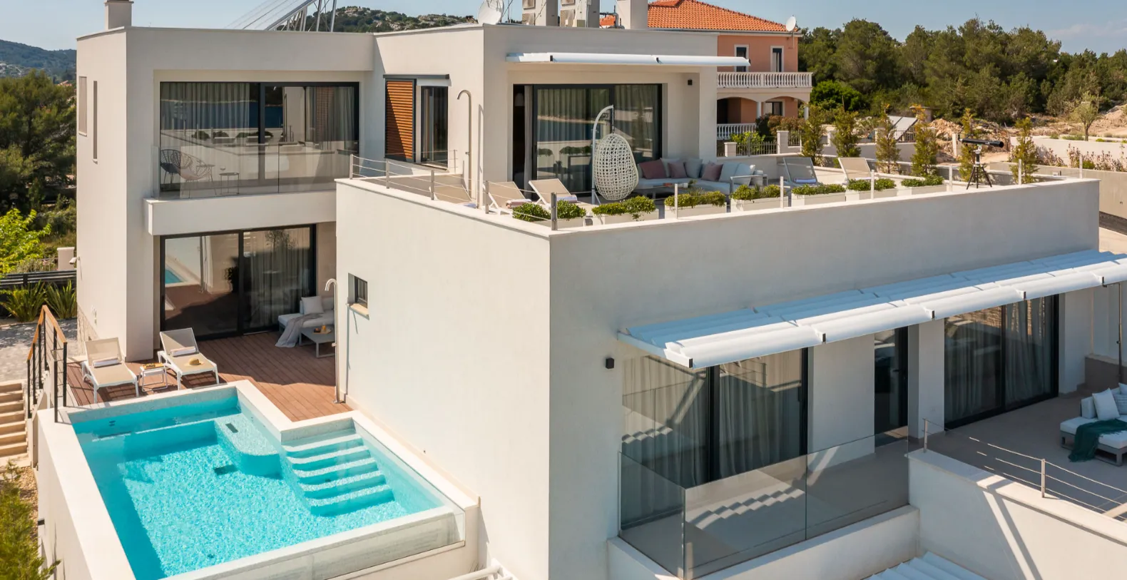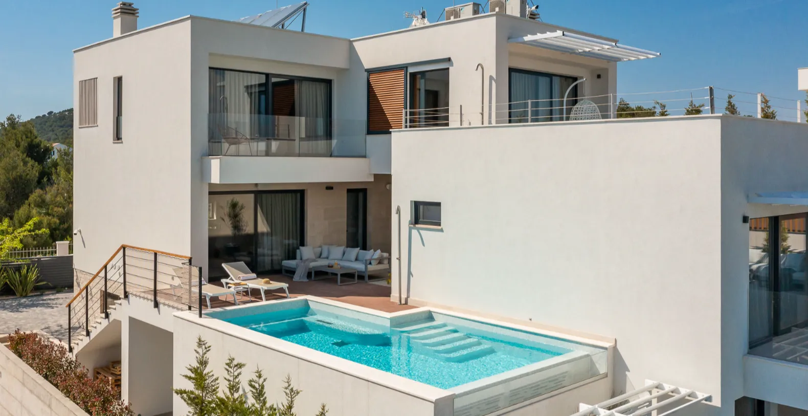 Villa Solace is a contemporary luxury vacation rental on Murter Island, Croatia offering a private spa experience and stunning sea views. Set in the peaceful coastal village of Jezera, this elegant seafront retreat blends modern design with a relaxed Mediterranean atmosphere, just moments from the crystal-clear waters of the Adriatic. Positioned only 100 meters from the sea, the villa delivers both privacy and effortless access to the beach.