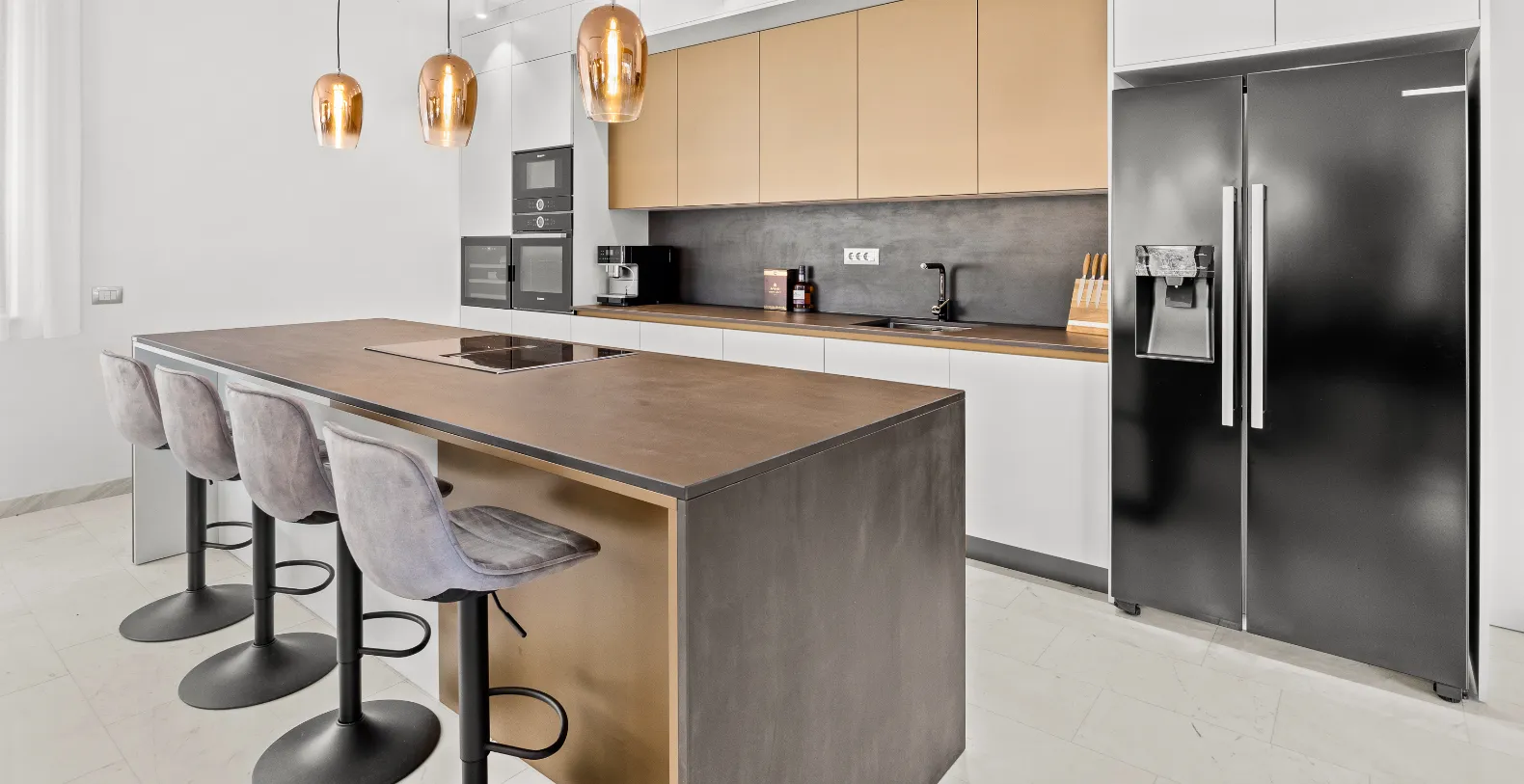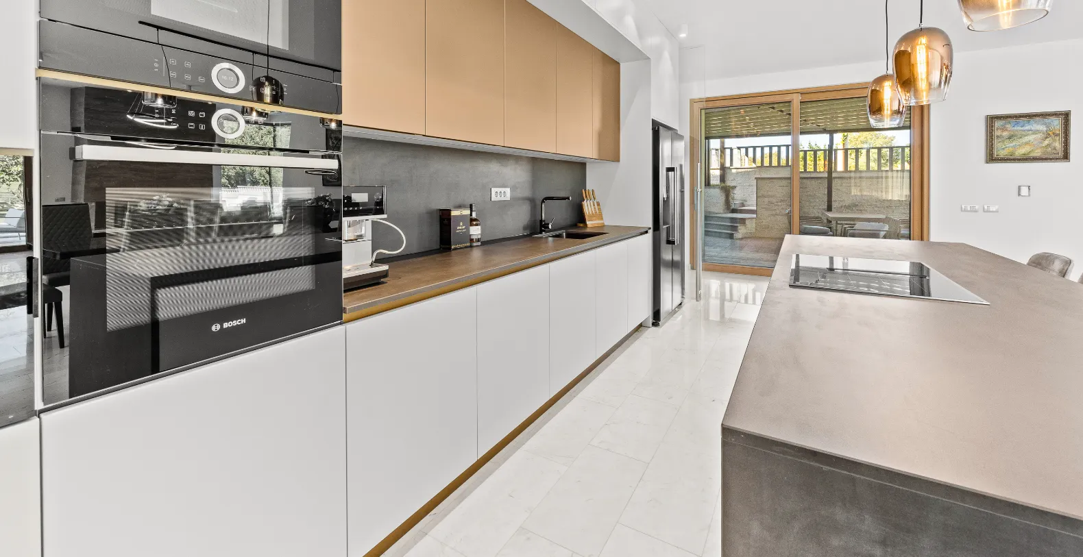 The villa is thoughtfully designed to embrace seamless indoor-outdoor living, with expansive glass surfaces allowing natural light to flow through every space. The ground floor serves as the social heart of the home, featuring a spacious open-plan living room, elegant dining area, and a fully equipped modern kitchen with a central island. From here, large sliding doors open directly onto a generous terrace, where guests can enjoy lounging areas, al fresco dining, and a private swimming pool surrounded by landscaped greenery.