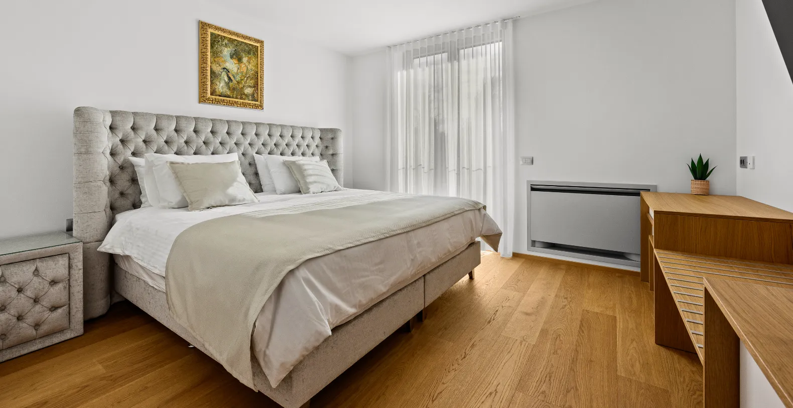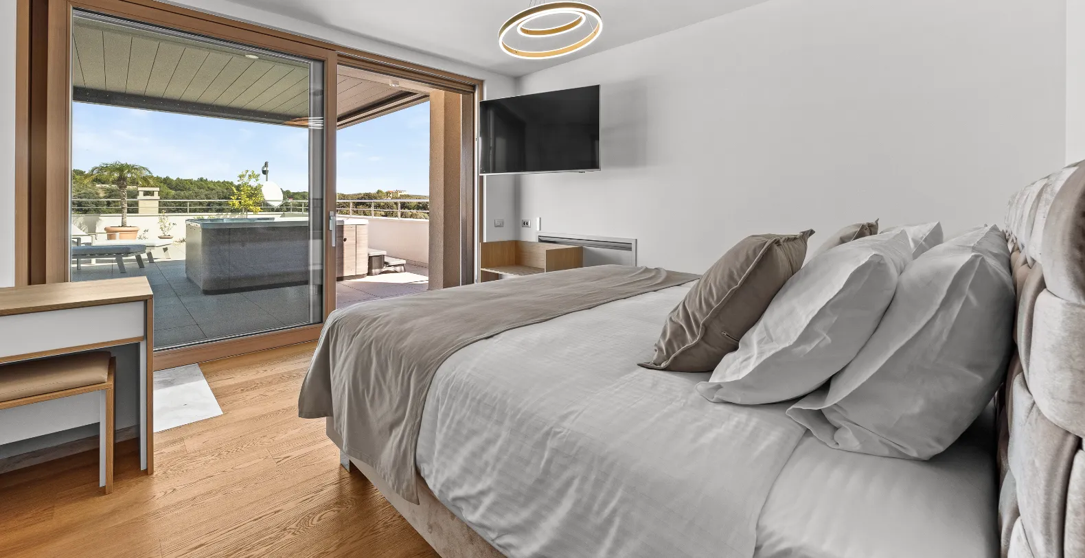 Villa Spirit accommodates up to 10 guests across five beautifully appointed bedrooms, each offering a king-size bed, ensuite bathroom, minibar, and access to a private terrace. Four bedrooms are located on the first floor, designed for comfort and privacy, while the master suite elevates the experience with its exclusive rooftop terrace. This private sanctuary features a jacuzzi, kitchenette, and lounge area—perfect for sunset moments overlooking the sea.