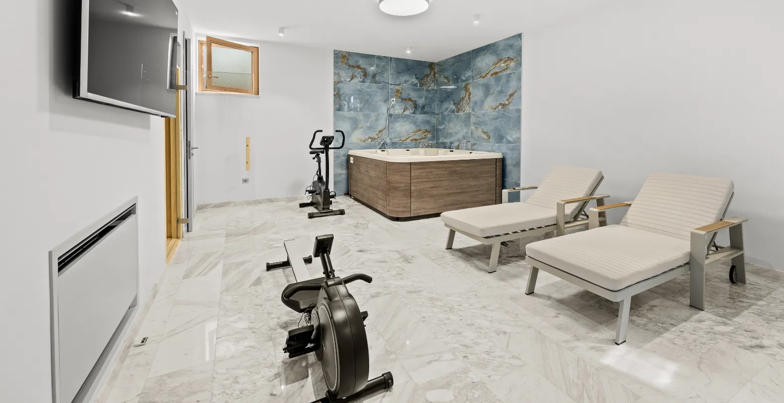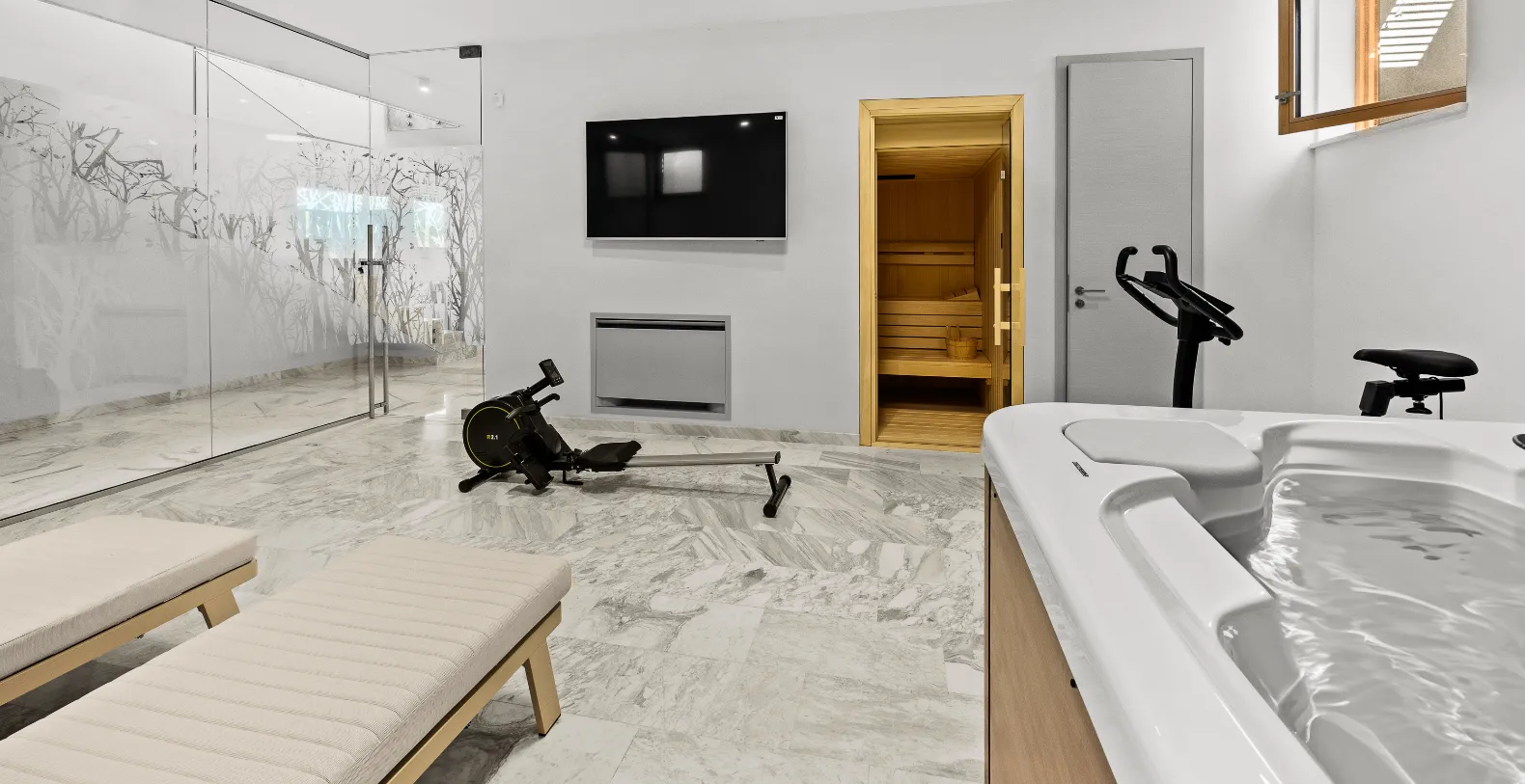 Wellness is an integral part of the villa experience. On the ground level, guests will find a dedicated relaxation zone complete with a sauna, jacuzzi, and fitness equipment, allowing for a balanced stay that combines leisure and wellbeing in total privacy.