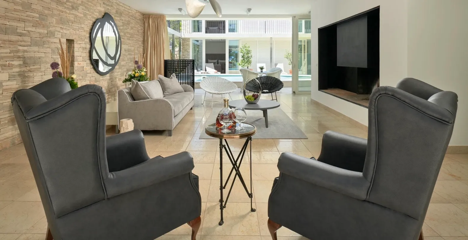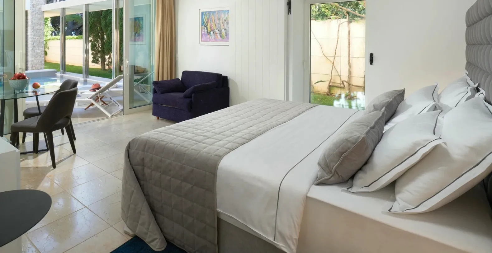 At the heart of the property lies a beautiful private swimming pool, discreetly nestled within the inner courtyard between the two residences. The surrounding terrace is paved with authentic Brač stone, creating a timeless Mediterranean ambiance where guests can relax under the Croatian sun, swim in complete privacy, or enjoy peaceful afternoons in the outdoor lounge areas.