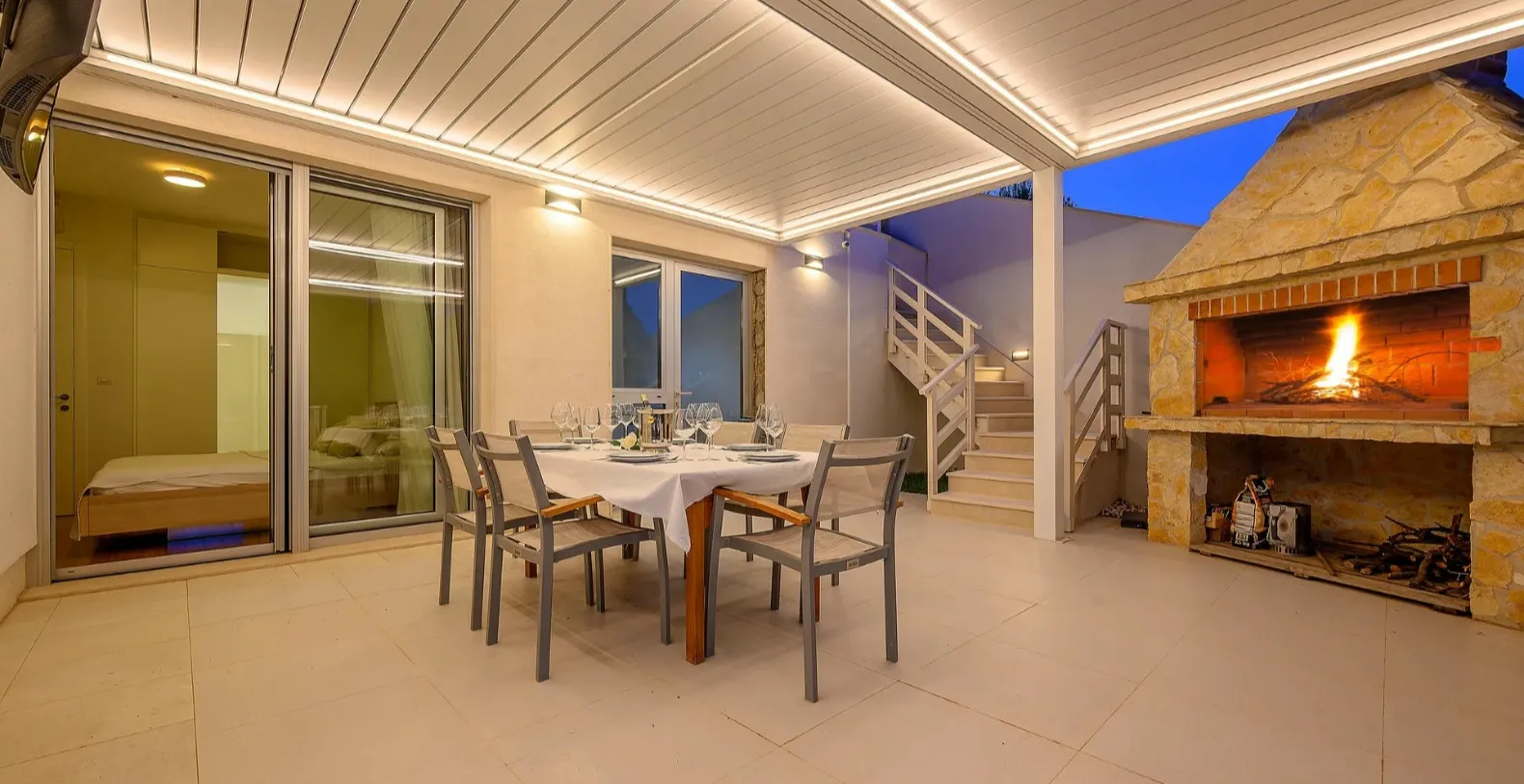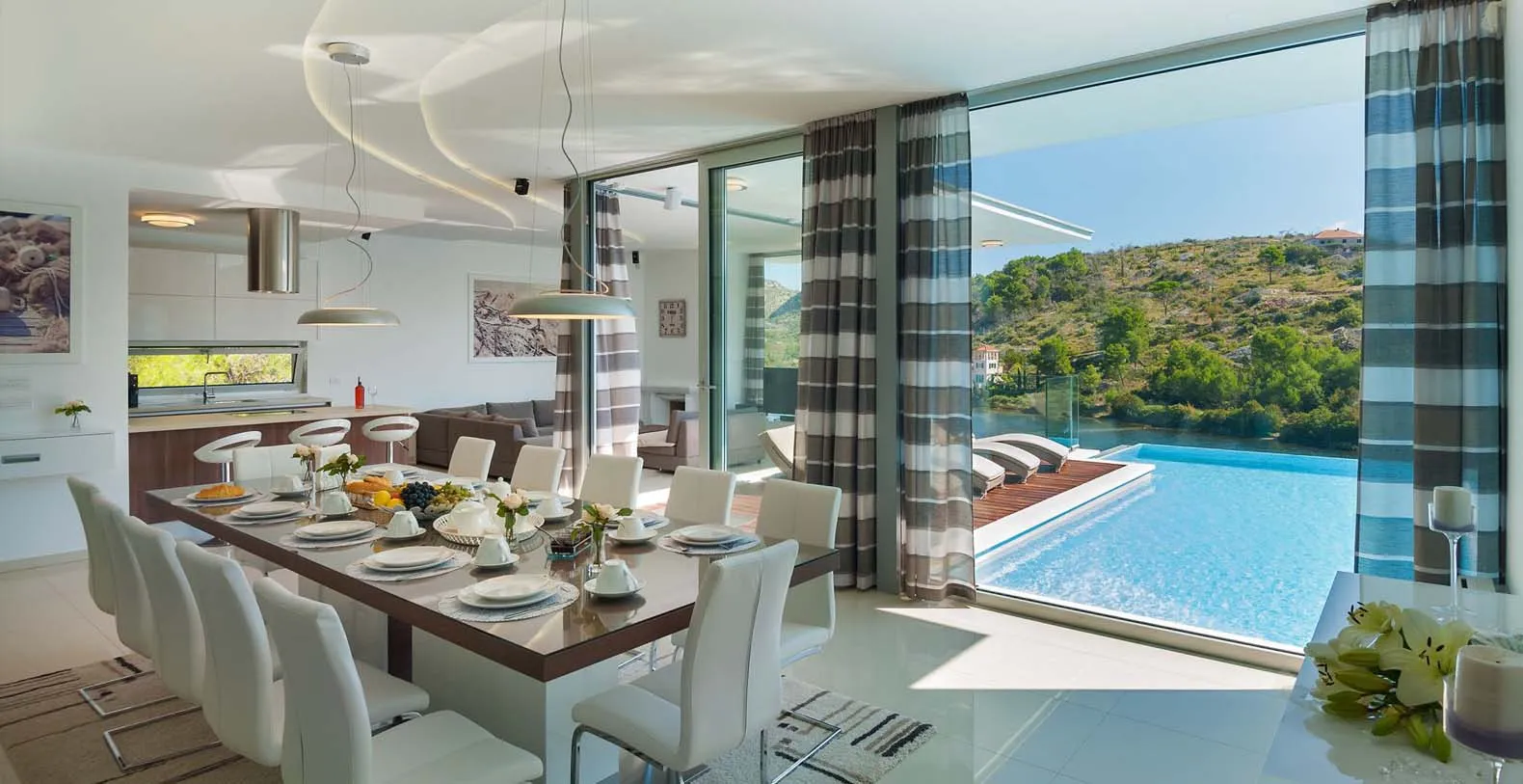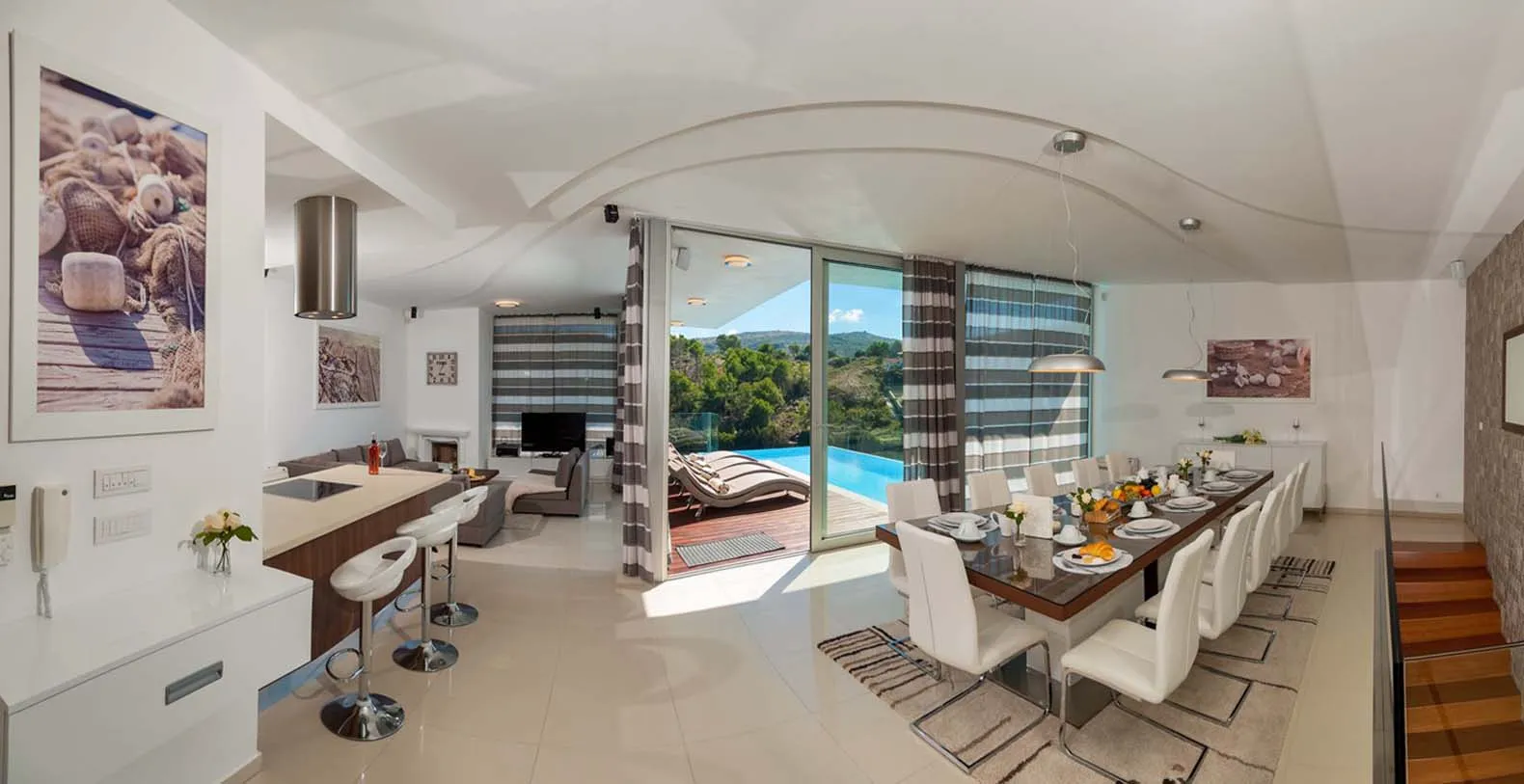 From the rear of the villa the main entrance is at ground level but from the front it is on the second floor. In front of the main entrance, in case you would like to stay more active, you will find a table tennis and darts, as well as bicycles which can be very handy and practical if you like to explore island a little bit more. When entering the villa, you enter the main living area which has a stunning view over the glittering bay. There you will find yourself inside a spacious area divided in several parts; fully equipped kitchen, dining and living room with cozy and comfortable modern sofas, stylish artwork and satellite TV and DVD, while large glass sliding doors connect it to the outdoor, heated swimming pool with several sun loungers, which maximizes the enjoyment of the stunning view of the entire bay and the fishing village.