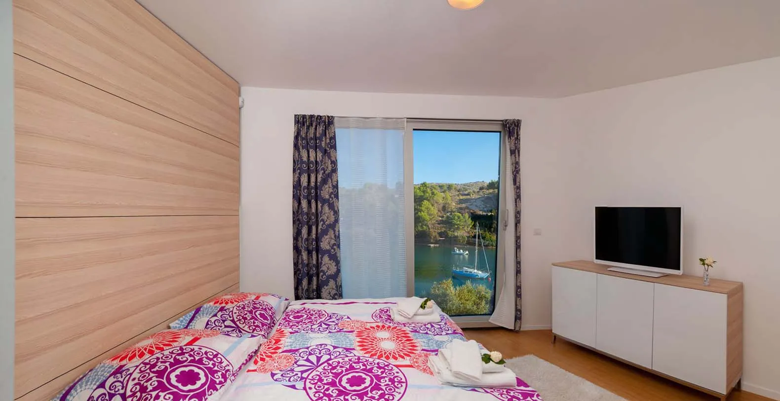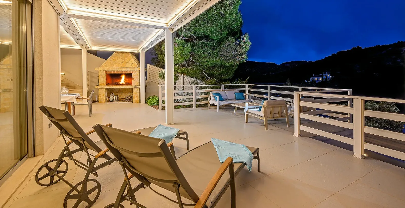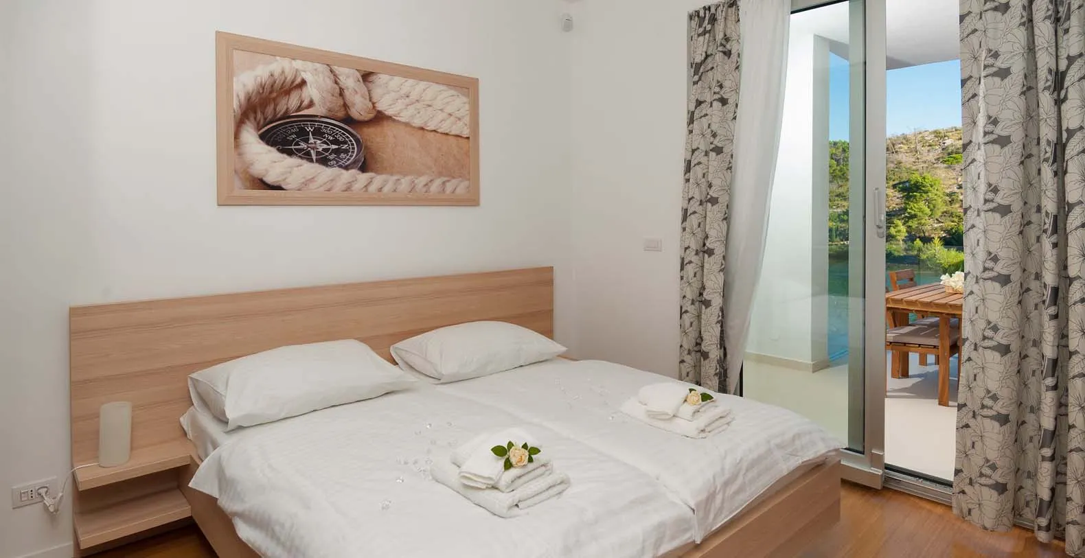 From the rear of the villa the main entrance is at ground level but from the front it is on the second floor. In front of the main entrance, in case you would like to stay more active, you will find a table tennis and darts, as well as bicycles which can be very handy and practical if you like to explore island a little bit more. When entering the villa, you enter the main living area which has a stunning view over the glittering bay. There you will find yourself inside a spacious area divided in several parts; fully equipped kitchen, dining and living room with cozy and comfortable modern sofas, stylish artwork and satellite TV and DVD, while large glass sliding doors connect it to the outdoor, heated swimming pool with several sun loungers, which maximizes the enjoyment of the stunning view of the entire bay and the fishing village.