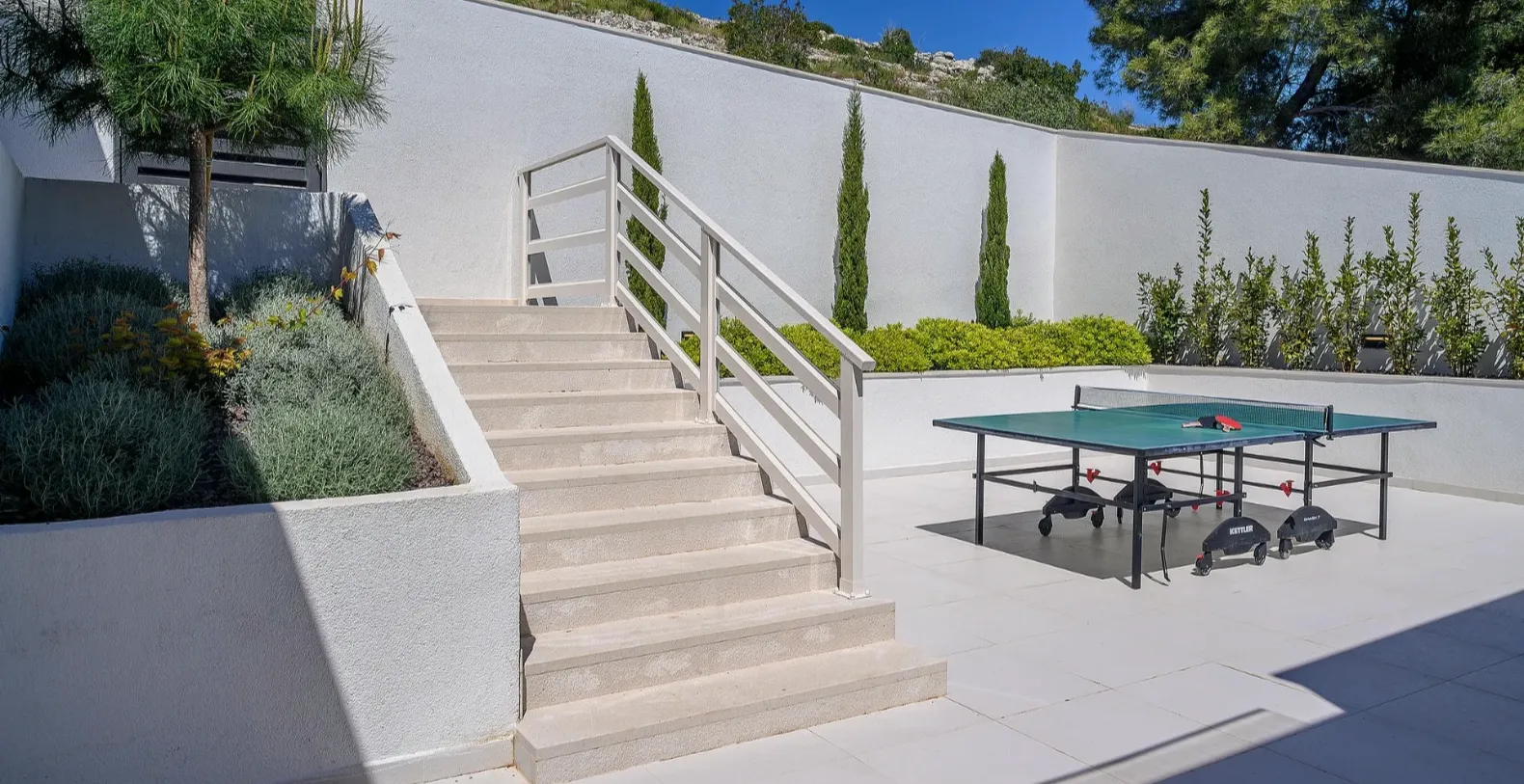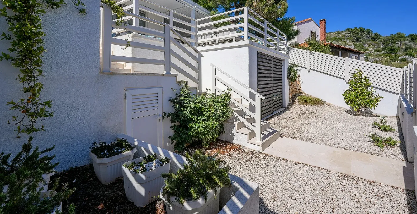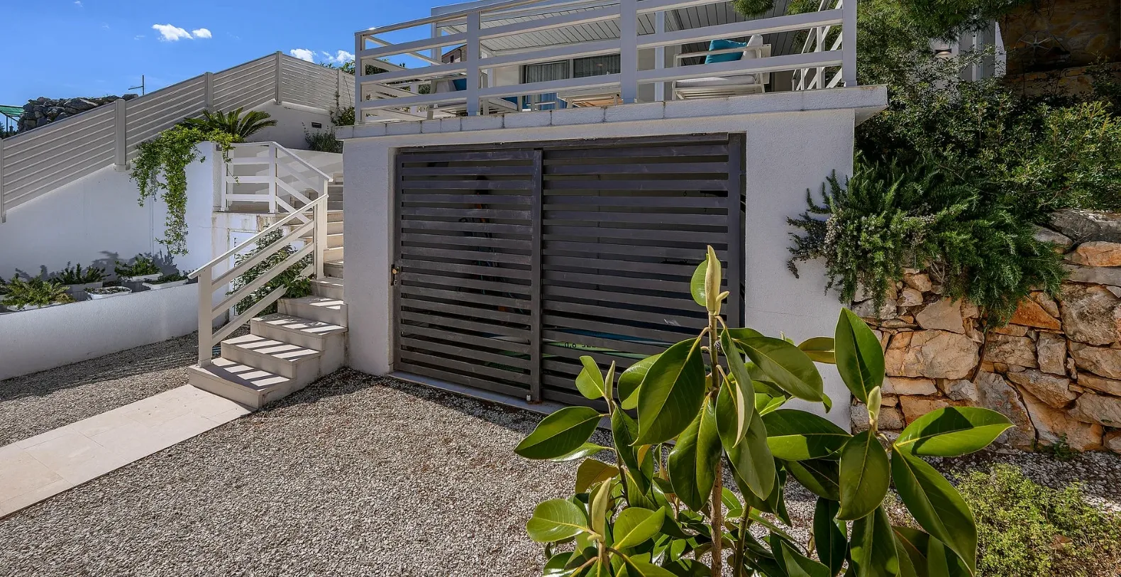 The ground floor comprises two double bedrooms with en suite bathrooms, each opening out onto the villa's courtyard. Nearby is a summer kitchen, ideal for al fresco dining. The villa has a terraced garden, which is partly paved with white local stone, and the bottom of the garden is covered in lawn with a gate that opens out directly onto a private flat rock beach. On the terrace, there is a covered area with an outdoor table and chairs. The villa has a private garage for two cars. In all, it is a unique villa.