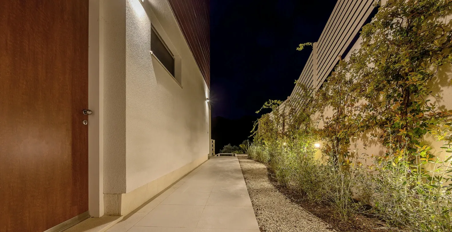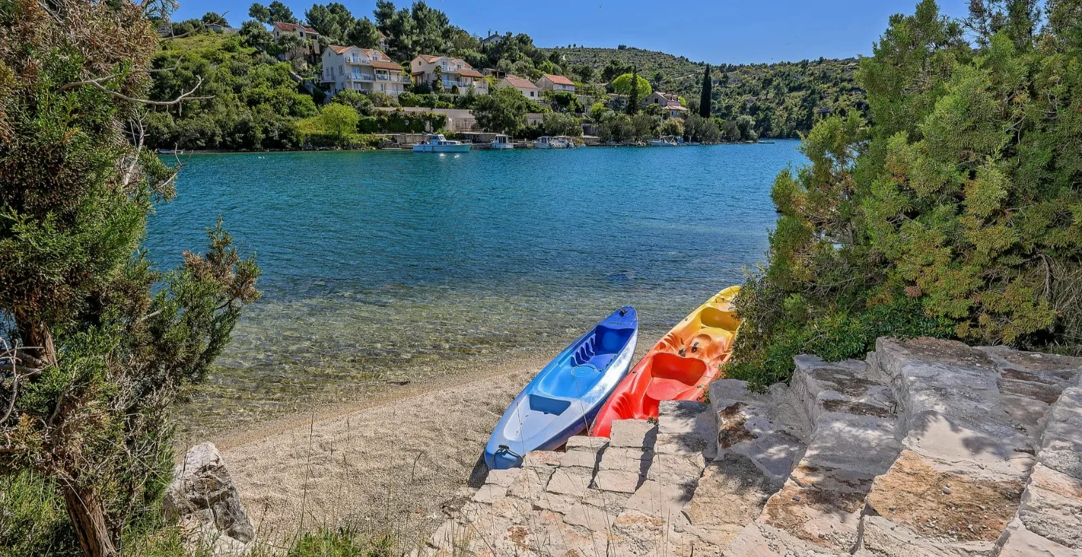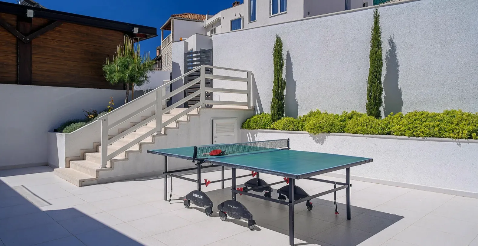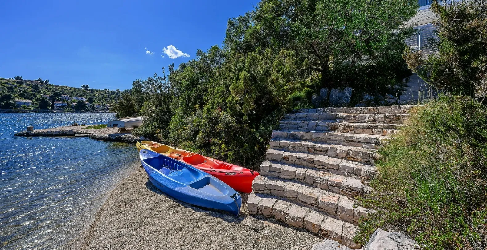 The ground floor comprises two double bedrooms with en suite bathrooms, each opening out onto the villa's courtyard. Nearby is a summer kitchen, ideal for al fresco dining. The villa has a terraced garden, which is partly paved with white local stone, and the bottom of the garden is covered in lawn with a gate that opens out directly onto a private flat rock beach. On the terrace, there is a covered area with an outdoor table and chairs. The villa has a private garage for two cars. In all, it is a unique villa.