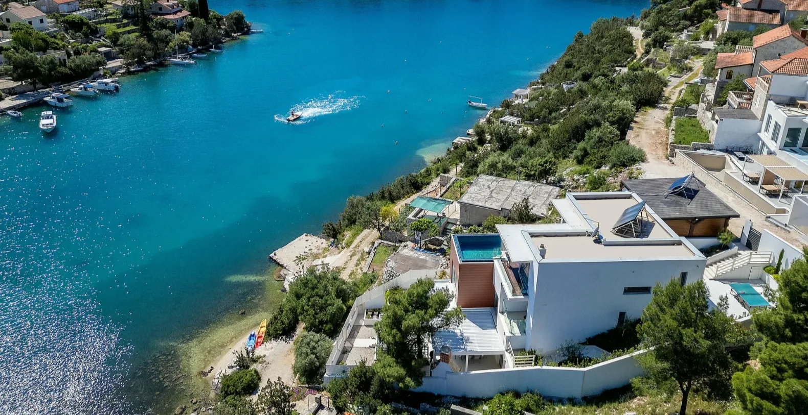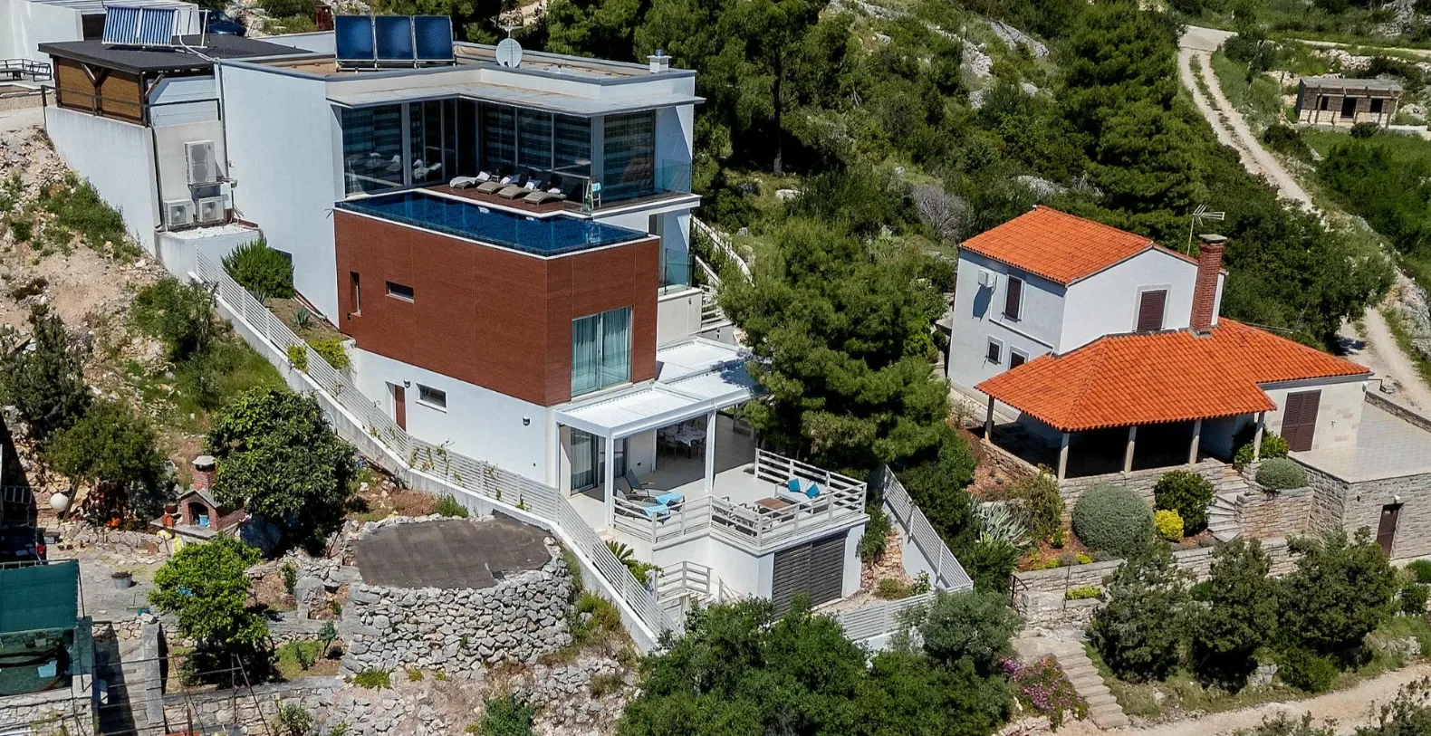 Villa Infinity in Bobovisca, Island Brac is ideal summer vacation rental, situated just steps from the crystal clear blue Adriatic Sea. Bobovisca is small but very pretty fishing village where old and new villas line up spaciously along a lovely bay. Characterized by its unique design, this strikingly contemporary villa offers unbeatable style, functionality and boasts stunning sea views.