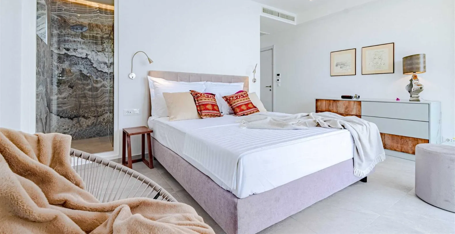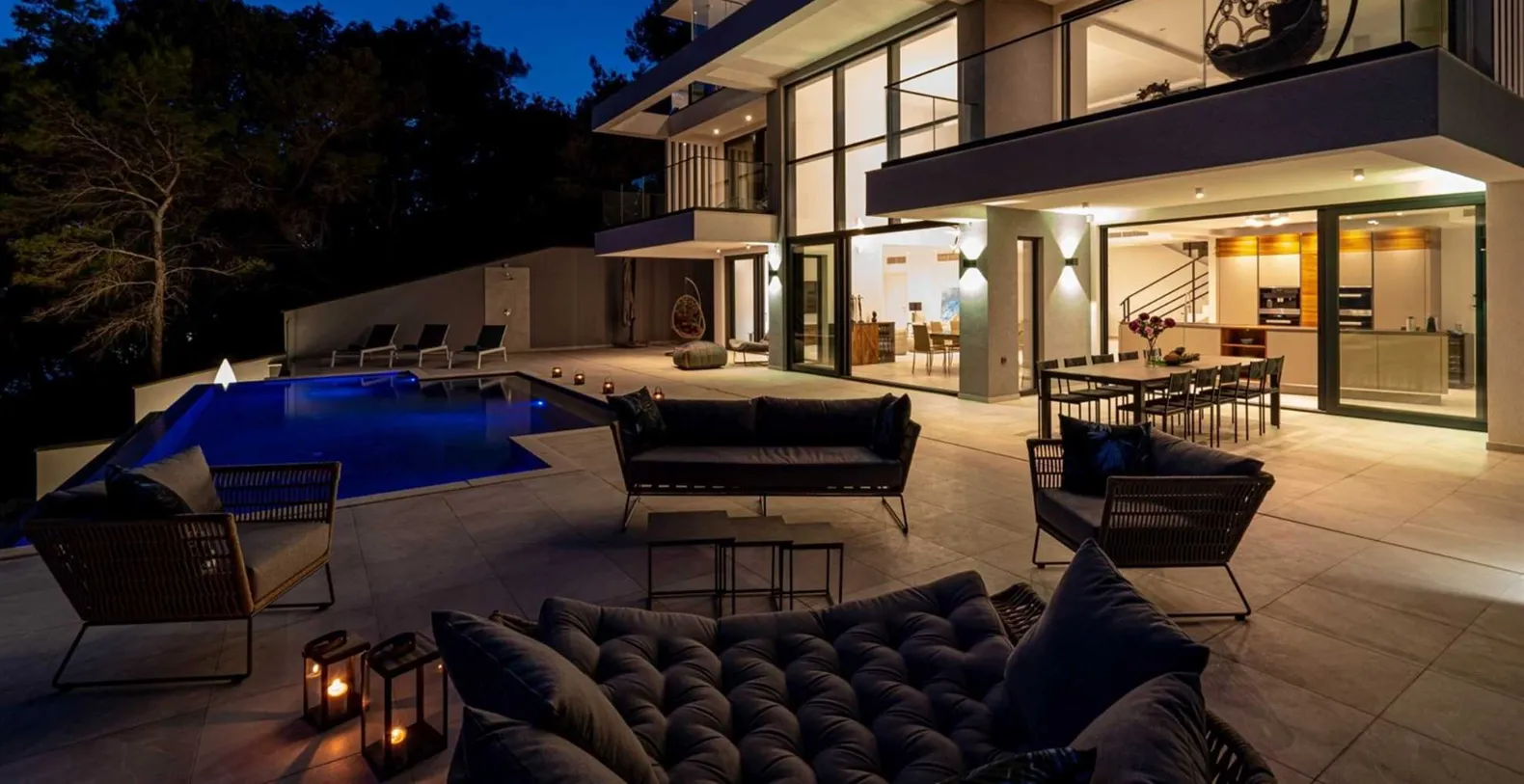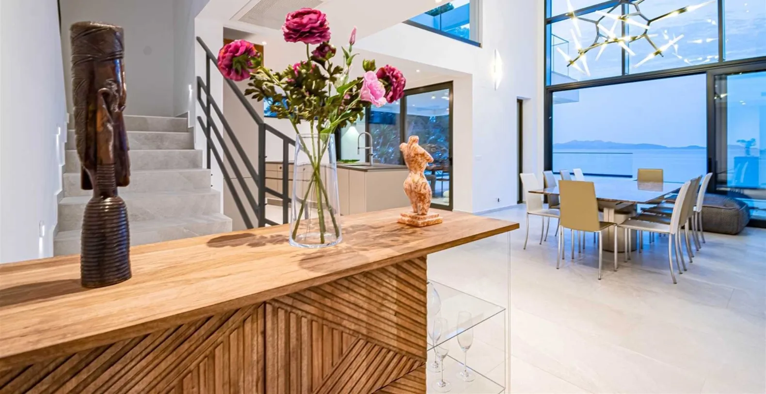 Spread across 1,000 square meters of property, with 500 square meters of stylish interiors, the villa was thoughtfully crafted to host up to 12 guests in absolute comfort. The villa has six bedrooms, all with king-size beds and en-suite bathrooms featuring walk-in showers. Bedrooms are spread between different floors, and the ground floor houses one bedroom with an en-suite bathroom and direct access to the pool terrace. The first floor consists of a king-size bedroom with an en-suite bathroom and sea views. Three more bedrooms, all with king-size beds are placed on the second floor and the sixth bedroom is located on a lower ground floor, closer to the sea. The villa’s interior is modern and gravitates around the open-plan flow. Contemporary design anchored by oversized sliding doors that open the living area directly onto the terrace. The spacious living area includes a plush lounge, a modern dining space, and a sleek, fully equipped kitchen that caters as easily to casual meals as it does to gourmet dinners. The entire home is fully air-conditioned and features underfloor heating for comfort in all seasons. High-speed Wi-Fi and LCD TVs are available throughout, and private parking is included.