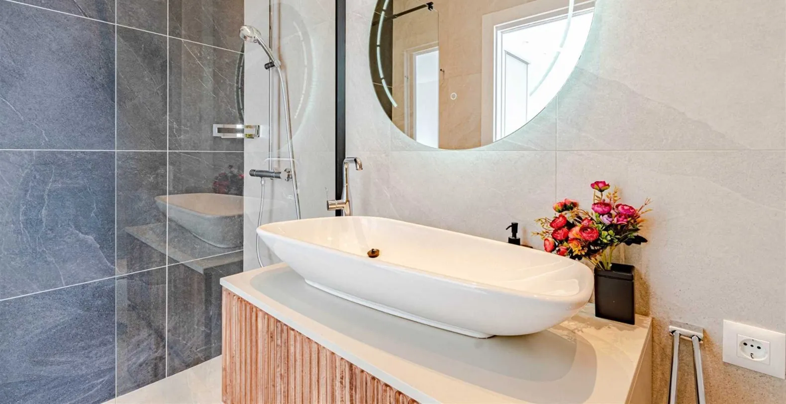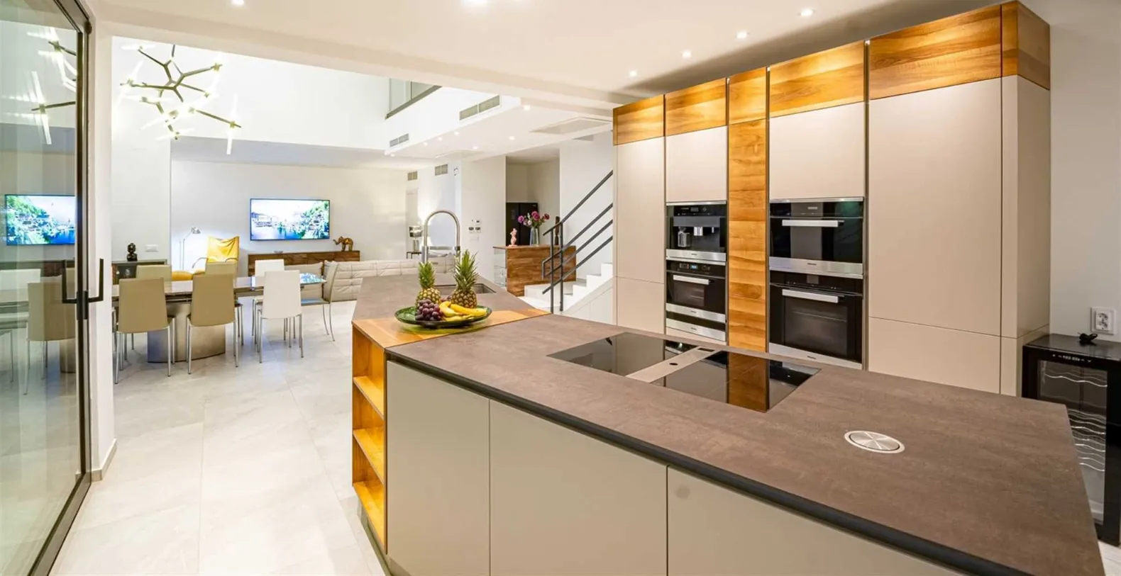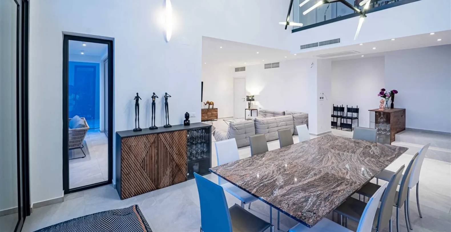 Spread across 1,000 square meters of property, with 500 square meters of stylish interiors, the villa was thoughtfully crafted to host up to 12 guests in absolute comfort. The villa has six bedrooms, all with king-size beds and en-suite bathrooms featuring walk-in showers. Bedrooms are spread between different floors, and the ground floor houses one bedroom with an en-suite bathroom and direct access to the pool terrace. The first floor consists of a king-size bedroom with an en-suite bathroom and sea views. Three more bedrooms, all with king-size beds are placed on the second floor and the sixth bedroom is located on a lower ground floor, closer to the sea. The villa’s interior is modern and gravitates around the open-plan flow. Contemporary design anchored by oversized sliding doors that open the living area directly onto the terrace. The spacious living area includes a plush lounge, a modern dining space, and a sleek, fully equipped kitchen that caters as easily to casual meals as it does to gourmet dinners. The entire home is fully air-conditioned and features underfloor heating for comfort in all seasons. High-speed Wi-Fi and LCD TVs are available throughout, and private parking is included.