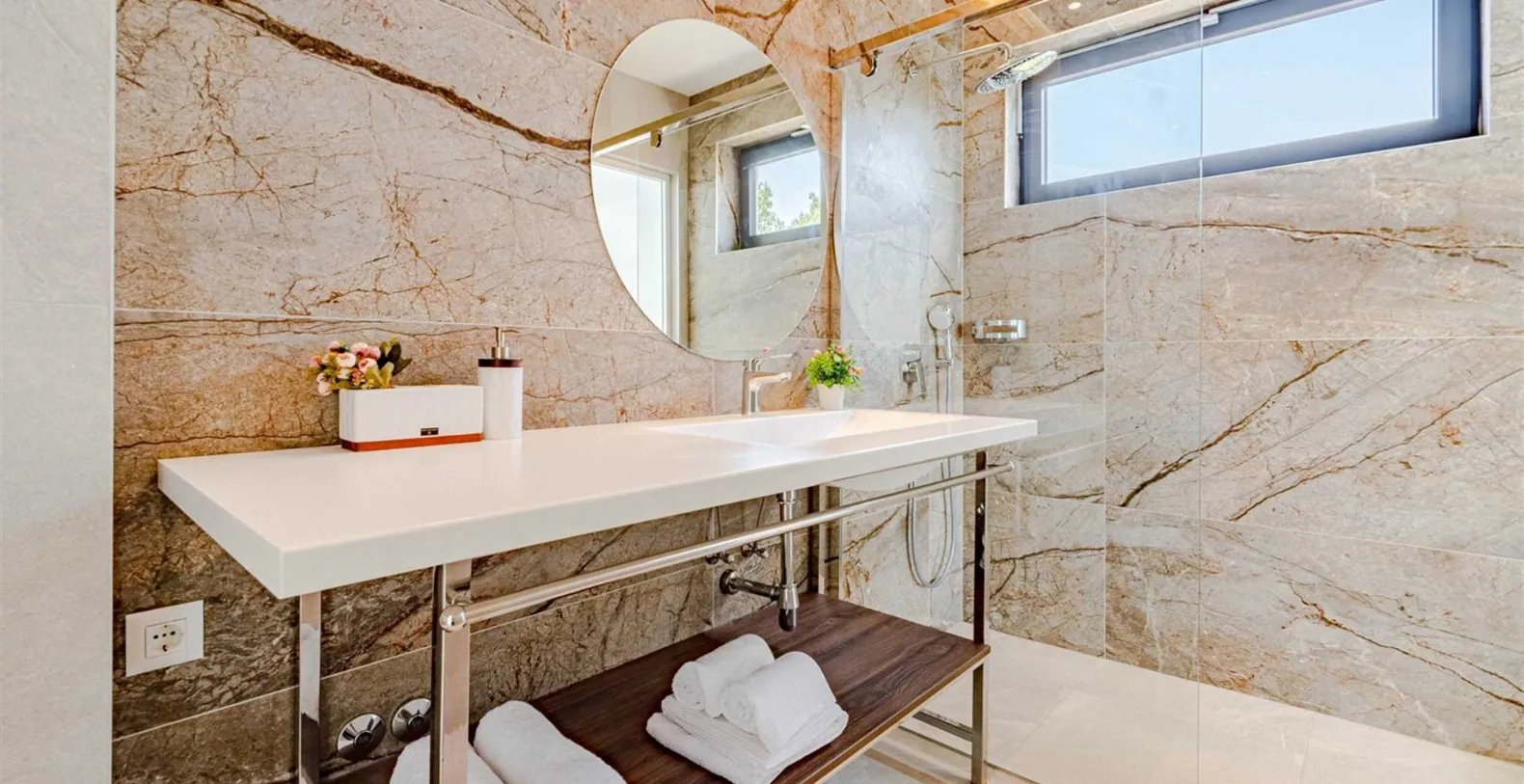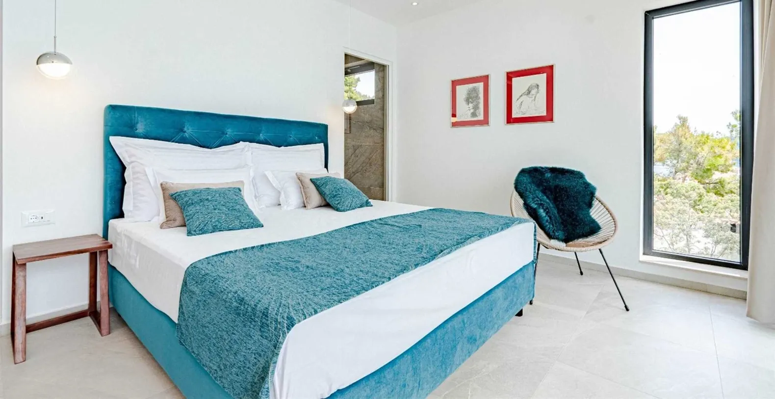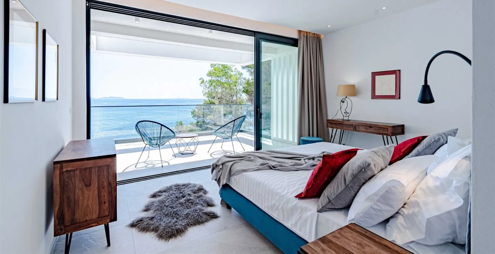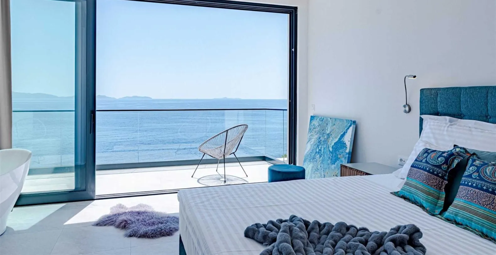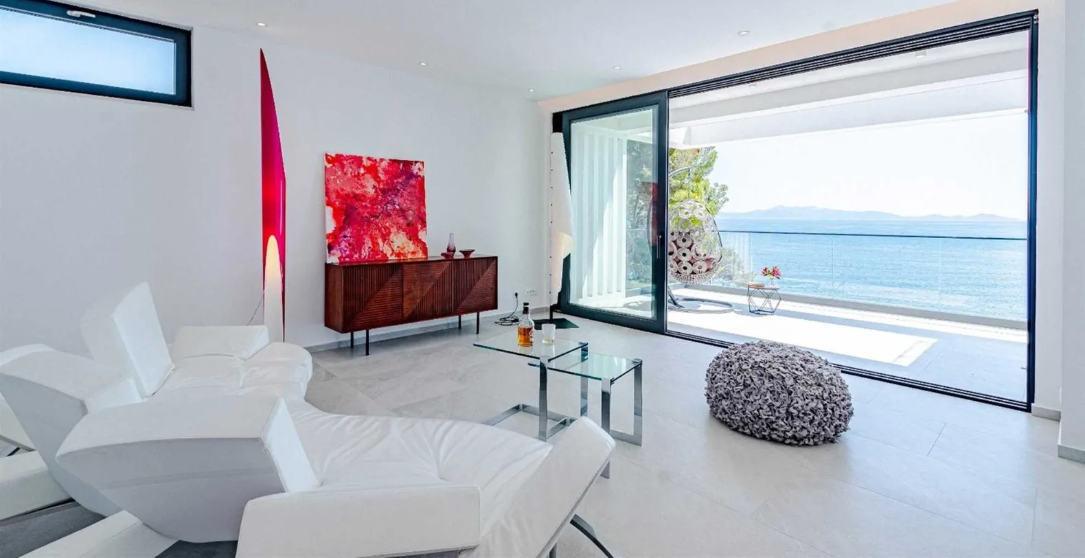 Villa S’s living area provides direct access with the shimmering 50-square-meter infinity pool that appears to spill right into the sea. Framed by a sleek stone deck, this terrace is lined with chic loungers and parasols—ideal for sun-drenched afternoons. Just steps away, a separate seating area invites lazy mornings with coffee or sunset cocktails with friends. A winding path leads directly from the terrace to the rocky shoreline below, where a private sea mooring and stone sunbathing platforms await. Whether you arrive by boat or simply crave a swim in the crystal-clear water, this direct access to the sea is a rare luxury.