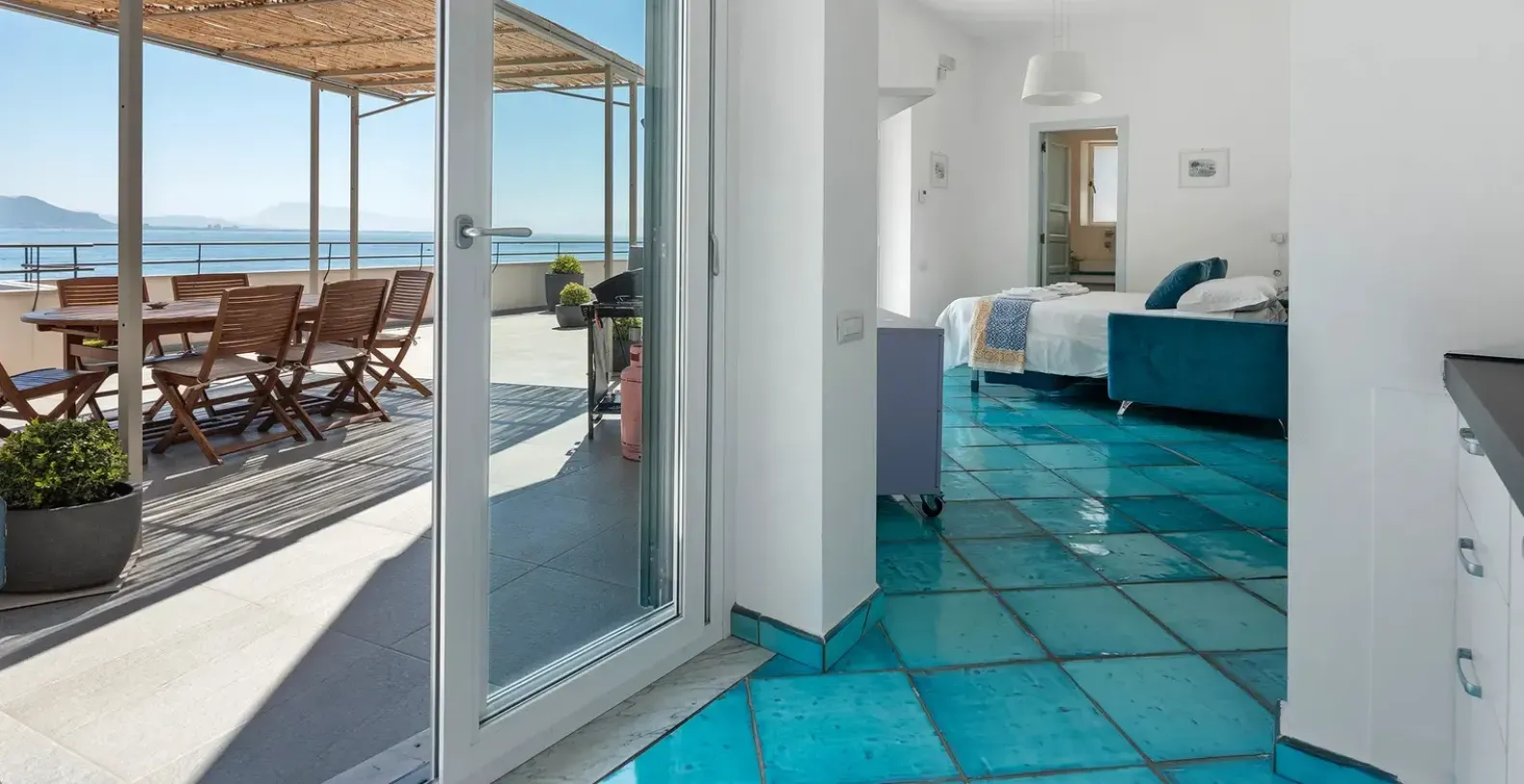 Outdoor living is at the heart of Villa Il Carrubo. Guests can enjoy relaxed al fresco dining in the fully equipped barbecue area, complemented by a traditional wood-fired oven, perfect for authentic Italian meals under the Mediterranean sky. The terraces and outdoor lounges invite slow, sun-drenched days and peaceful evenings surrounded by nature. Inside, the villa offers a welcoming and spacious living room designed for gathering and relaxation, paired with a fully equipped kitchen suitable for both casual family meals and gourmet experiences. The interiors are bright, airy, and thoughtfully styled, reflecting the understated elegance of coastal Italian living.