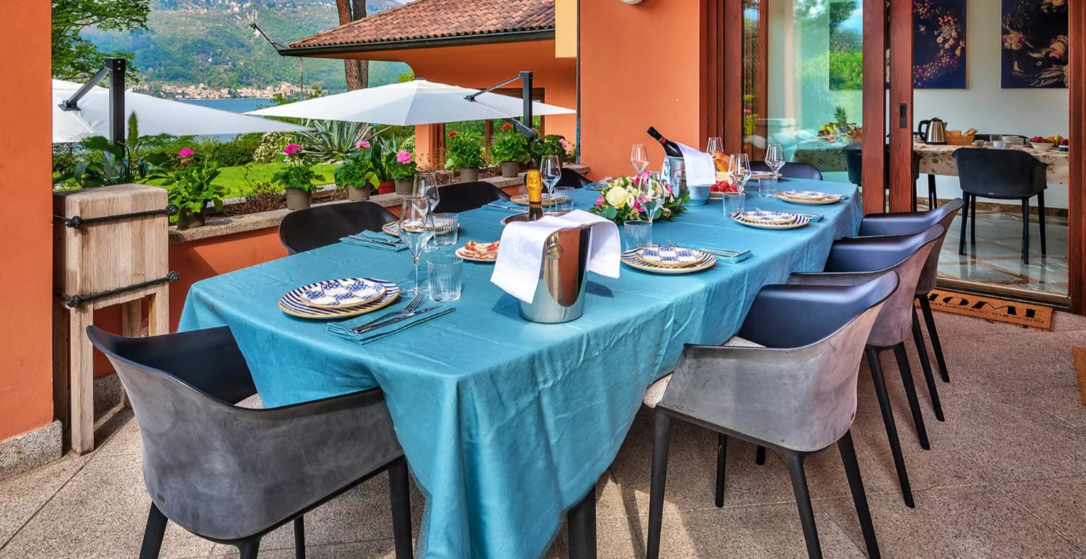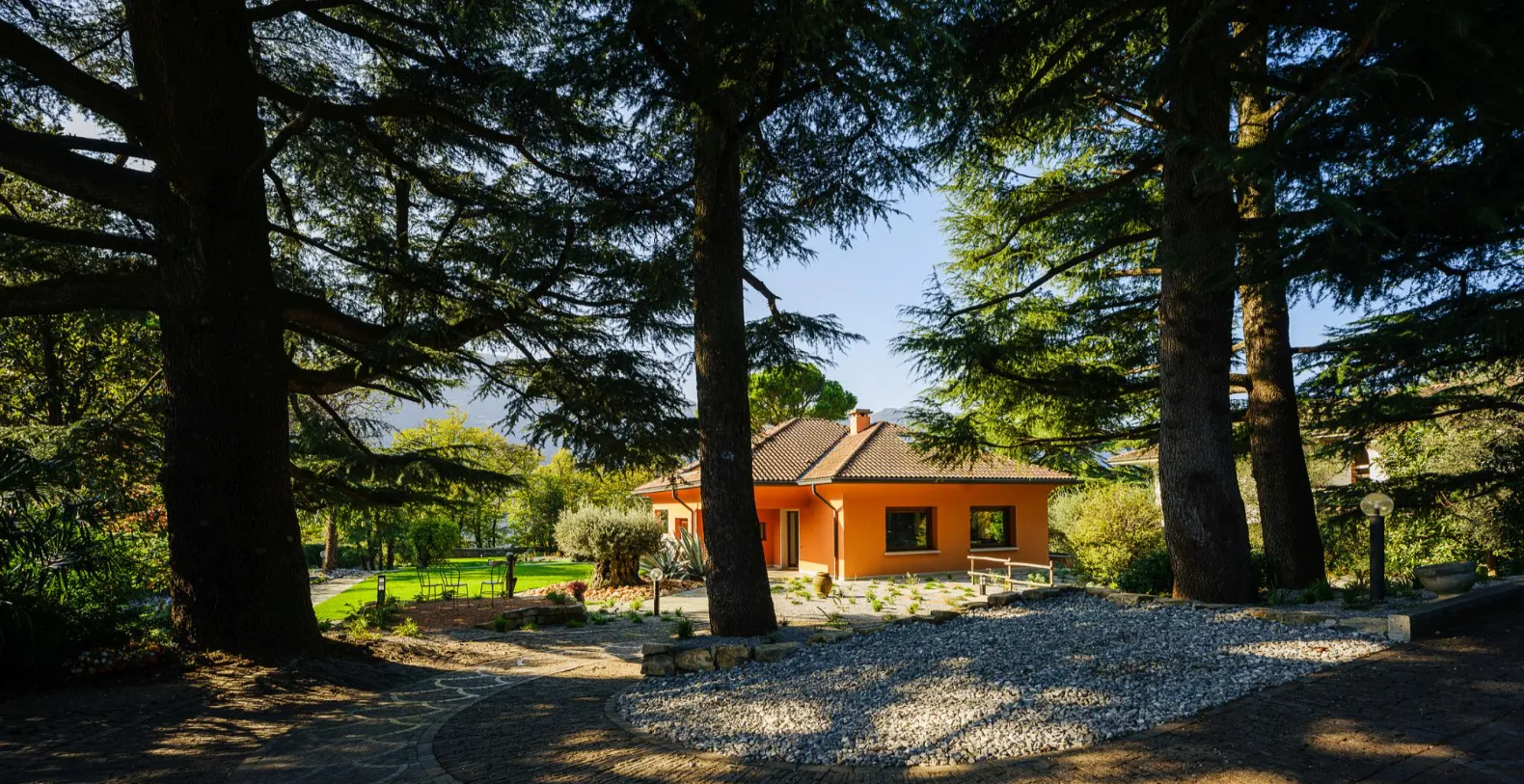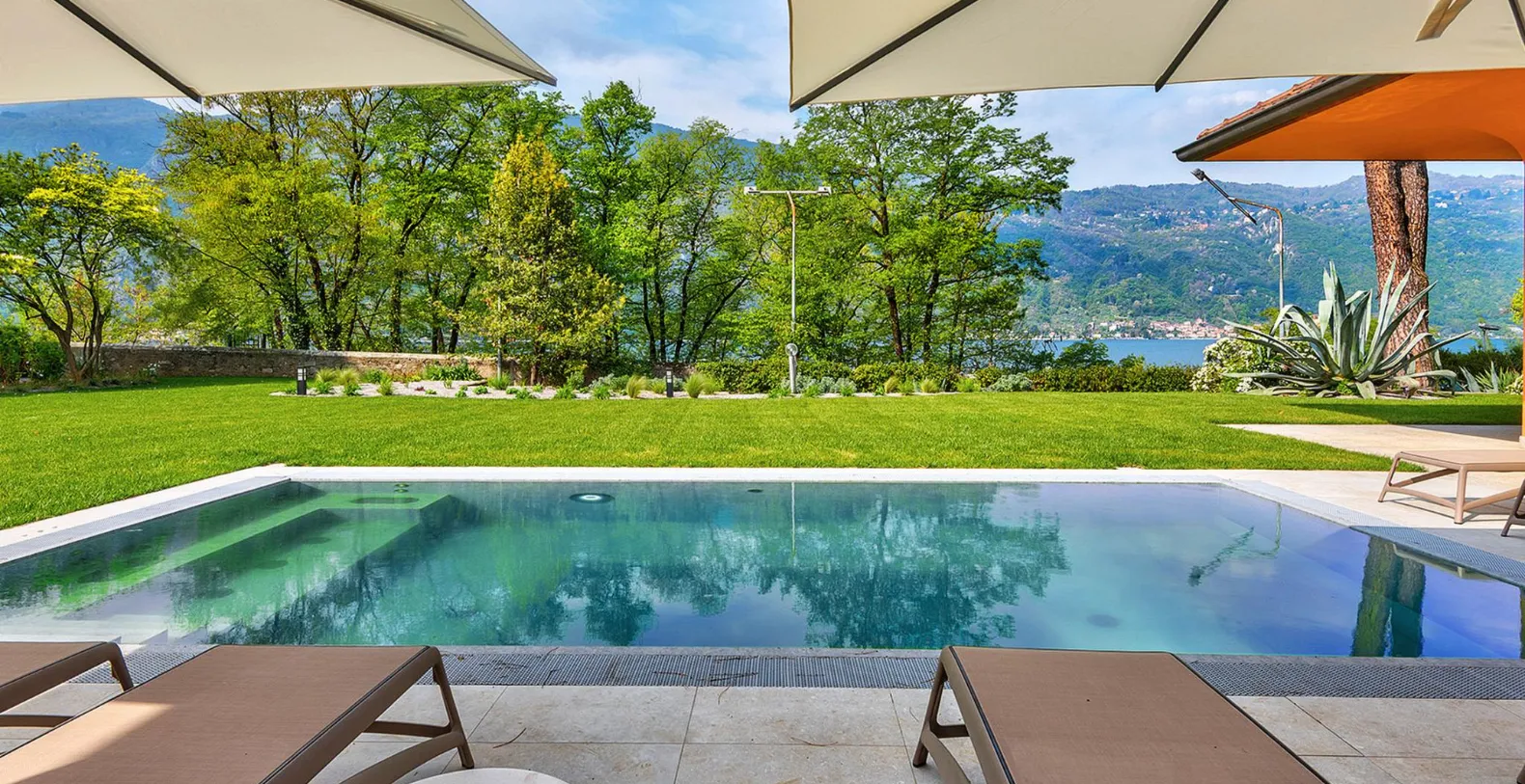 Outdoors, Villa Amanda truly shines. The 2,000 m² landscaped garden has been carefully designed for leisurely days under the Italian sun, with manicured lawns, mature trees providing natural shade, and ample space to relax. A pétanque court adds a charming, playful element for family fun. The covered patio is perfect for al fresco dining, equipped for barbecues and long summer meals enjoyed with lake breezes and sunset light. The swimming pool, featuring hydromassage jets and the option to be heated, is surrounded by a sun deck furnished with loungers and umbrellas, creating a private oasis overlooking the water.