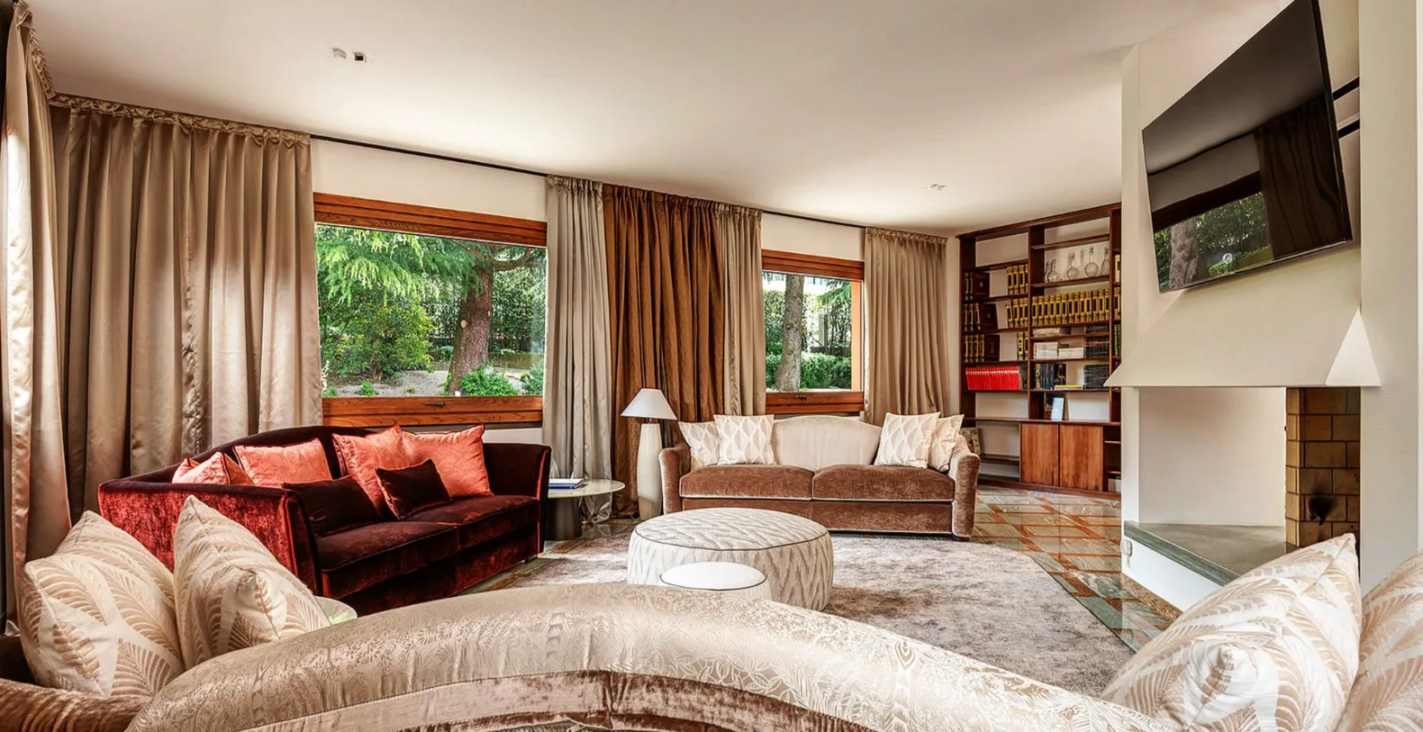 The villa accommodates up to eight guests across four air-conditioned bedrooms, thoughtfully arranged over multiple levels. On the ground floor, guests are welcomed into a spacious living room defined by striking marble floors and a warm, inviting atmosphere. A comfortable sitting area with TV is arranged around a central fireplace, creating a natural gathering point for relaxed evenings. The fully equipped kitchen is designed for both casual meals and more elaborate cooking, whether prepared by guests or a private chef. This level also features a double bedroom with a 190 x 200 cm bed and an ensuite bathroom with a distinctive round bathtub.