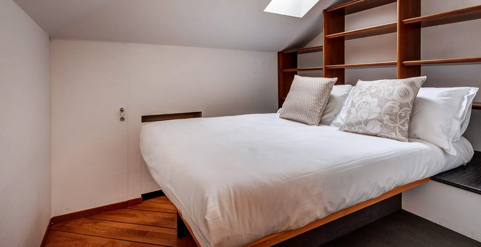 Ascending toward the first floor, a mezzanine level hosts a bedroom with a small double bed (140 cm), suitable for flexible sleeping arrangements. The upper floor continues with two generously sized bedrooms, each designed to maximize comfort and views. One bedroom features a double bed (220 x 200 cm), a private balcony overlooking Lake Como, and access to a bathroom with both tub and shower. The second bedroom also offers a 220 x 200 cm double bed, a lake-view balcony, and an ensuite bathroom complete with shower and private sauna, adding a spa-like touch to the stay.