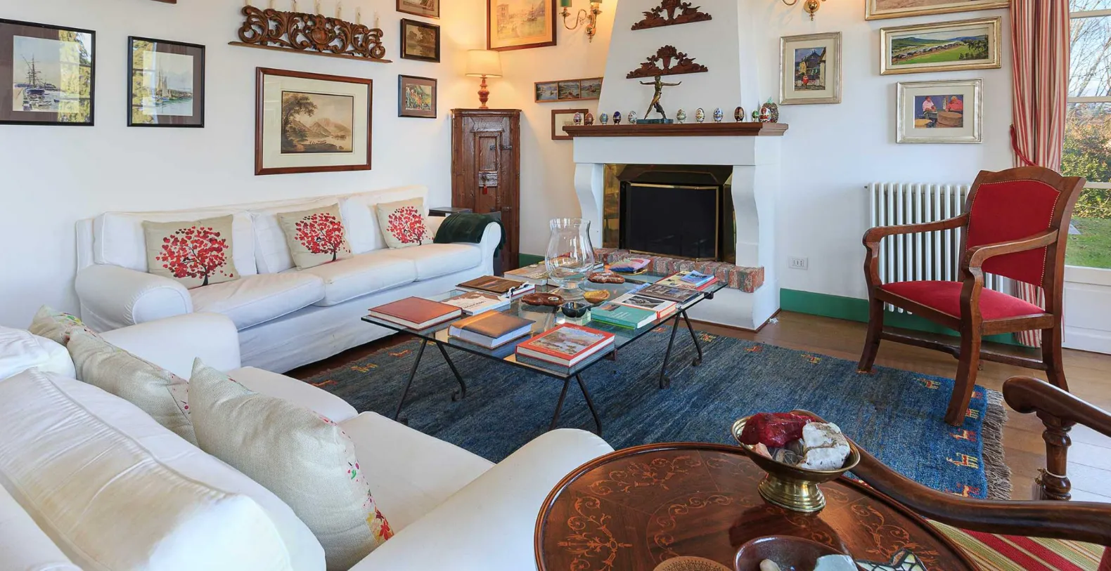 The interiors reflect classic Italian charm, with a warm and inviting living room centered around a fireplace, a formal dining area with a large wooden table, and a fully equipped kitchen that opens directly onto the outdoor patio and garden. A charming conservatory provides a peaceful setting for relaxed breakfasts while overlooking the surrounding greenery.