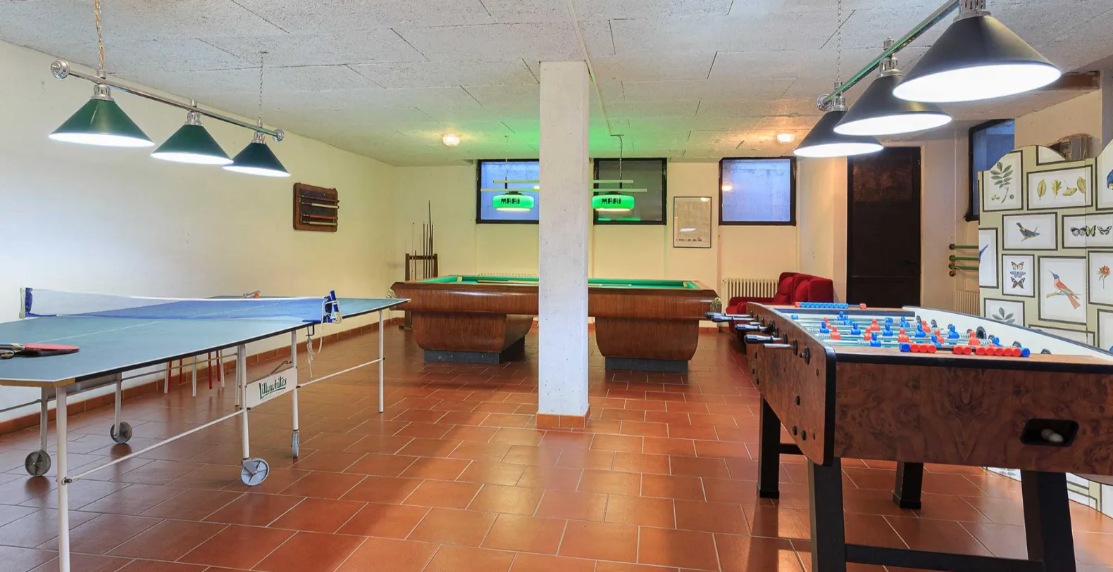 The layout is thoughtfully distributed across multiple levels, ensuring both comfort and independence. The upper floors host elegant bedrooms with private bathrooms and lake-facing windows, while the top-level suite enjoys its own private terrace with panoramic views. On the lower level, a dedicated entertainment area with billiards, table tennis, and foosball creates a relaxed space for evenings and family fun.