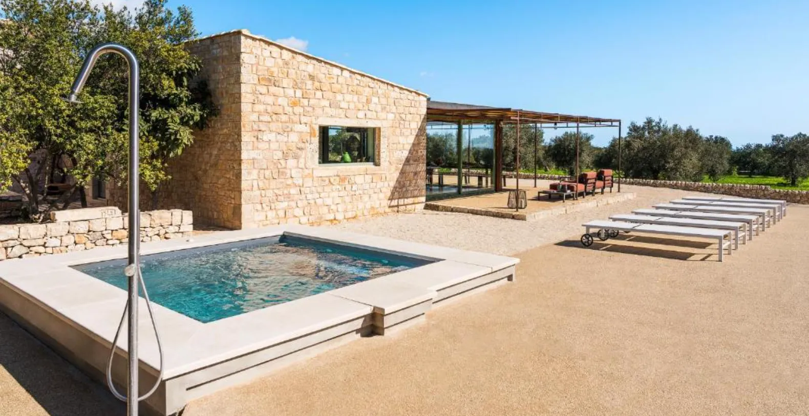 Recently renovated, the villa blends traditional character with modern comforts. Spacious terraces shaded by characteristic pergolas, woven reed panels typical of the region, create inviting outdoor living spaces where guests can relax in the shade, enjoy leisurely breakfasts, or dine outdoors while taking in the surrounding countryside. The private swimming pool and hot tub are perfectly positioned for long, sun-filled days, complemented by an outdoor shower and generous lounging areas.