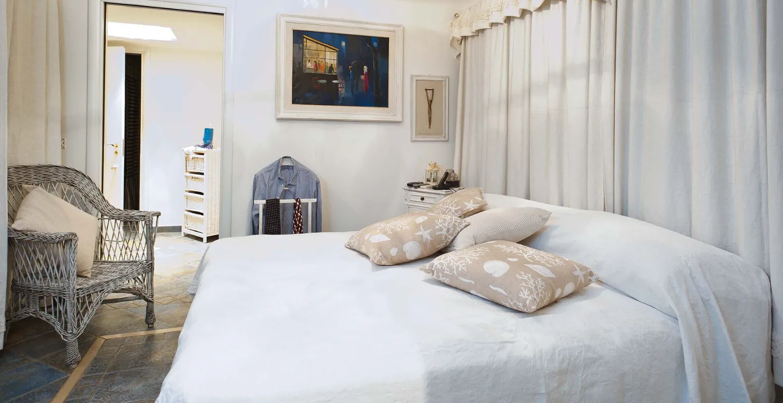 Inside, the villa is arranged over two main levels and offers ample space and privacy for all guests. On the ground floor, guests will find a comfortable living room with an open fireplace, ideal for cooler evenings, along with a dining area featuring large glass windows that flood the space with natural light and frame views of the garden and sea. The fully equipped kitchen is designed for easy self-catering and shared meals. This level also includes two bedrooms and two bathrooms, making it ideal for guests who prefer ground-floor accommodation. The first-floor hosts five cozy and tastefully furnished bedrooms, each with its own en-suite bathroom. These rooms offer privacy and comfort, many with access to terraces or sea views, ensuring every guest enjoys a peaceful retreat after a day by the sea or exploring the island. A discreet, separate apartment in the basement of the villa is occupied by a housekeeper, who provides daily tidying-up service while respecting guests’ privacy, ensuring the villa remains immaculate throughout the stay.