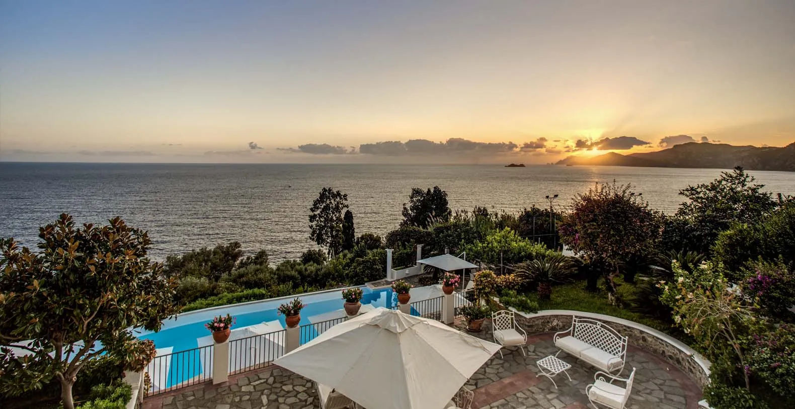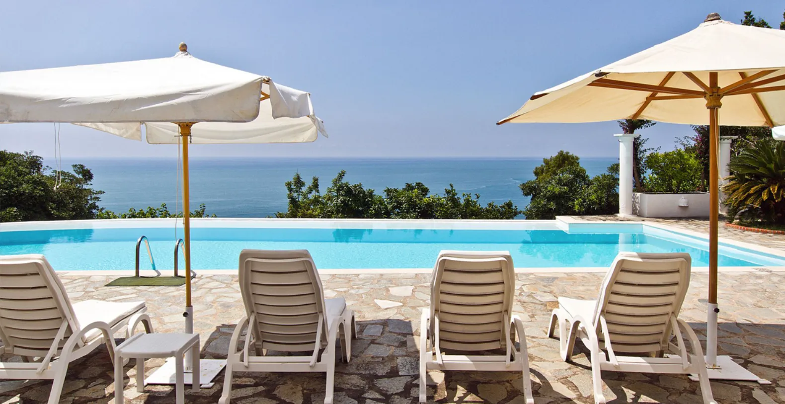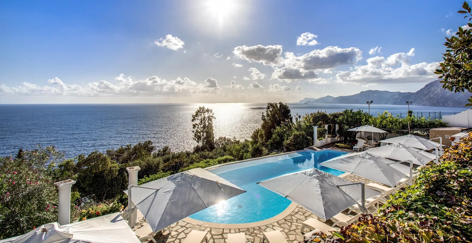 The entrance is only few steps from the main road (67). A beautiful white staircase brings you inside the property. You’ll access a large terrace with lemon trees and take in a first impressive panoramic view of the coast. The terrace is equipped with chairs, a stone barbecue and a pizza oven at the guest’s disposal. Lunch and dinner can be taken overlooking the incredible vista of the Amalfi Coast, in the next terrace adjacent to the main living room. A staircase leads to a second terrace where you can find another set of table and chairs and a beautiful bed of roses. The same staircase leads to the amazing private pool (18 x 5 mt) set on a large terrace paved with natural stone and lined with white columns. There is also a shower, toilet and a mini-bar at this level. The pool can be heated on request and at an additional cost. From the pool terrace there are incredible views of the sea, the coast and the islands of Li Galli.