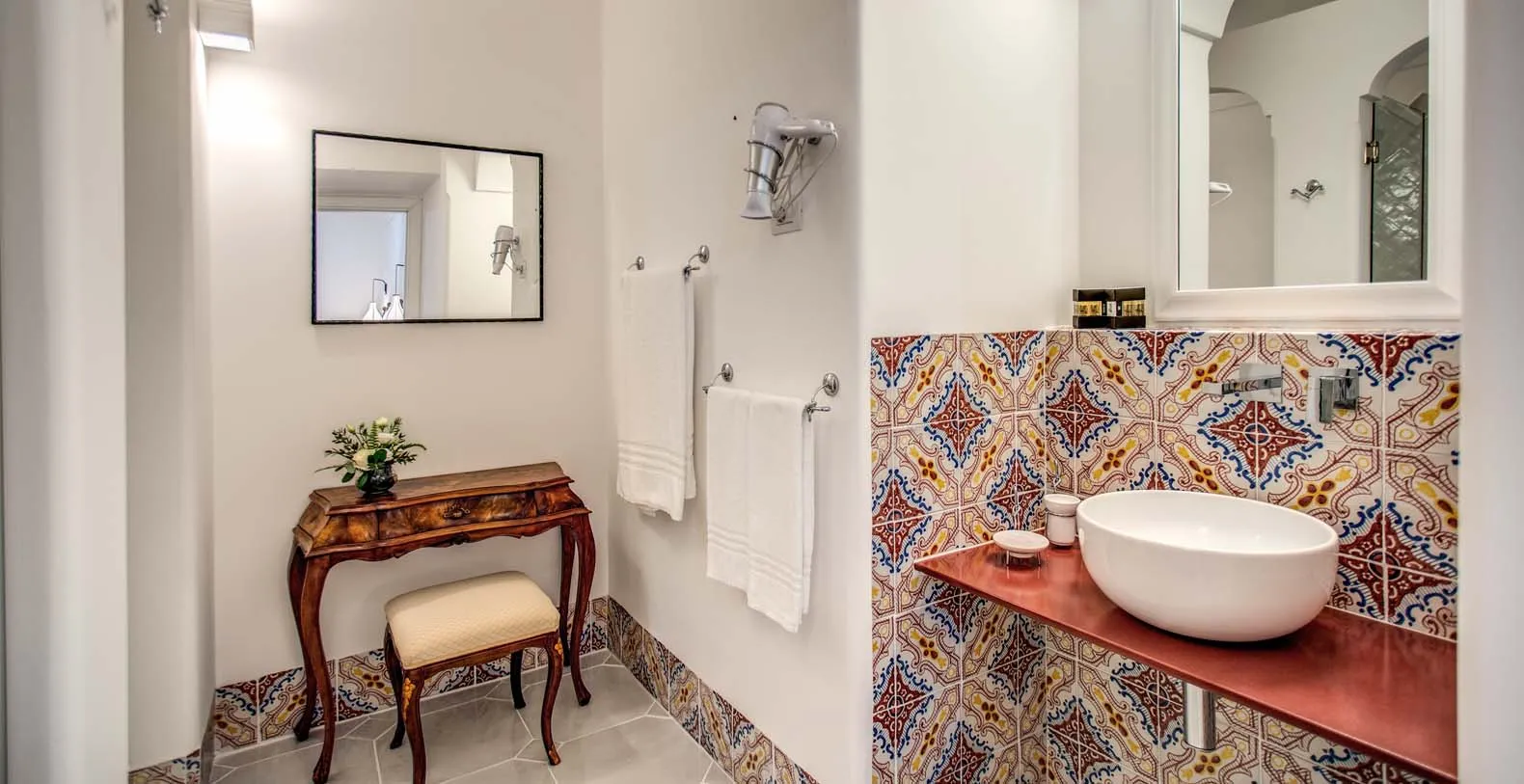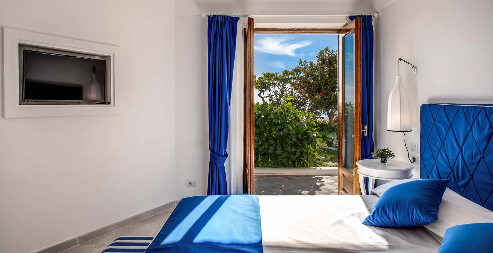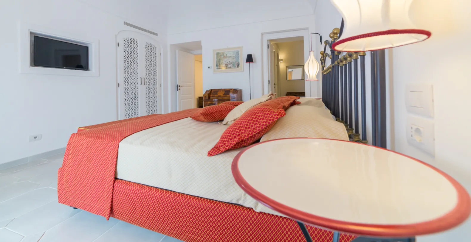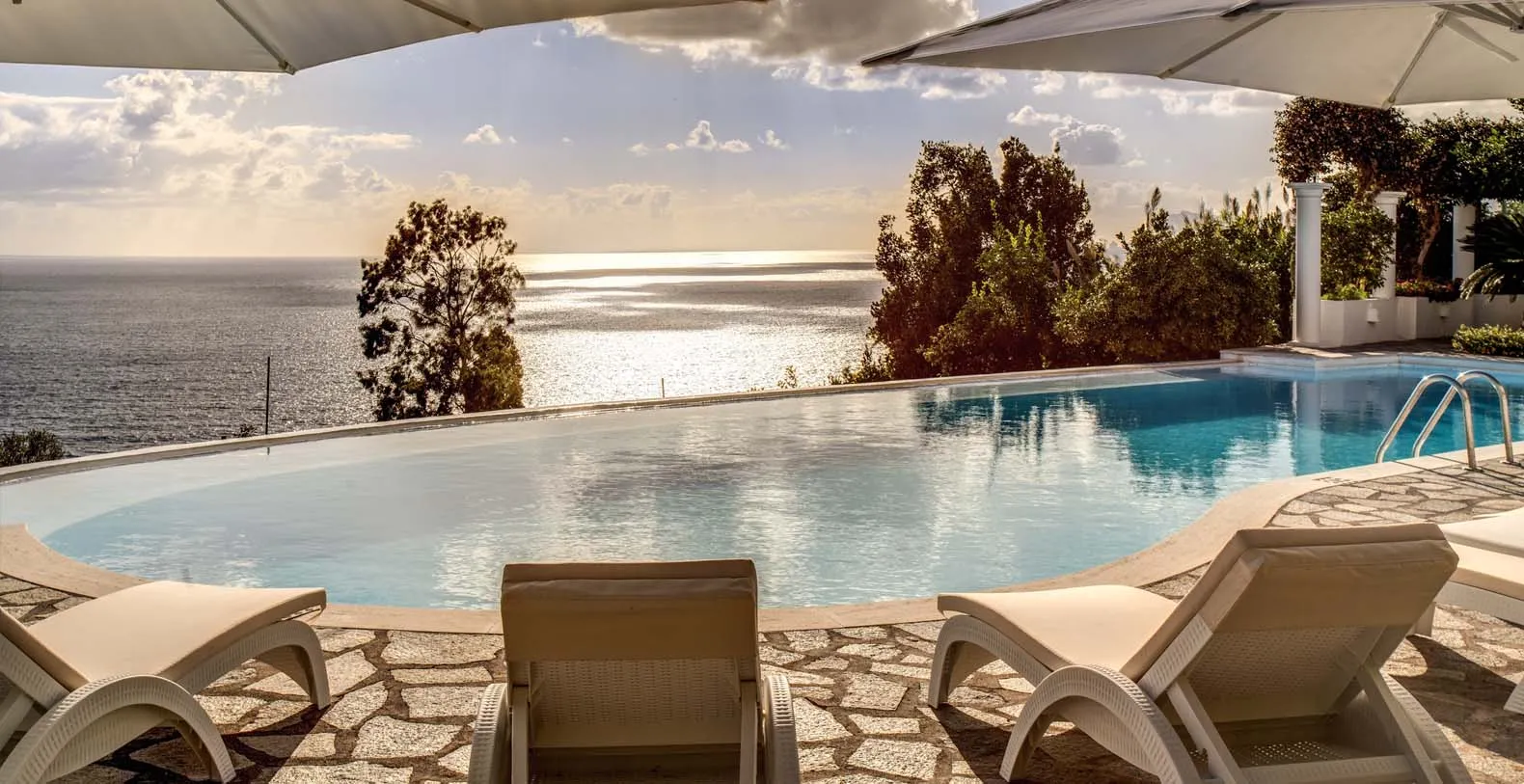 The entrance is only few steps from the main road (67). A beautiful white staircase brings you inside the property. You’ll access a large terrace with lemon trees and take in a first impressive panoramic view of the coast. The terrace is equipped with chairs, a stone barbecue and a pizza oven at the guest’s disposal. Lunch and dinner can be taken overlooking the incredible vista of the Amalfi Coast, in the next terrace adjacent to the main living room. A staircase leads to a second terrace where you can find another set of table and chairs and a beautiful bed of roses. The same staircase leads to the amazing private pool (18 x 5 mt) set on a large terrace paved with natural stone and lined with white columns. There is also a shower, toilet and a mini-bar at this level. The pool can be heated on request and at an additional cost. From the pool terrace there are incredible views of the sea, the coast and the islands of Li Galli.